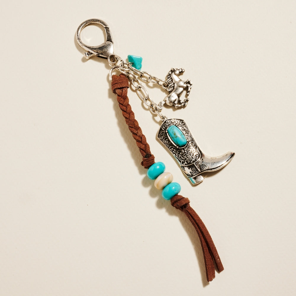 Show off your Western spirit with this braided cowgirl boot keychain. Detailed with semi-precious stones and rustic texture, it adds a charming boho accent to any bag.