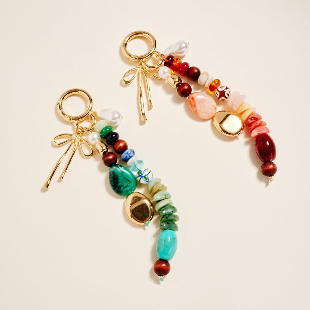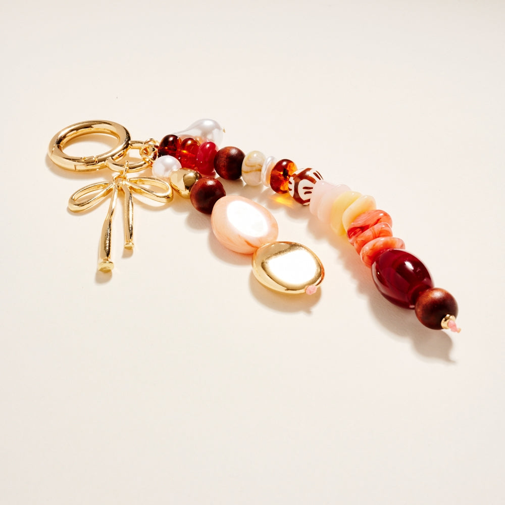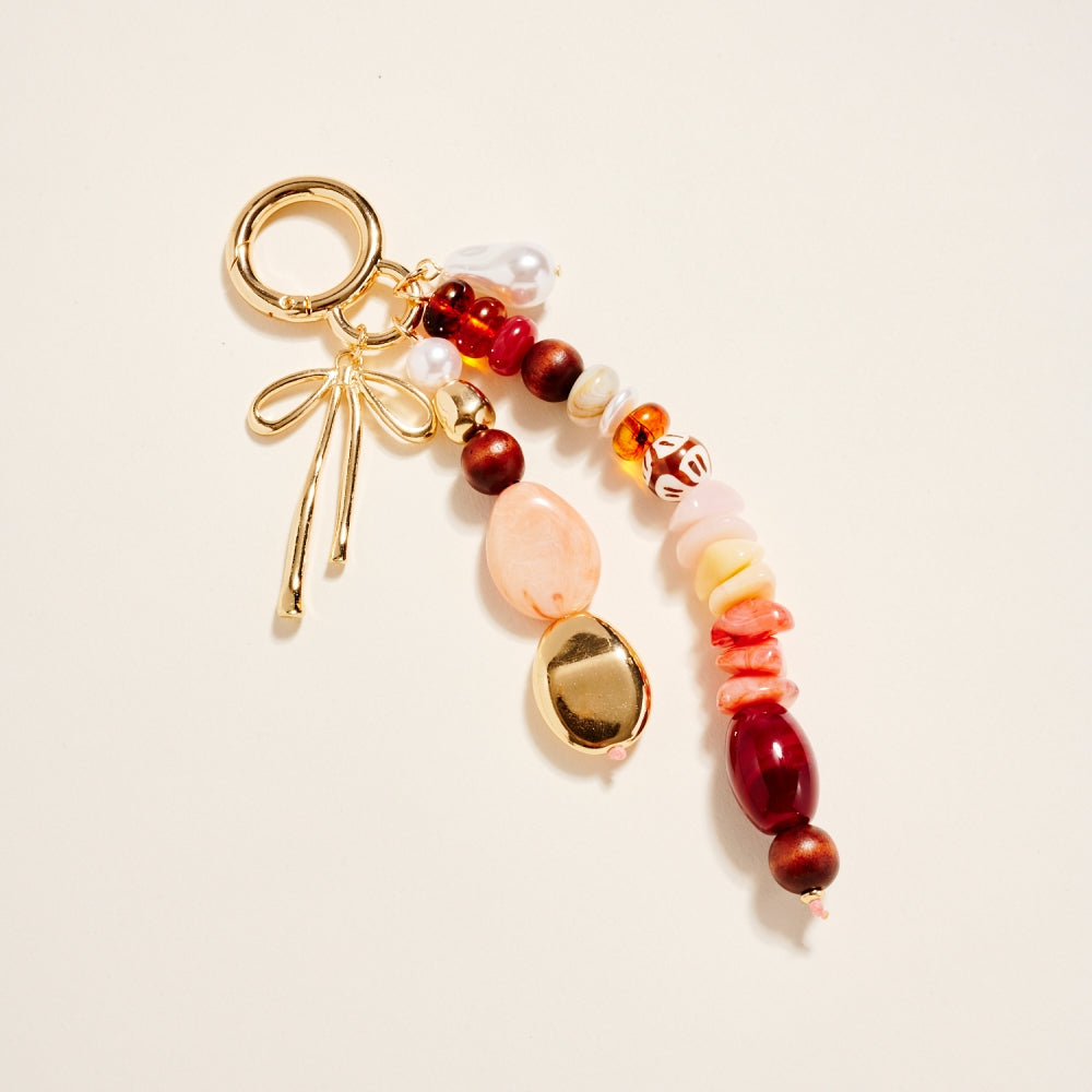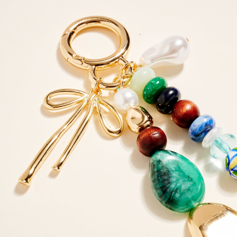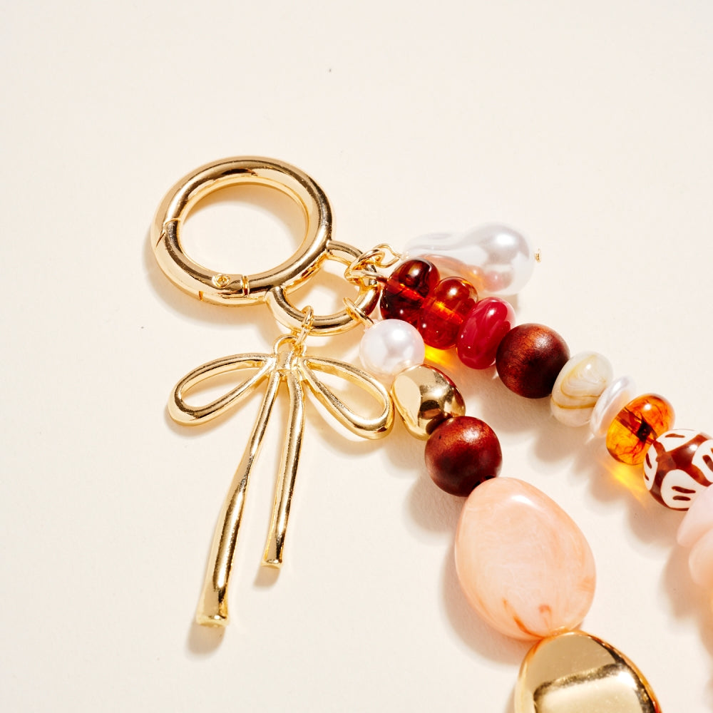 This key ring combines mixed beads in different finishes and hues with a metal bow charm for a standout design. The layered look adds personality while remaining lightweight. Perfect for decorating keys, totes, or backpacks.