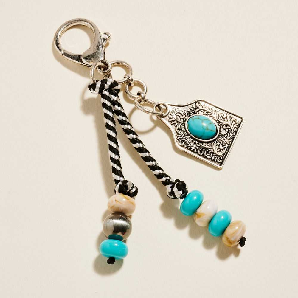 Featuring a cow tag pendant with mixed beads, this semi-precious keychain adds a handcrafted feel and Southwestern energy to your favorite handbag or tot