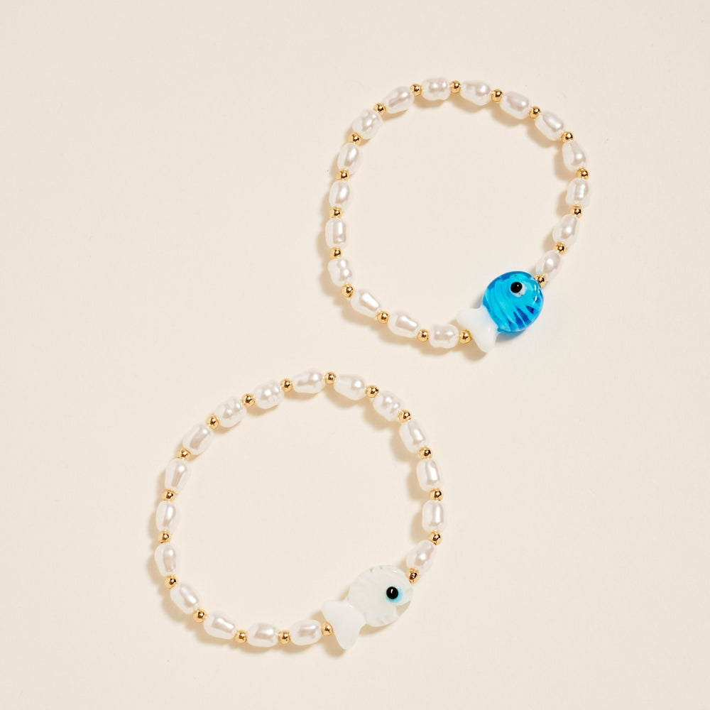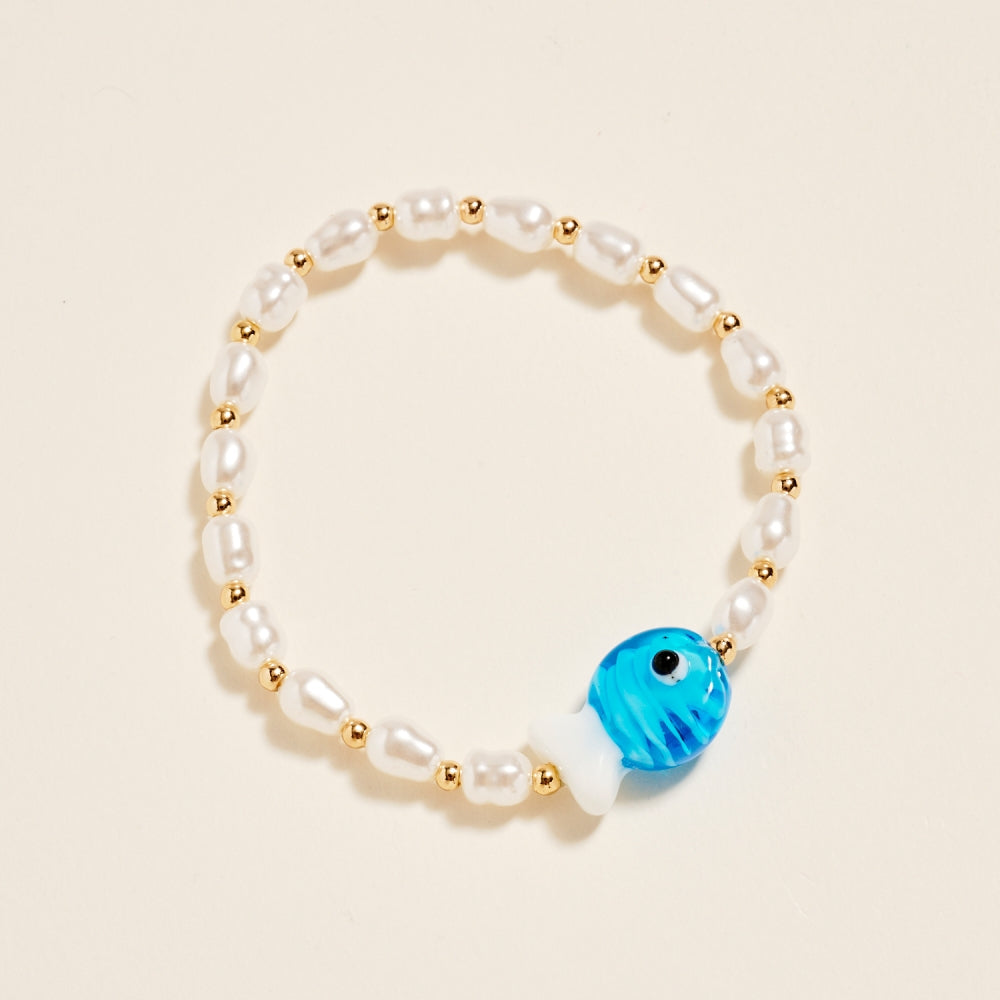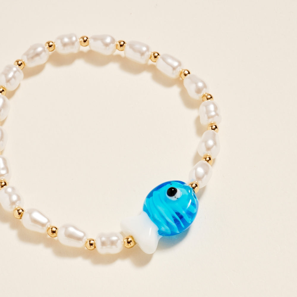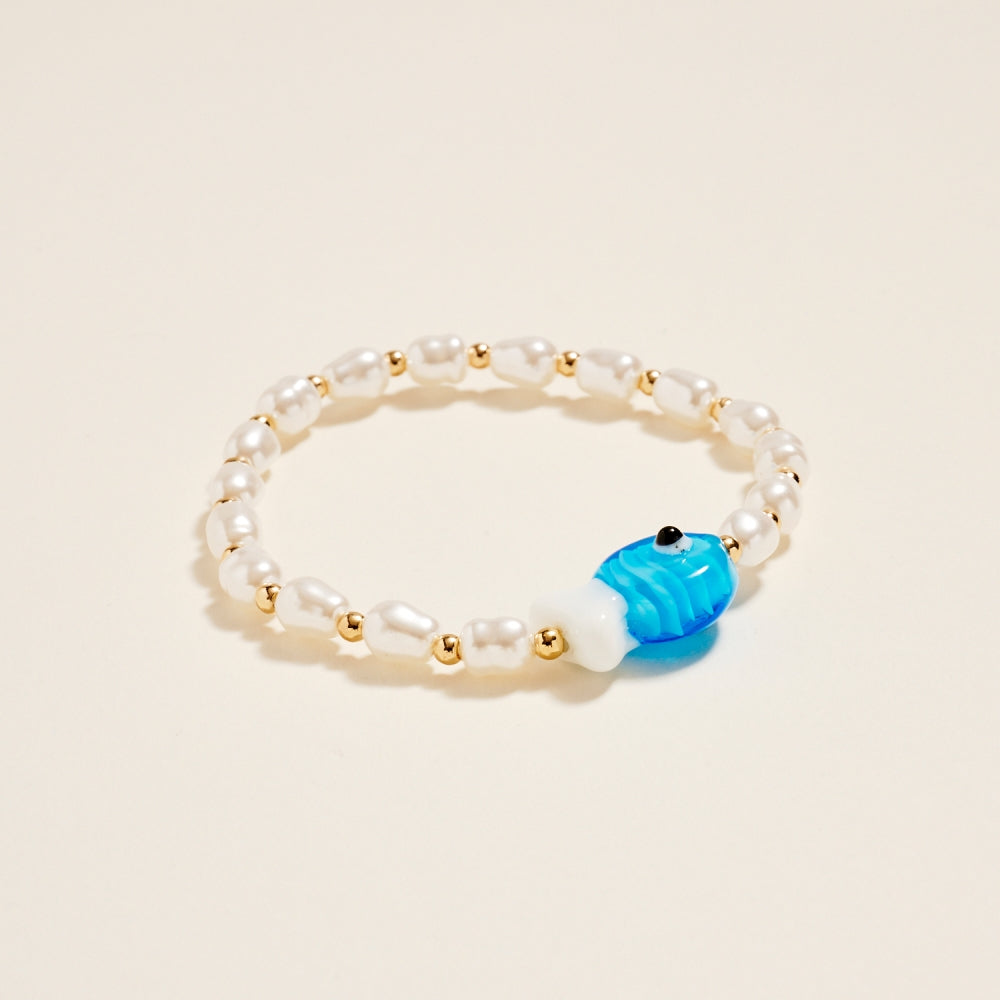 A row of pearl beads is accented with small gold spacers, creating a simple yet elevated look. The glass fish pendant adds movement and a touch of handcrafted charm. A versatile bracelet that works well for casual outfits, vacation styling, or gifting.