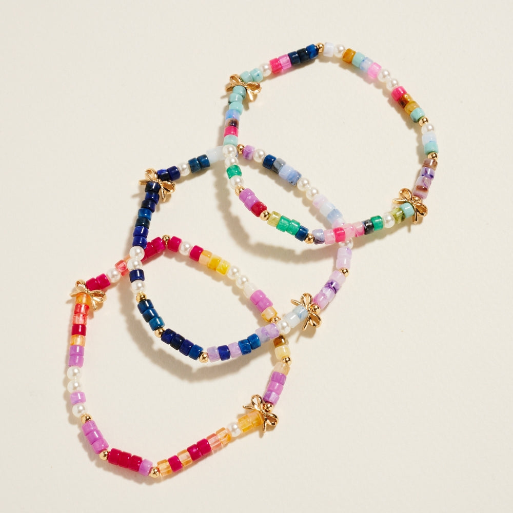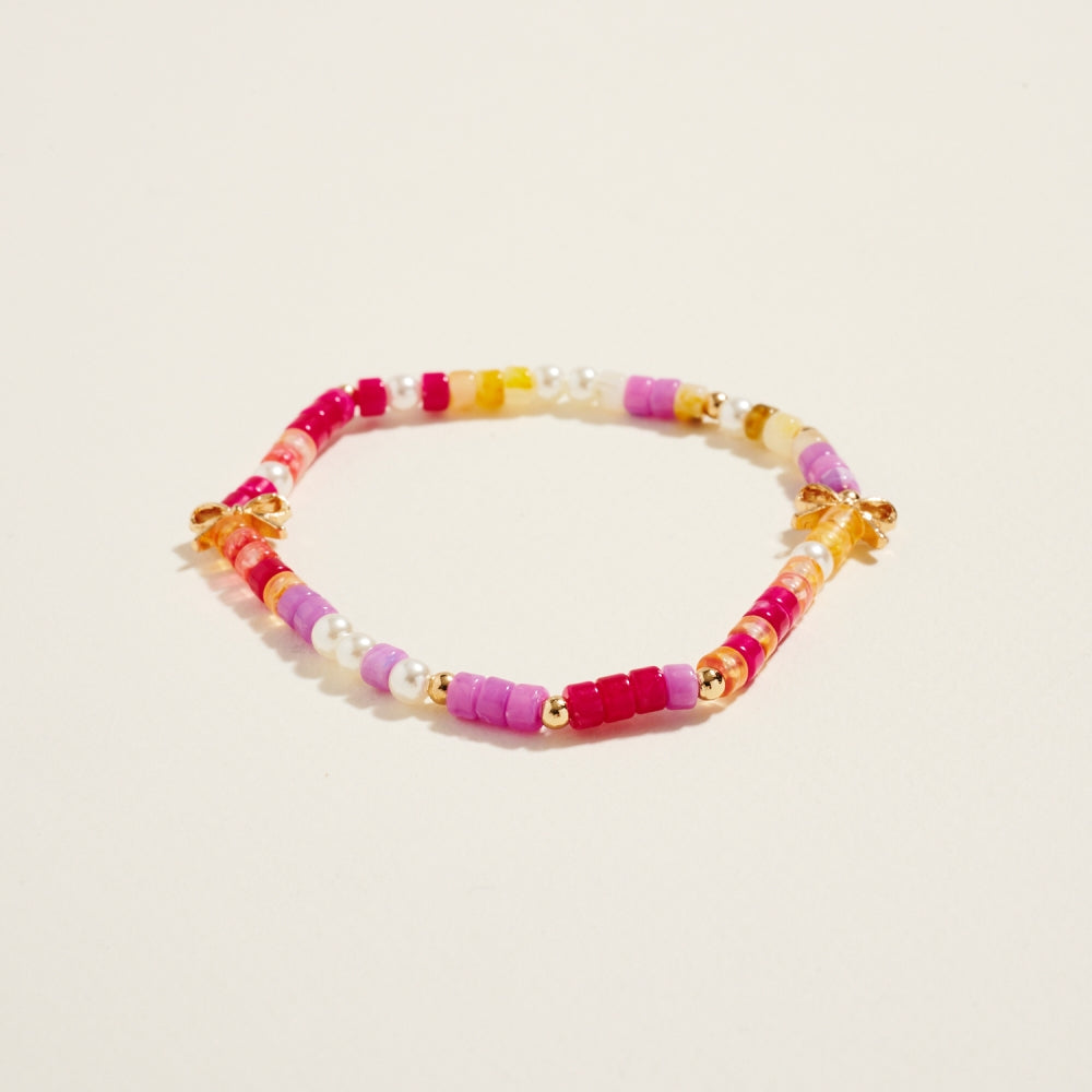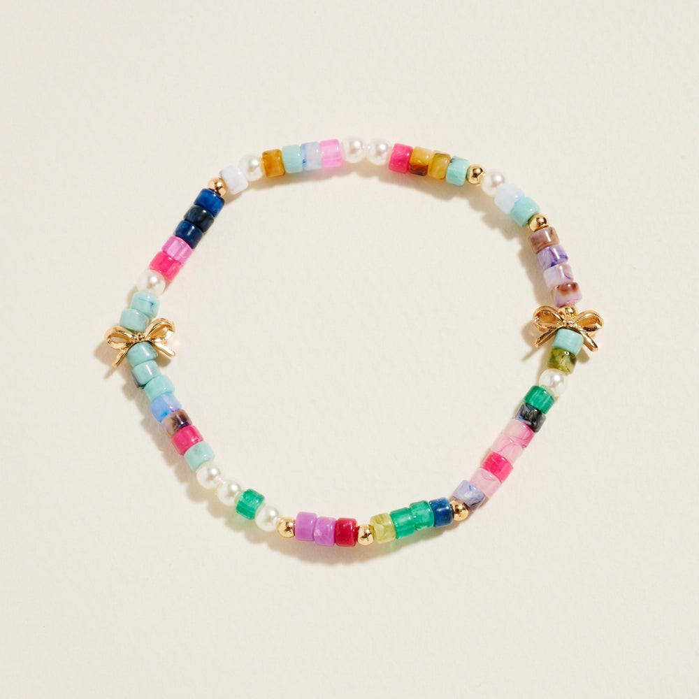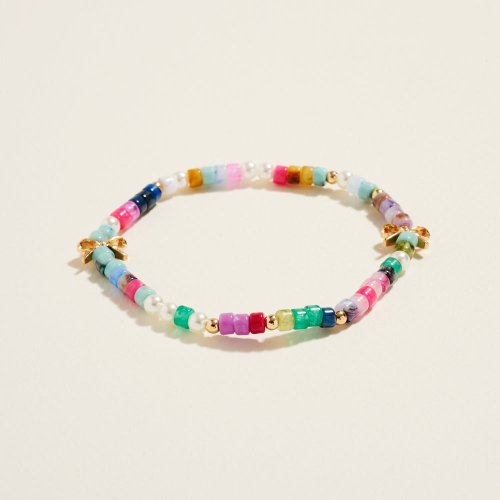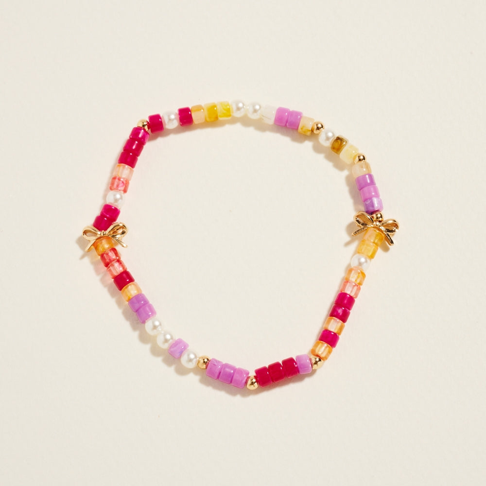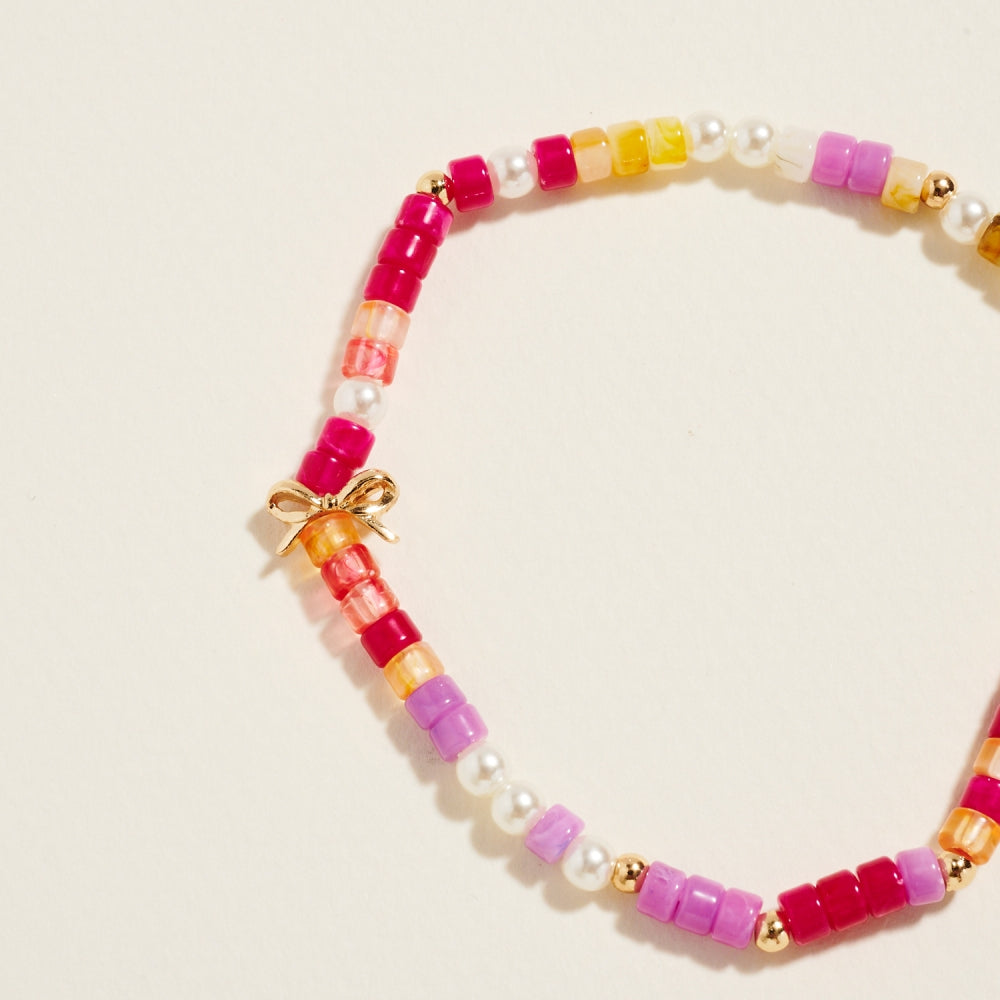 Lightweight resin beads and glossy pearls deliver texture and shine in one easy stretch bracelet. Finished with a cute bow charms, this stretch bracelet adds a feminine touch to any stack.