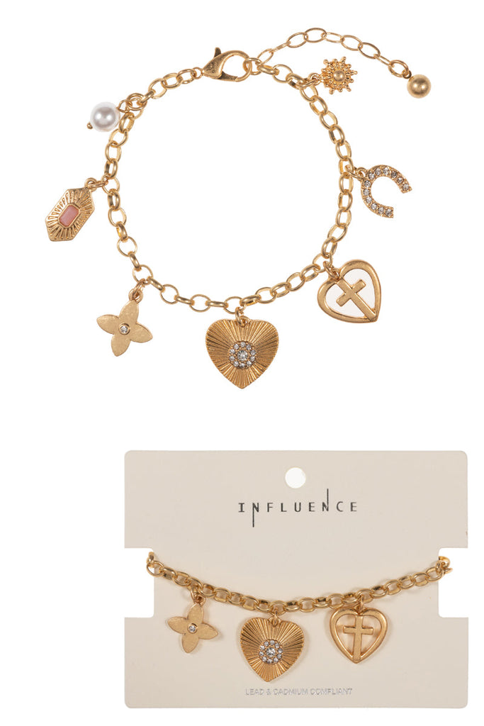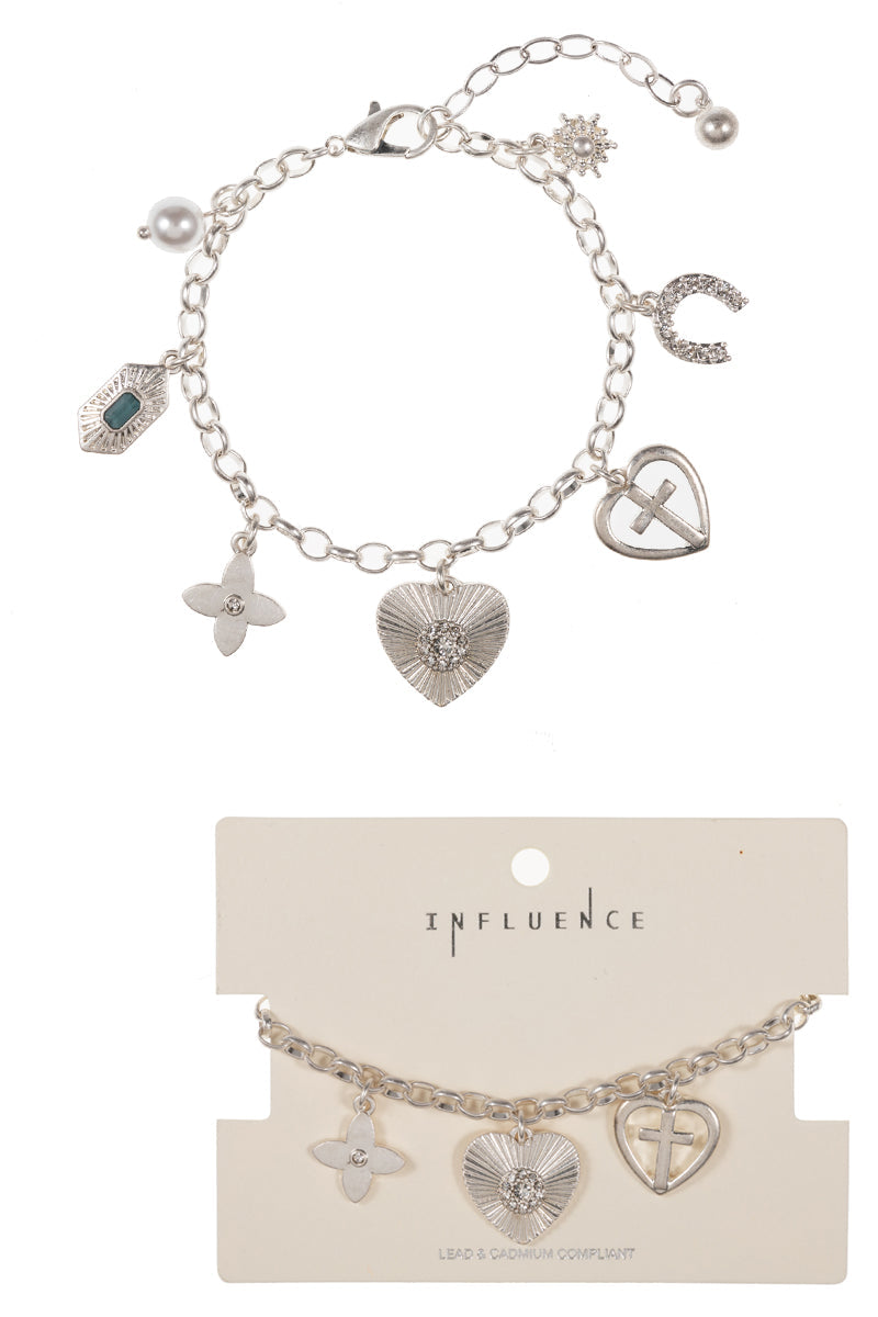 This 7.25 inch charm bracelet features a variety of heart, flower, cross, and horseshoe shaped metal charms on a secure clasp. Perfect for any occasion, this bracelet adds a touch of charm and personality to any outfit. Crafted with quality materials, it offers both durability and style.