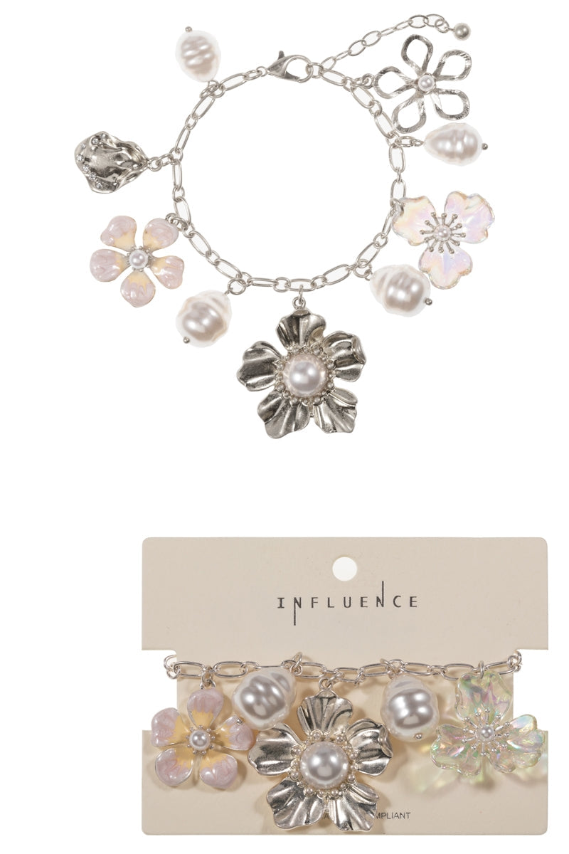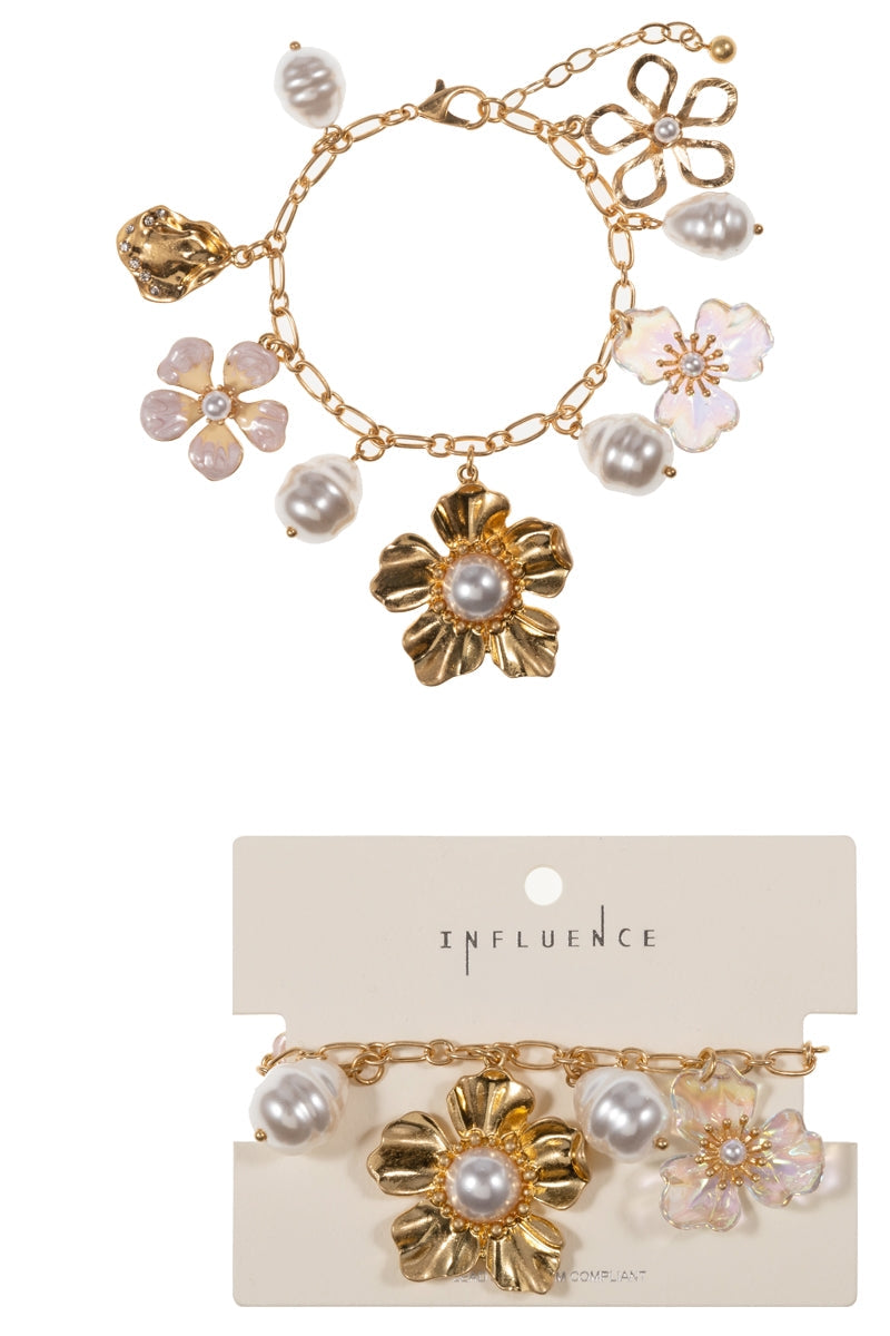 Flower Metal Pearl Charm Cluster Clasp Bracelet