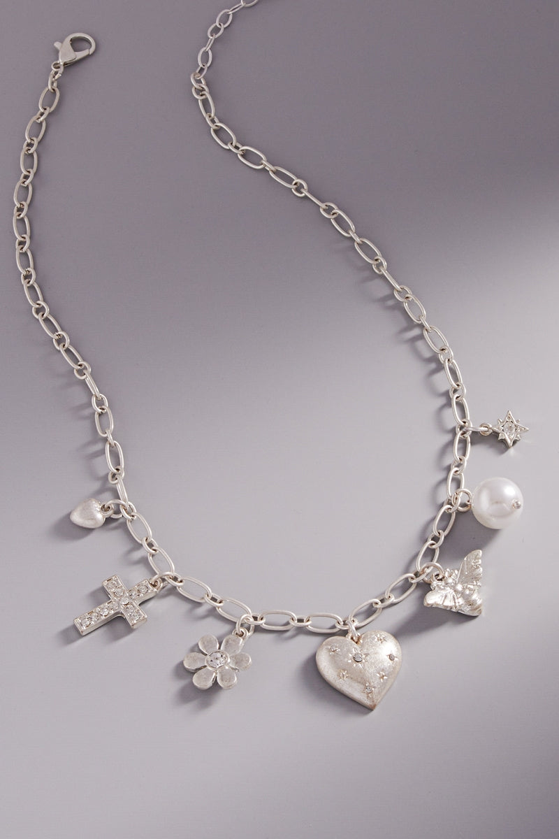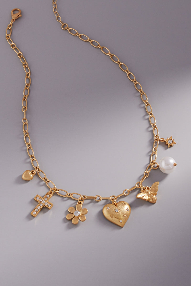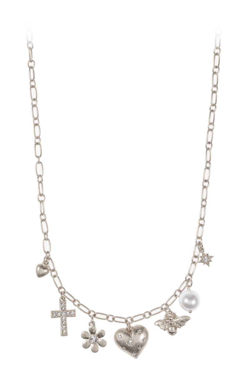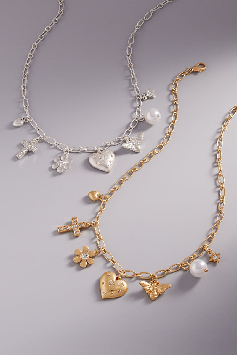 Expertly crafted with a mix of charms, this 16-inch necklace is perfect for adding a touch of glamour to any outfit. The heart, bee, flower, and cross-shaped metal charms all bring unique and stylish elements to this short necklace. A must-have accessory for any jewelry lover.