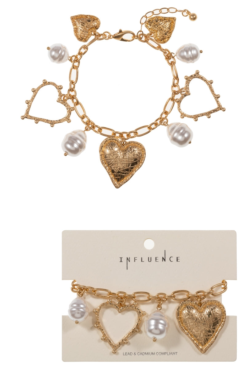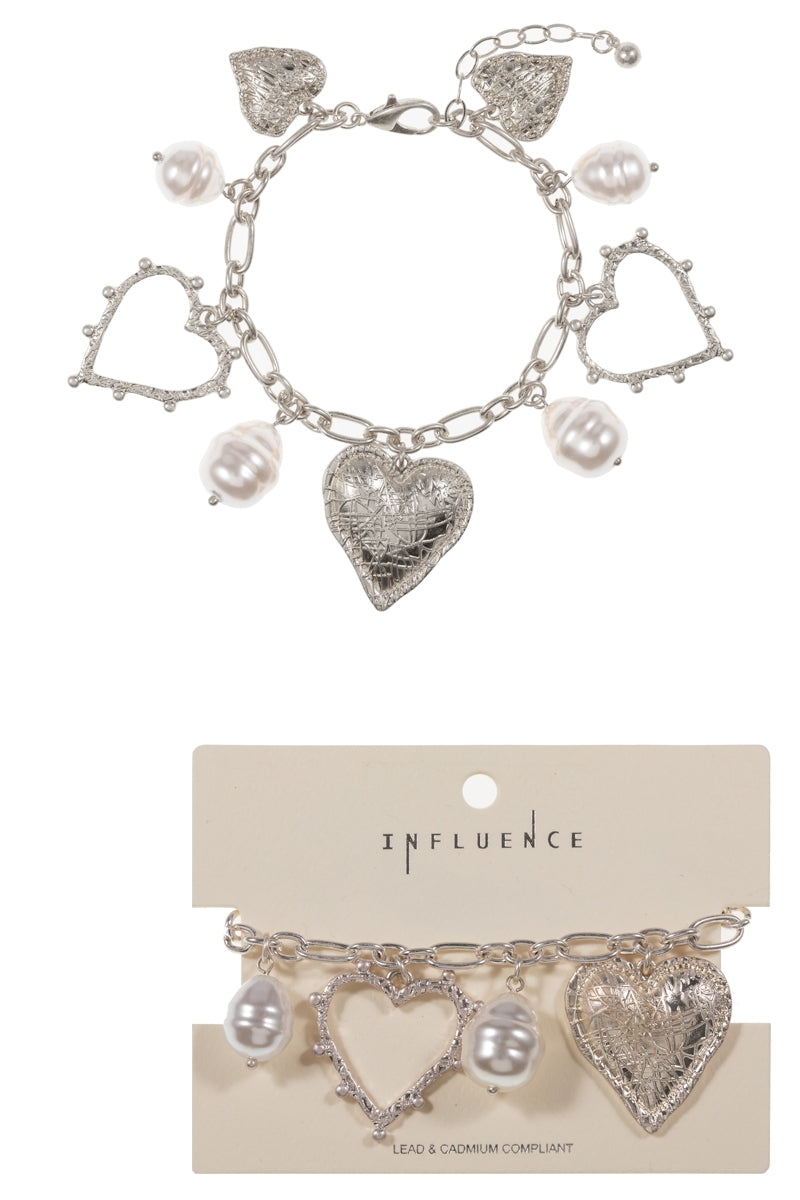 Heart Metal Pearl Charm Cluster Clasp Bracelet