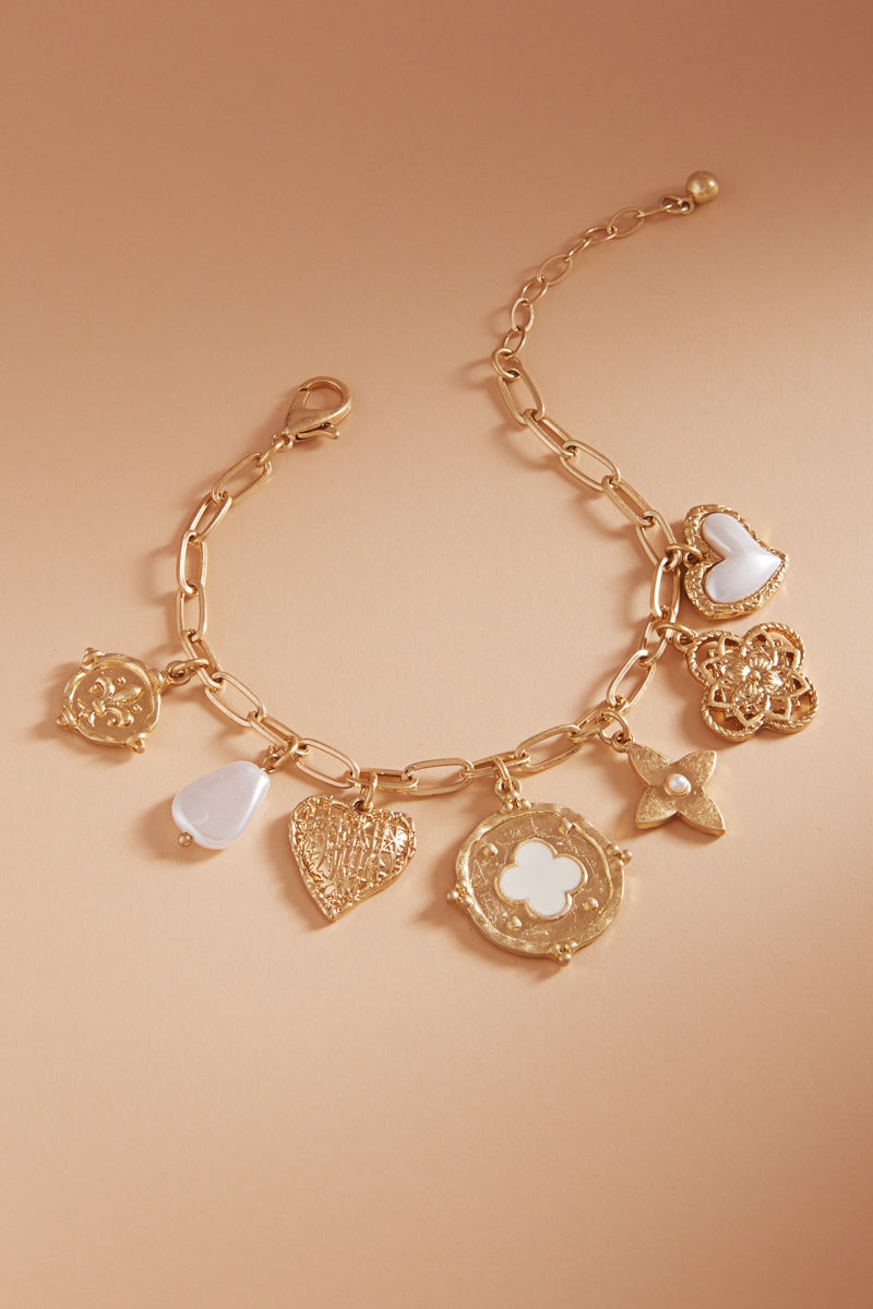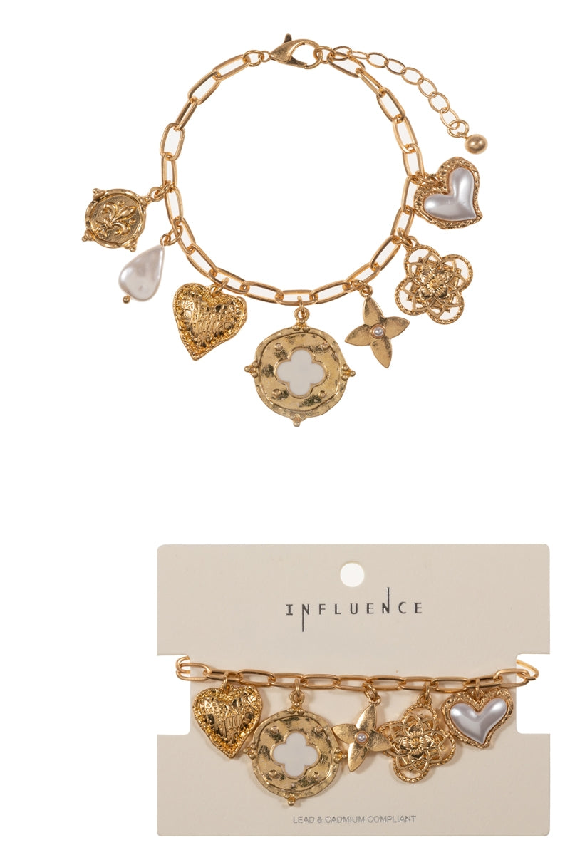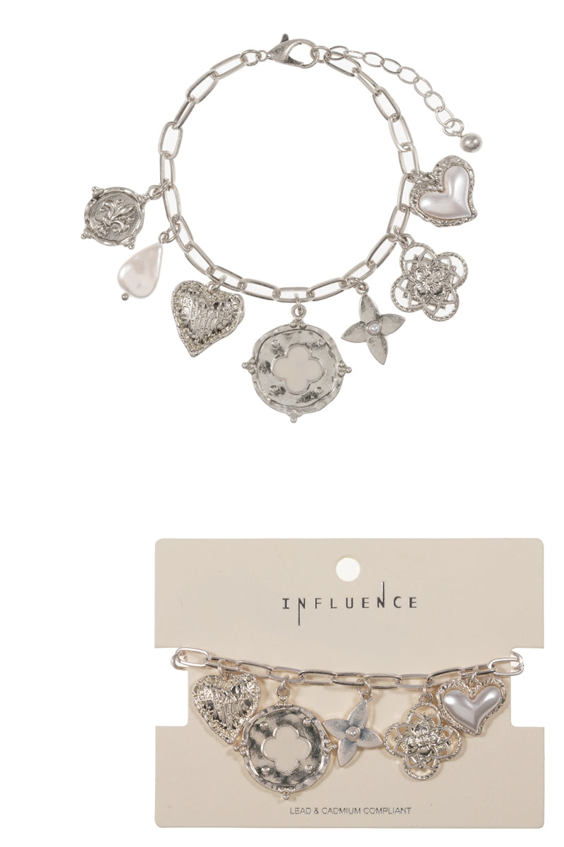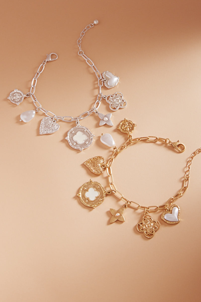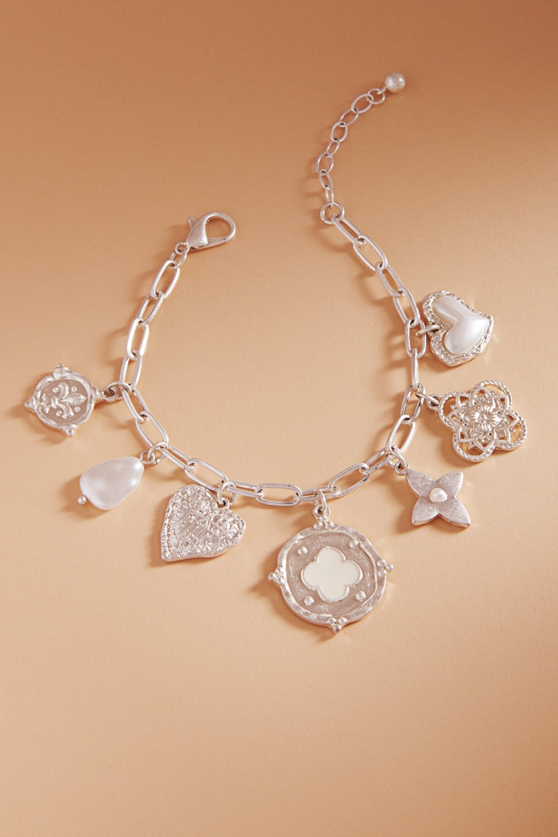 Multi Metal Charm Pearl Cluster Clasp Bracelet
