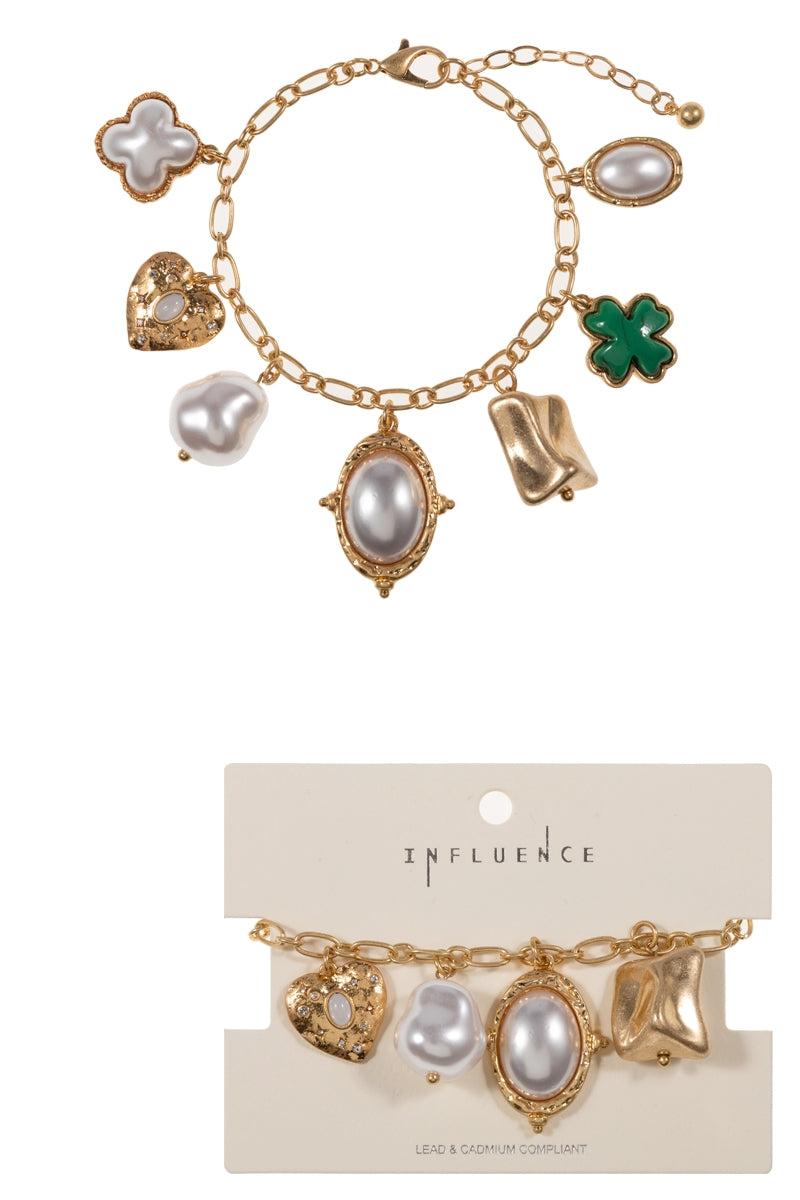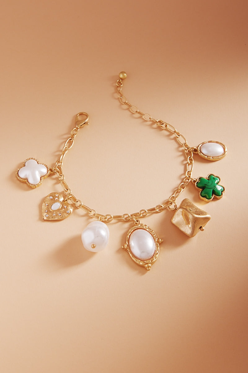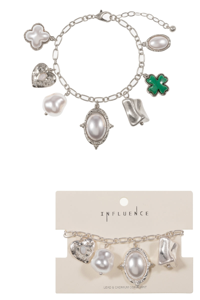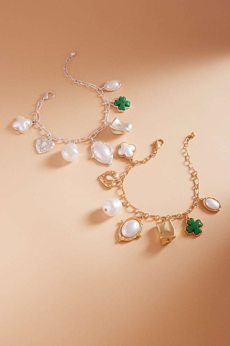 Multi Metal Pearl Charm Cluster Clasp Bracelet