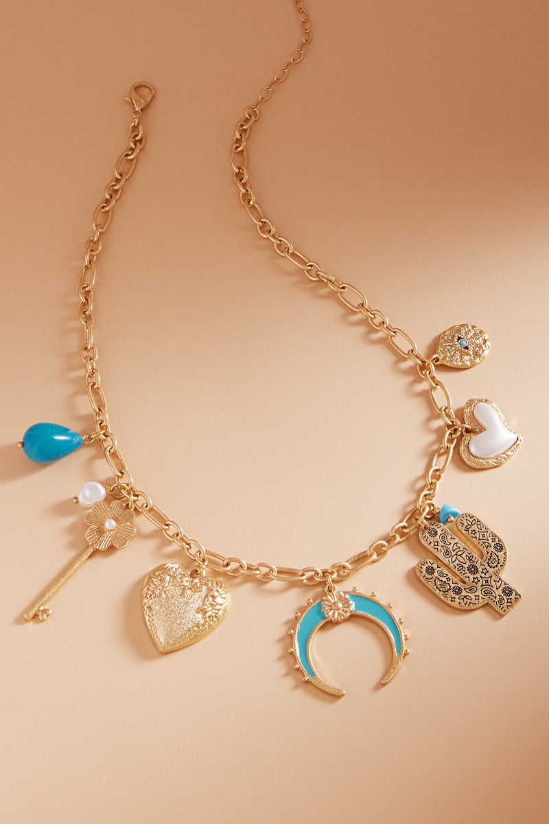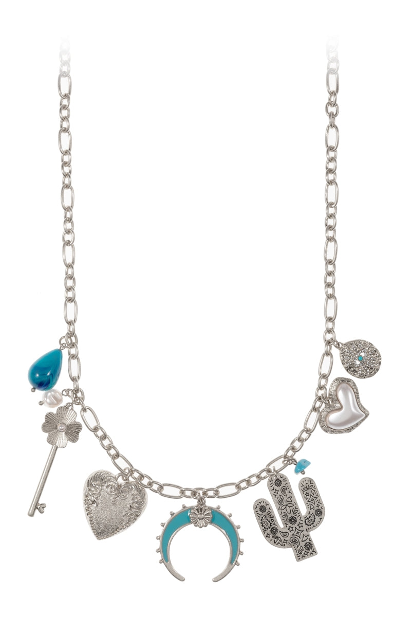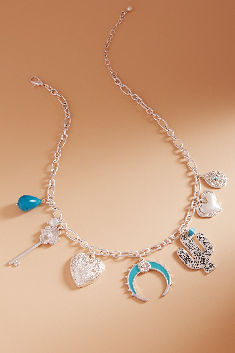 Add a touch of western charm to your outfit with this 17-inch necklace featuring a metal charm with a turquoise charm cluster. The perfect accessory for any occasion, this necklace is both stylish and versatile, giving you the opportunity to showcase your unique sense of style.
