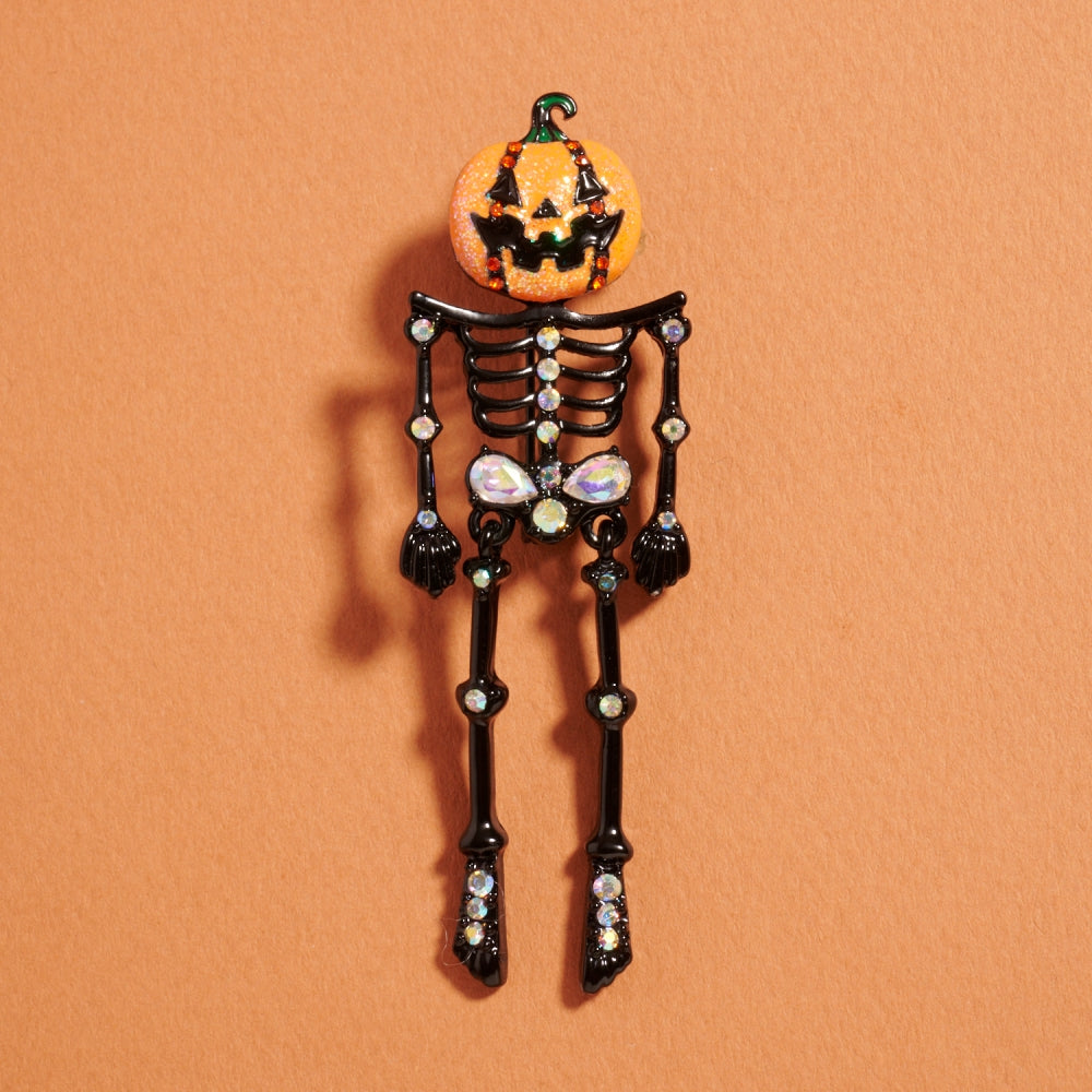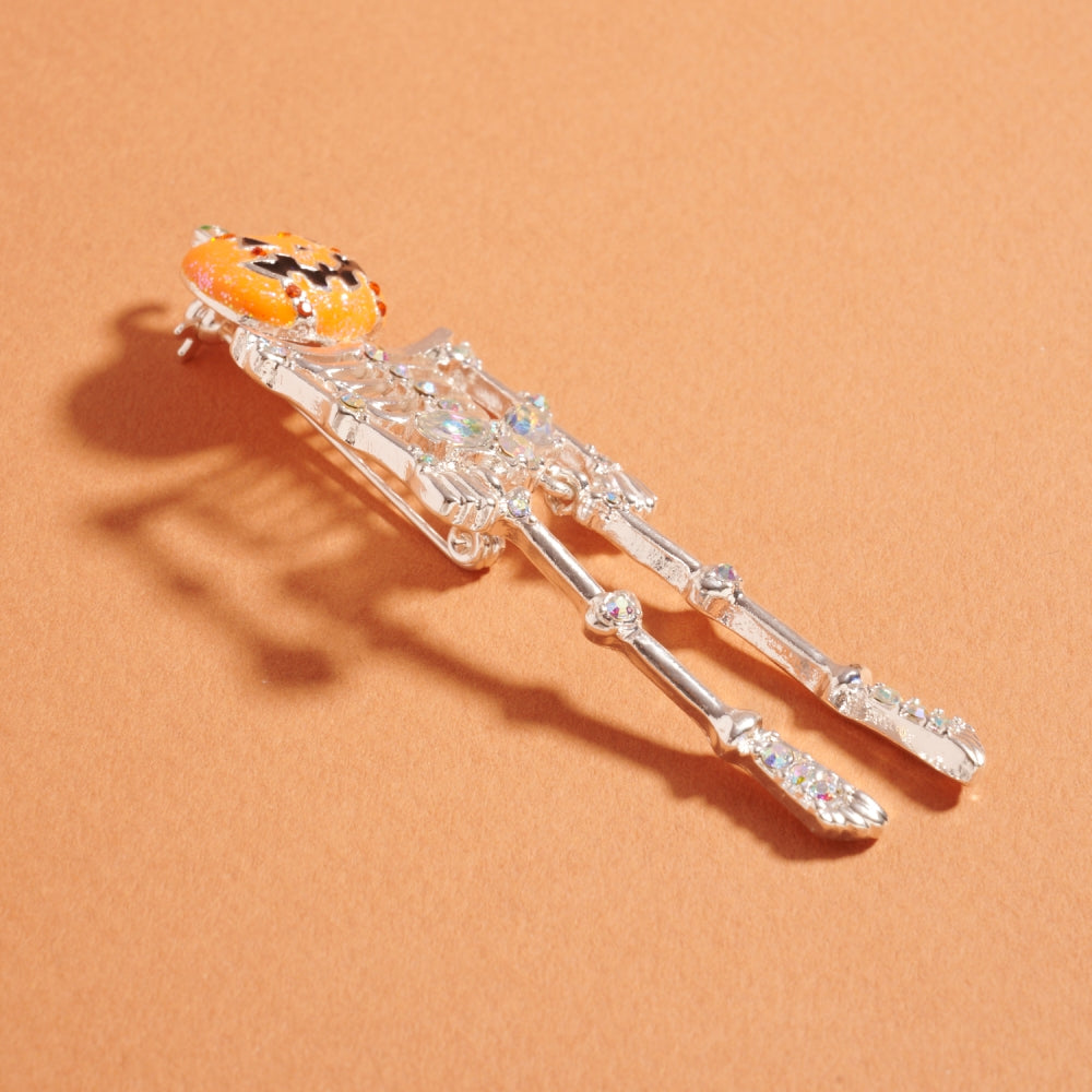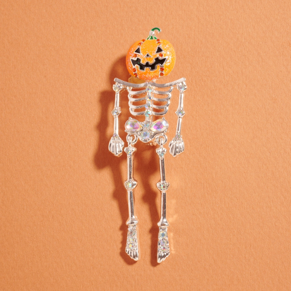 Add spooky charm to your outfit with this skeleton brooch featuring a pumpkin head and sparkling rhinestones. Perfect for Halloween and fall styling.