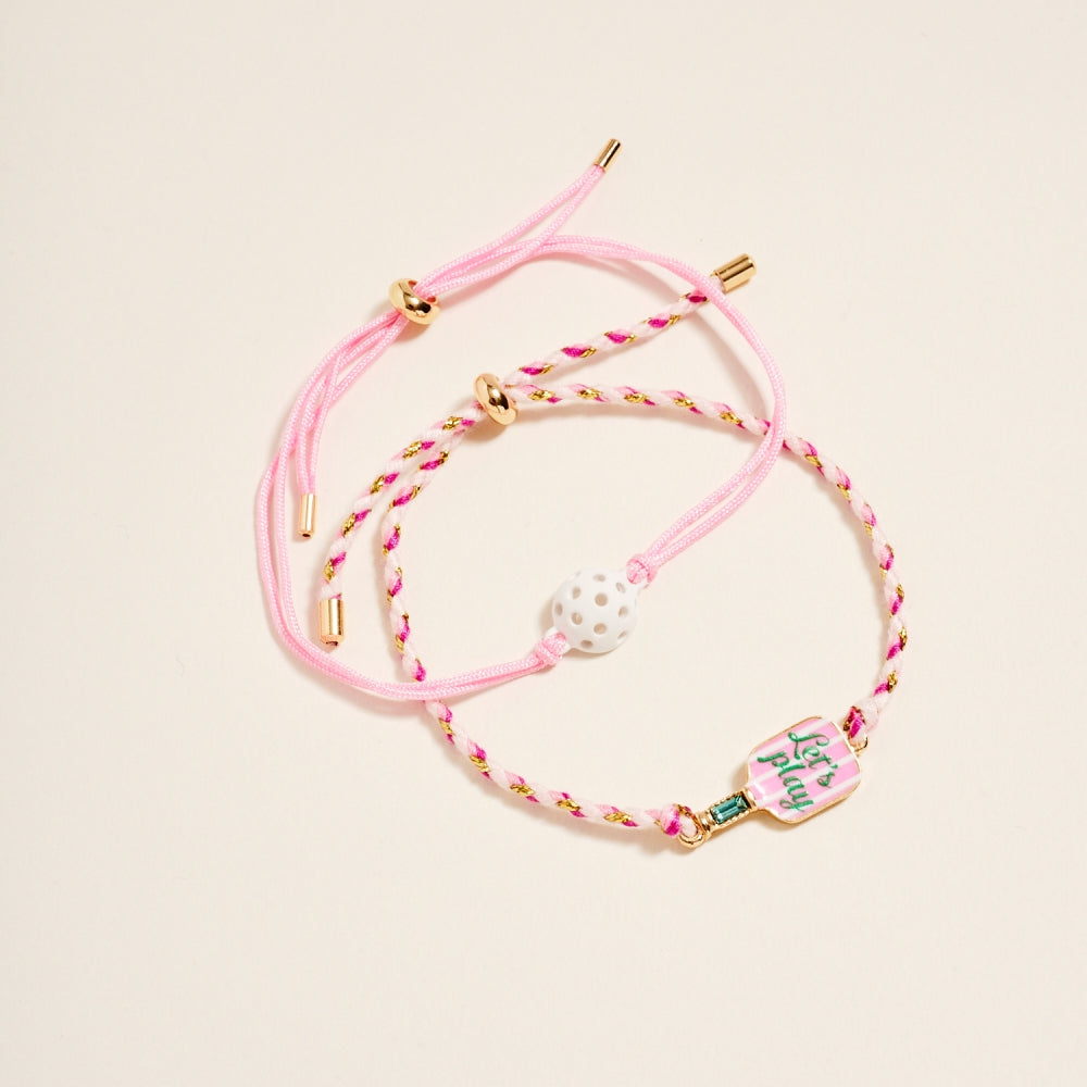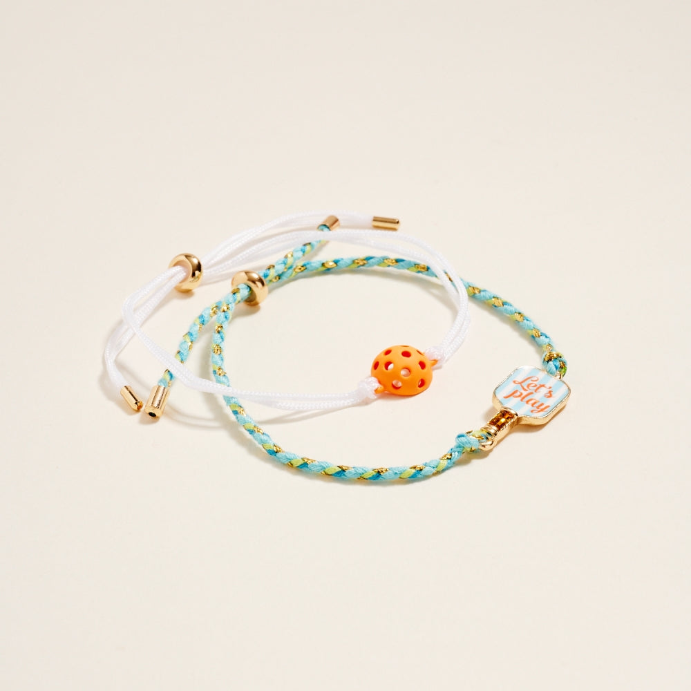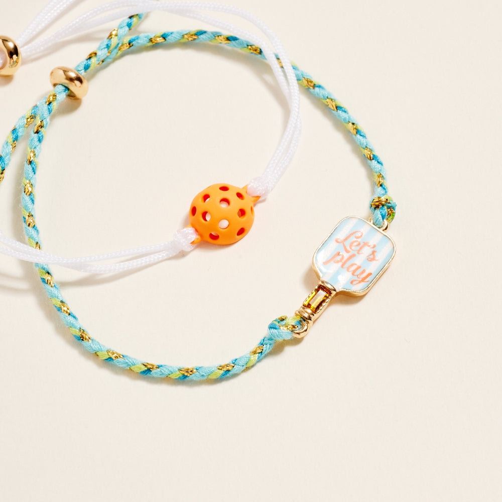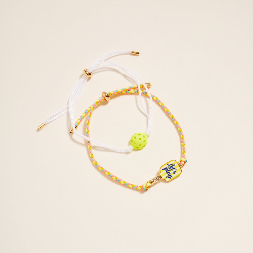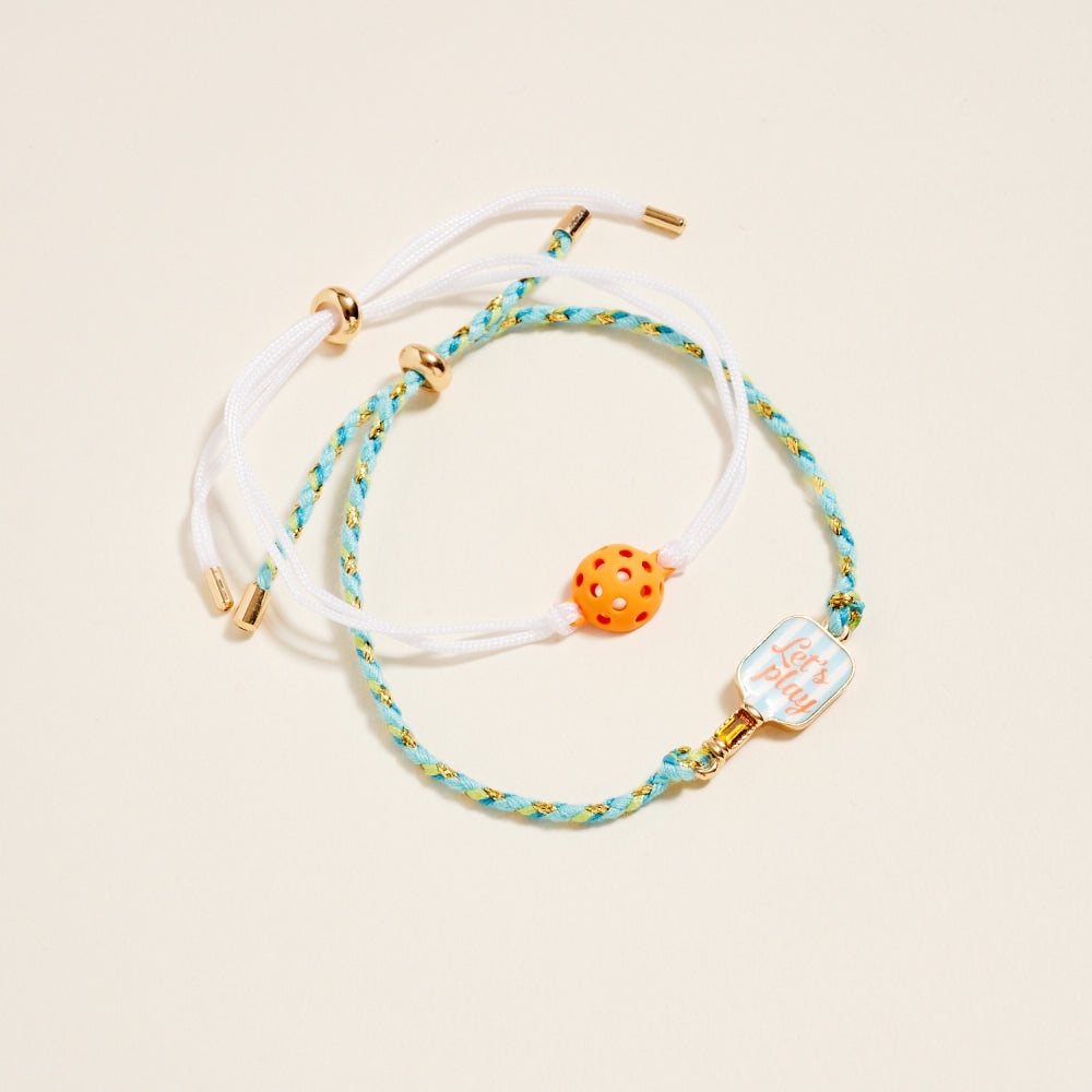 This adjustable bracelet set includes a pull tie rope style with an enamel paddle charm printed with Lets Play and a second matching bracelet featuring a pickleball ball charm. The duo creates a fun, sporty stacked look for everyday wear. A perfect accessory for anyone who loves the game.