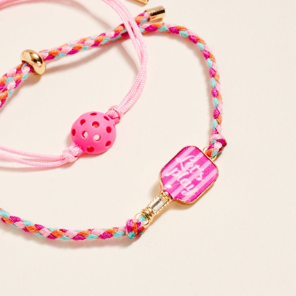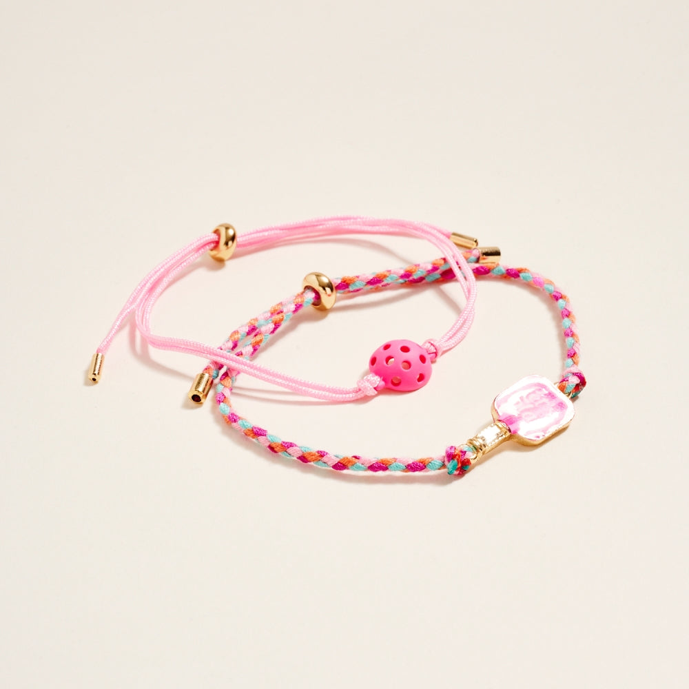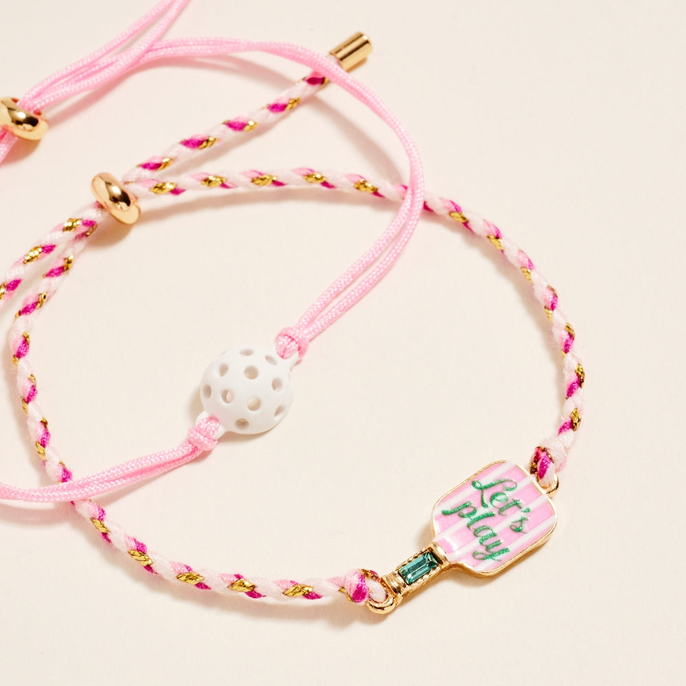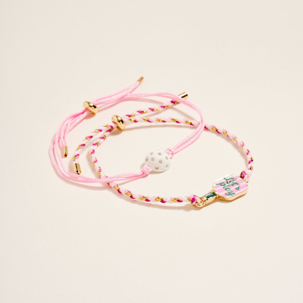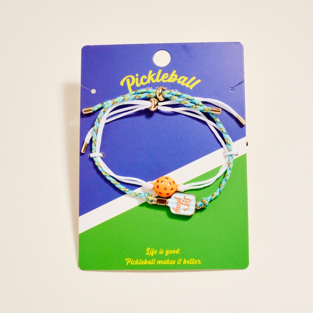 This adjustable bracelet set includes a pull tie rope style with an enamel paddle charm printed with Lets Play and a second matching bracelet featuring a pickleball ball charm. The duo creates a fun, sporty stacked look for everyday wear. A perfect accessory for anyone who loves the game.