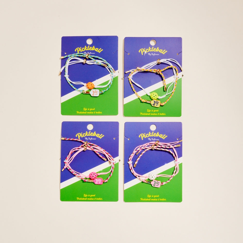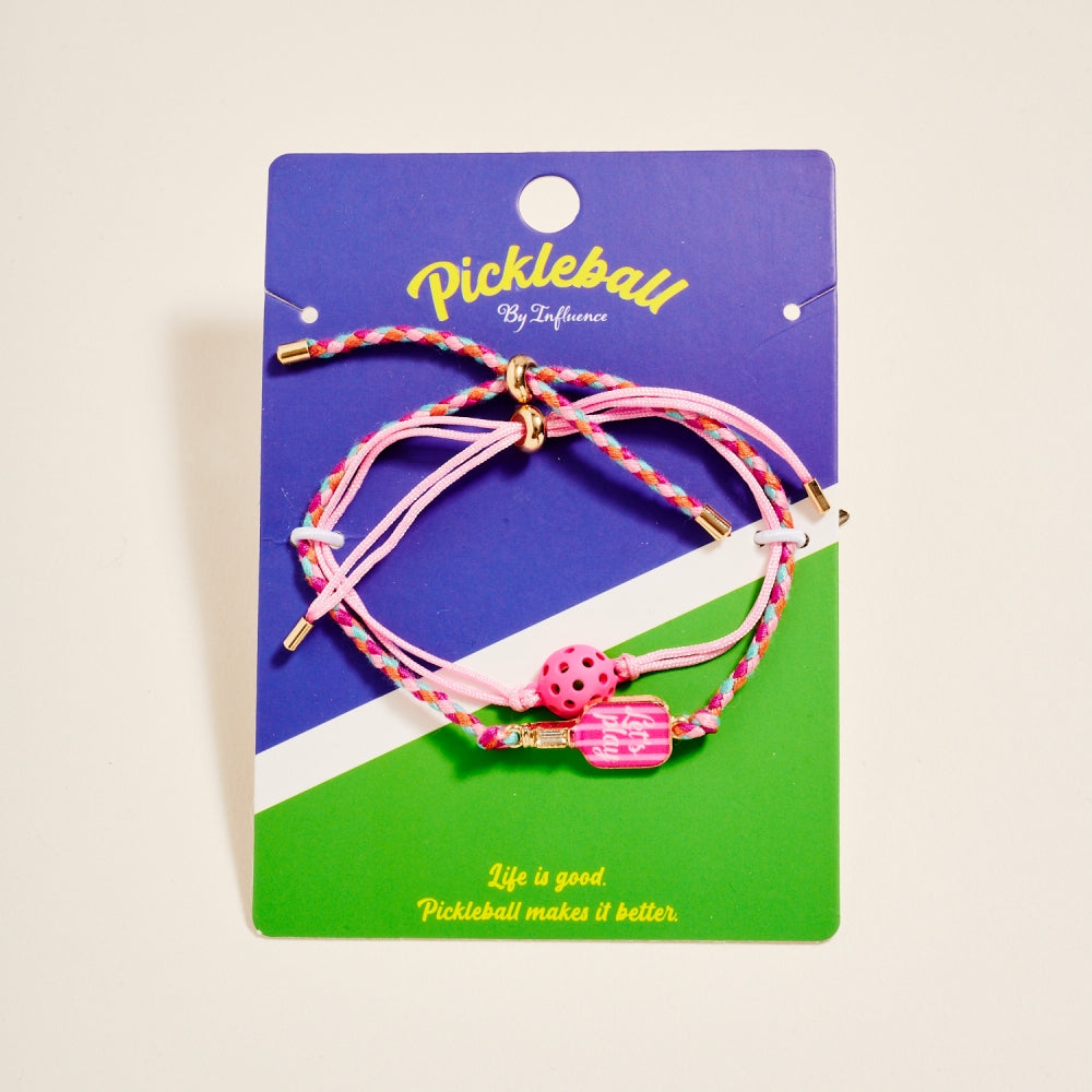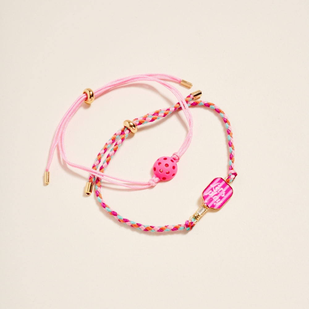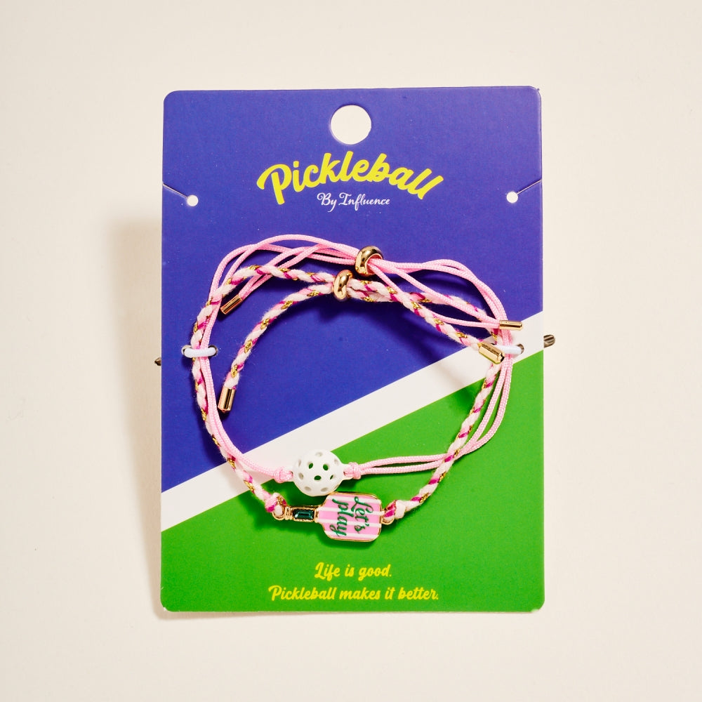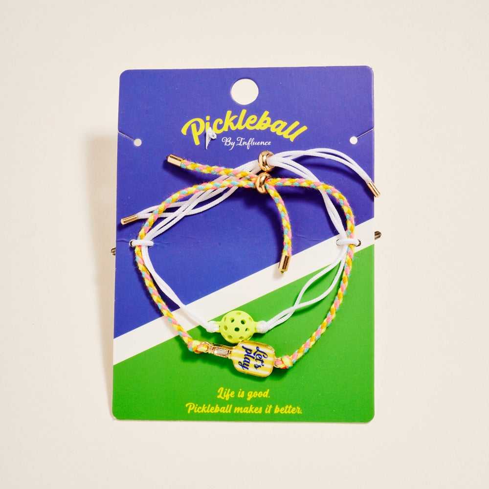 This adjustable bracelet set includes a pull tie rope style with an enamel paddle charm printed with Lets Play and a second matching bracelet featuring a pickleball ball charm. The duo creates a fun, sporty stacked look for everyday wear. A perfect accessory for anyone who loves the game.
