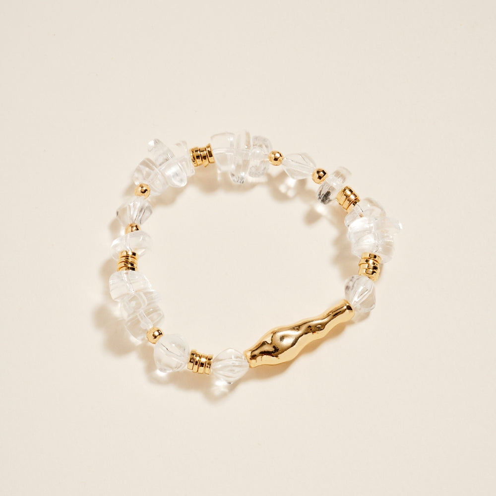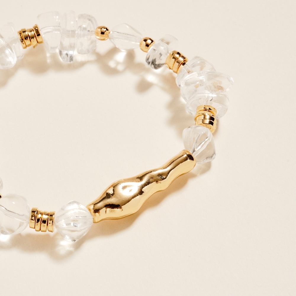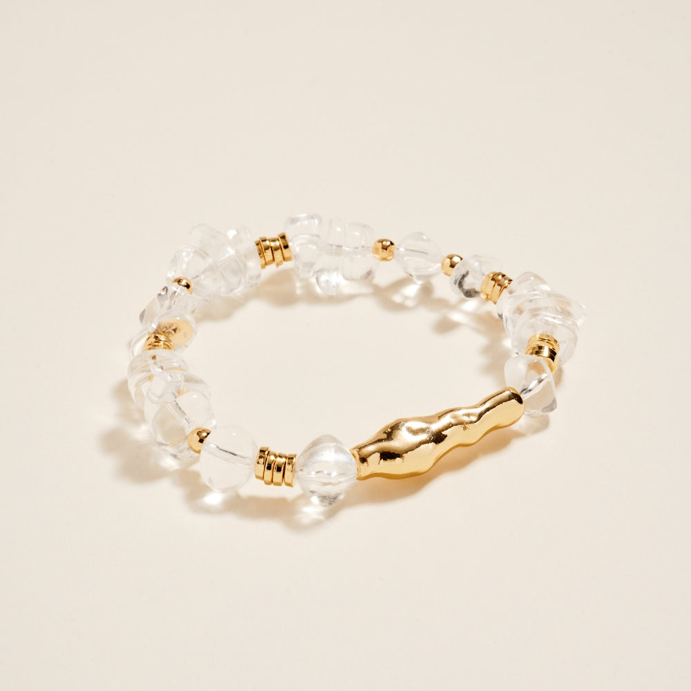 This 7.25 inch stretch bracelet features mixed clear resin beads paired with small metal disks for a soft, modern shine. A sleek metal bar pendant adds a polished focal point that elevates the design. Lightweight and comfortable, it layers beautifully with other bracelets.