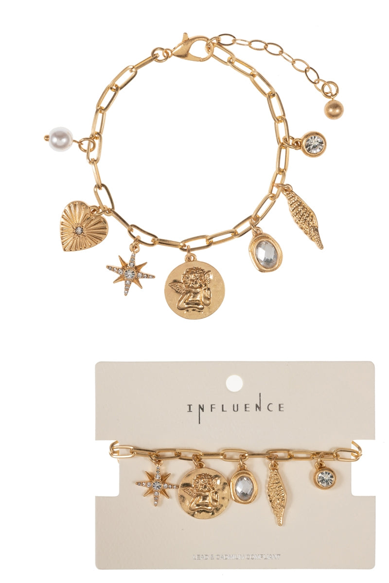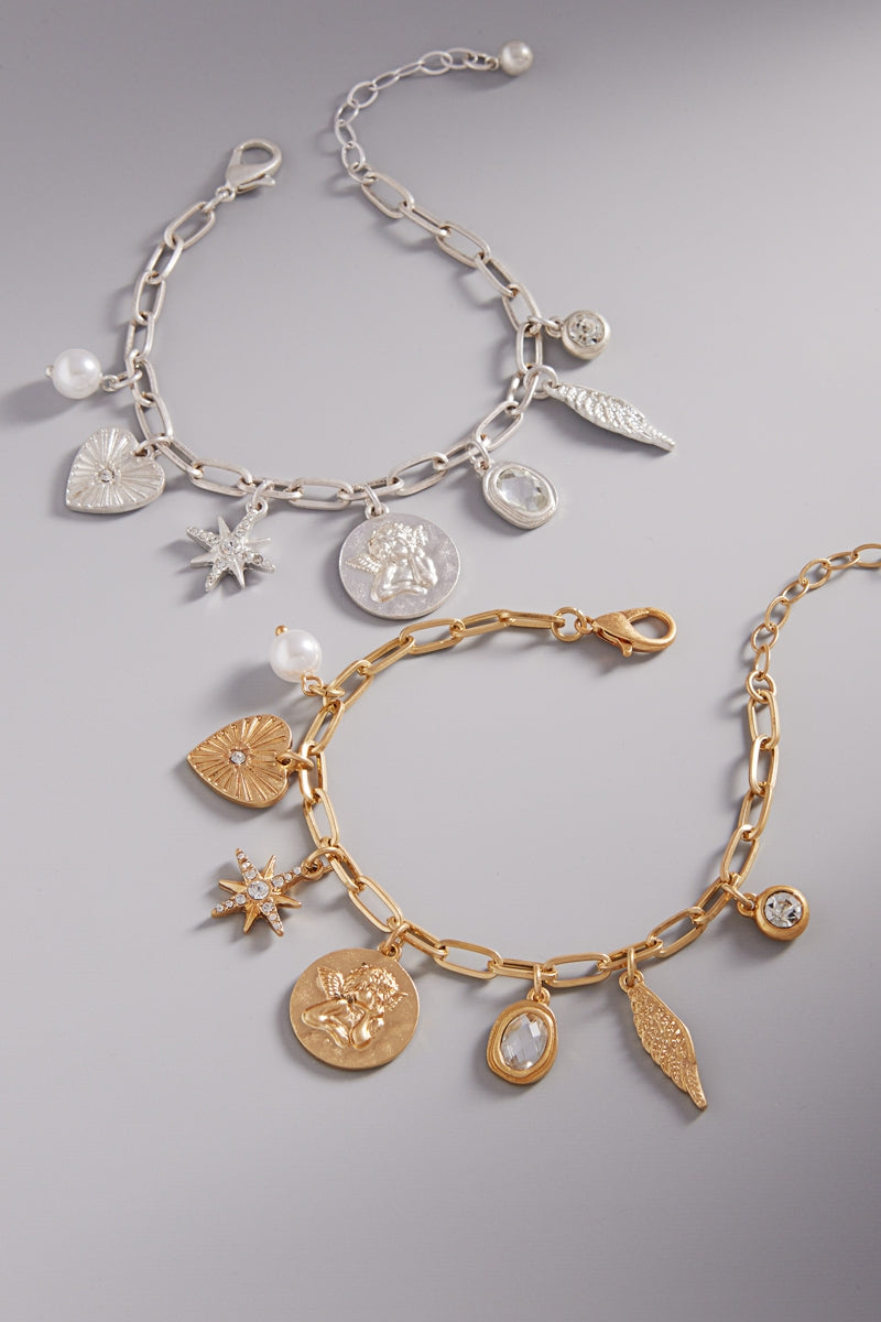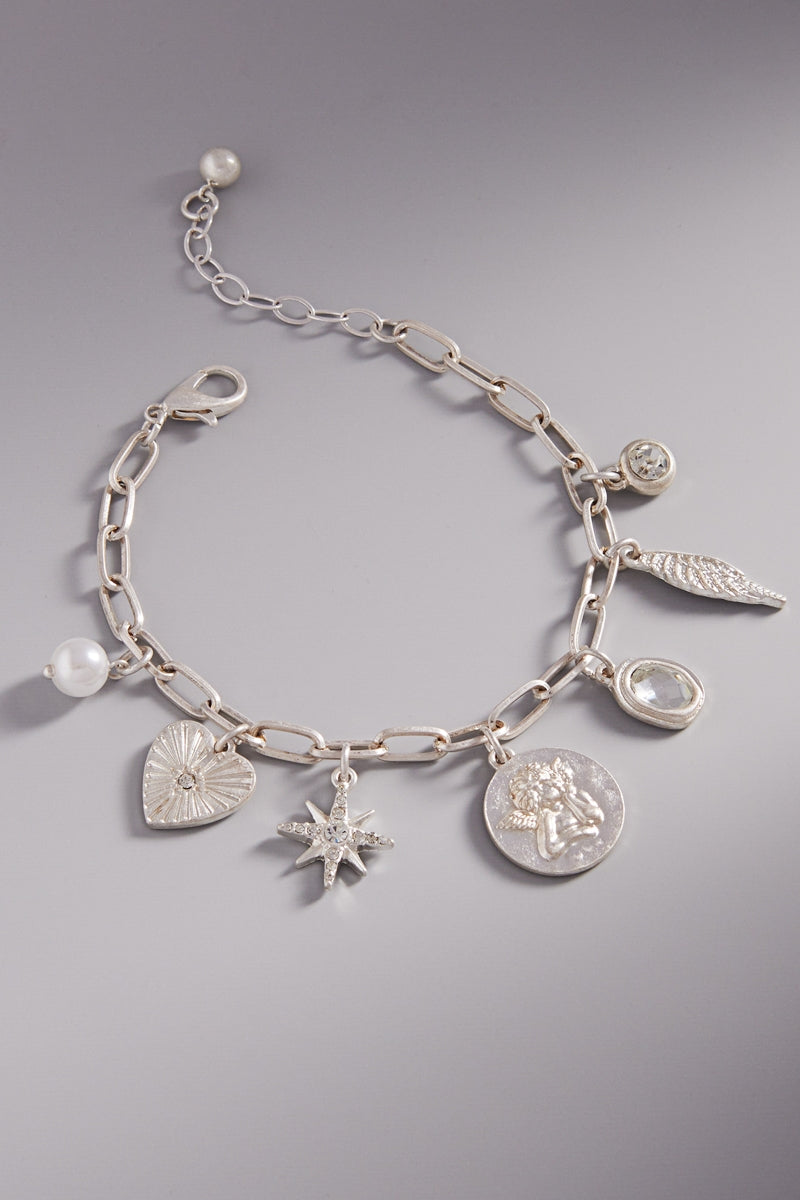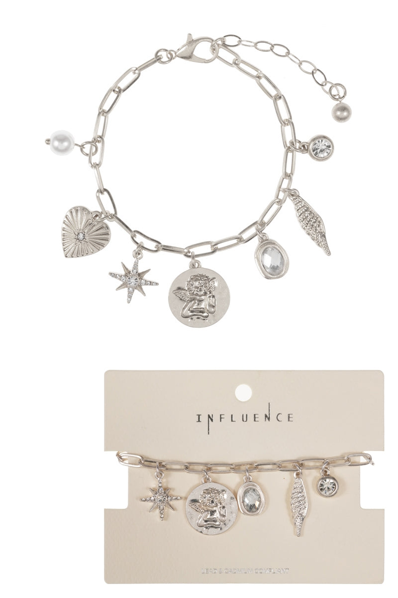 This 7.25 inch charm bracelet features an assortment of unique metal charms, including angles, wings, stars, and hearts. A secure clasp ensures your charms stay in place throughout the day. Elevate your style with this versatile and eye-catching accessory.
