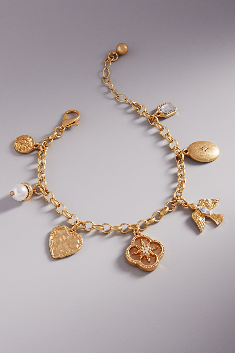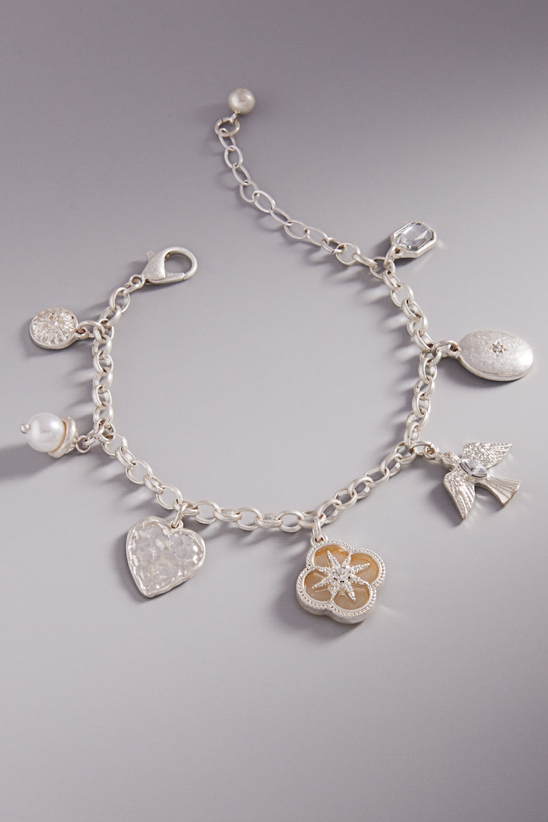 This 7.25 inch charm bracelet features a mix of Quatrefoil, heart, bird, and oval disk-shaped metal charms, all secured by a convenient clasp. The diverse shapes add interest and appeal to any outfit, making it a versatile accessory for any occasion.