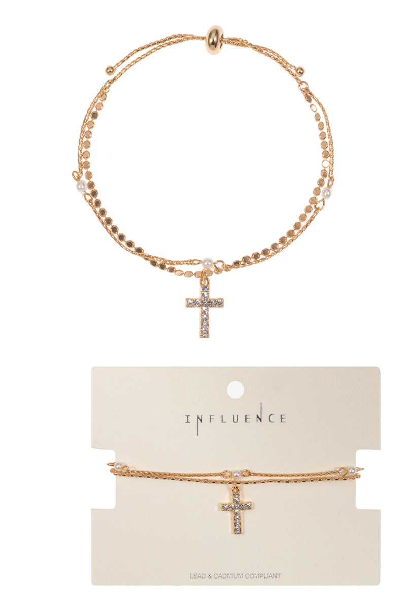 This 7.25 inch cross features a delicate, multi-layered pull tie bracelet. Made with expert craftsmanship, this unique piece is both elegant and versatile, perfect for adding a touch of style to any outfit.