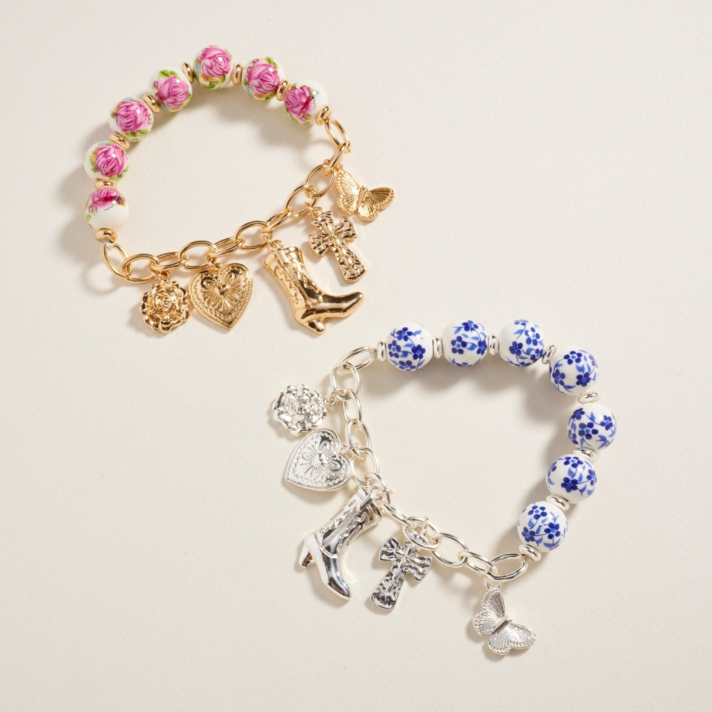 Floral Ceramic Bead Western Charm Stretch Bracelet