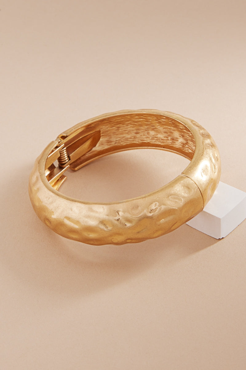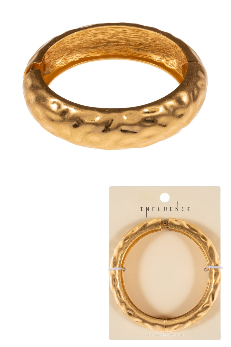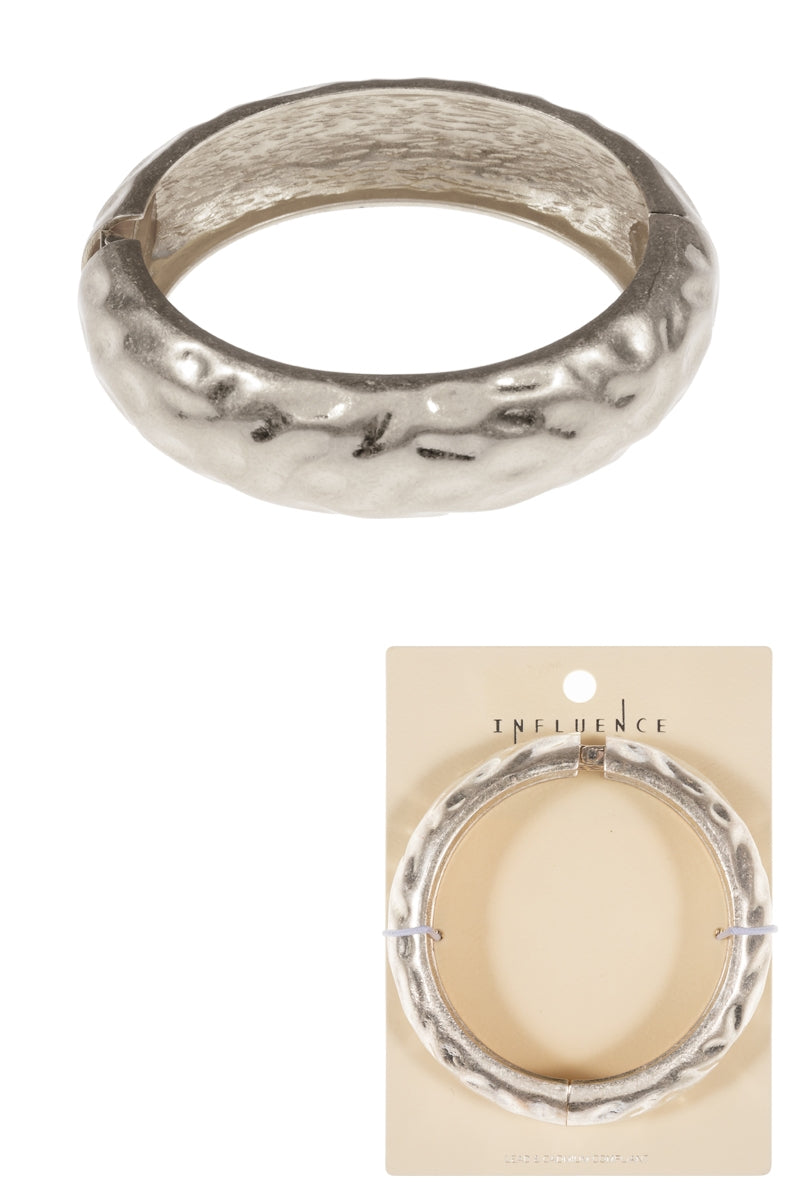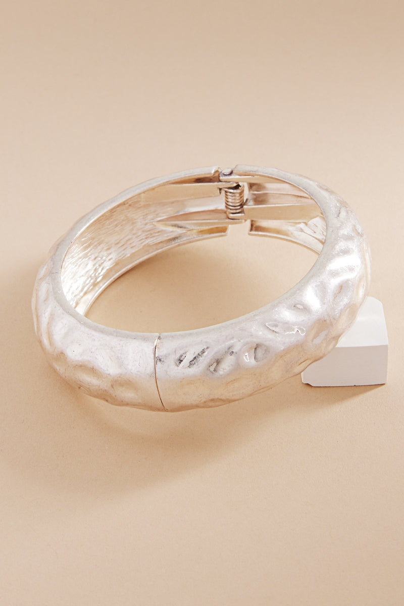 This 7.25 inch bangle bracelet features a unique hammered texture and metal hinge, creating a sleek and stylish look. Crafted with high-quality materials, it offers durability and a comfortable fit. Elevate any outfit with this elegant accessory.