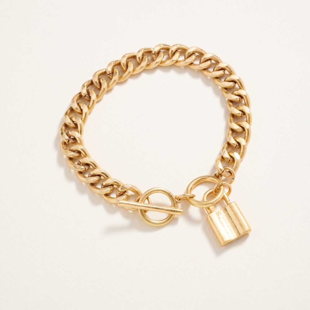 This chain bracelet showcases a bold lock-inspired design paired with a classic toggle clasp. A versatile piece that can be styled solo or layered with other bracelets for a chic stacked look.