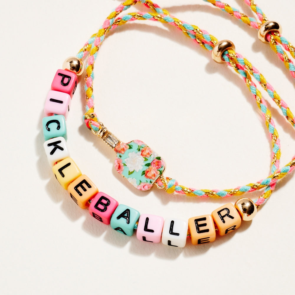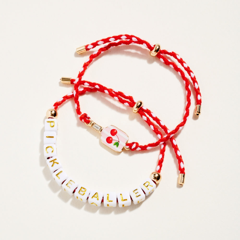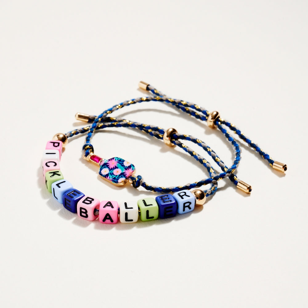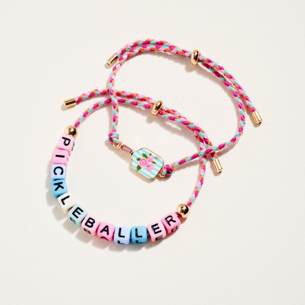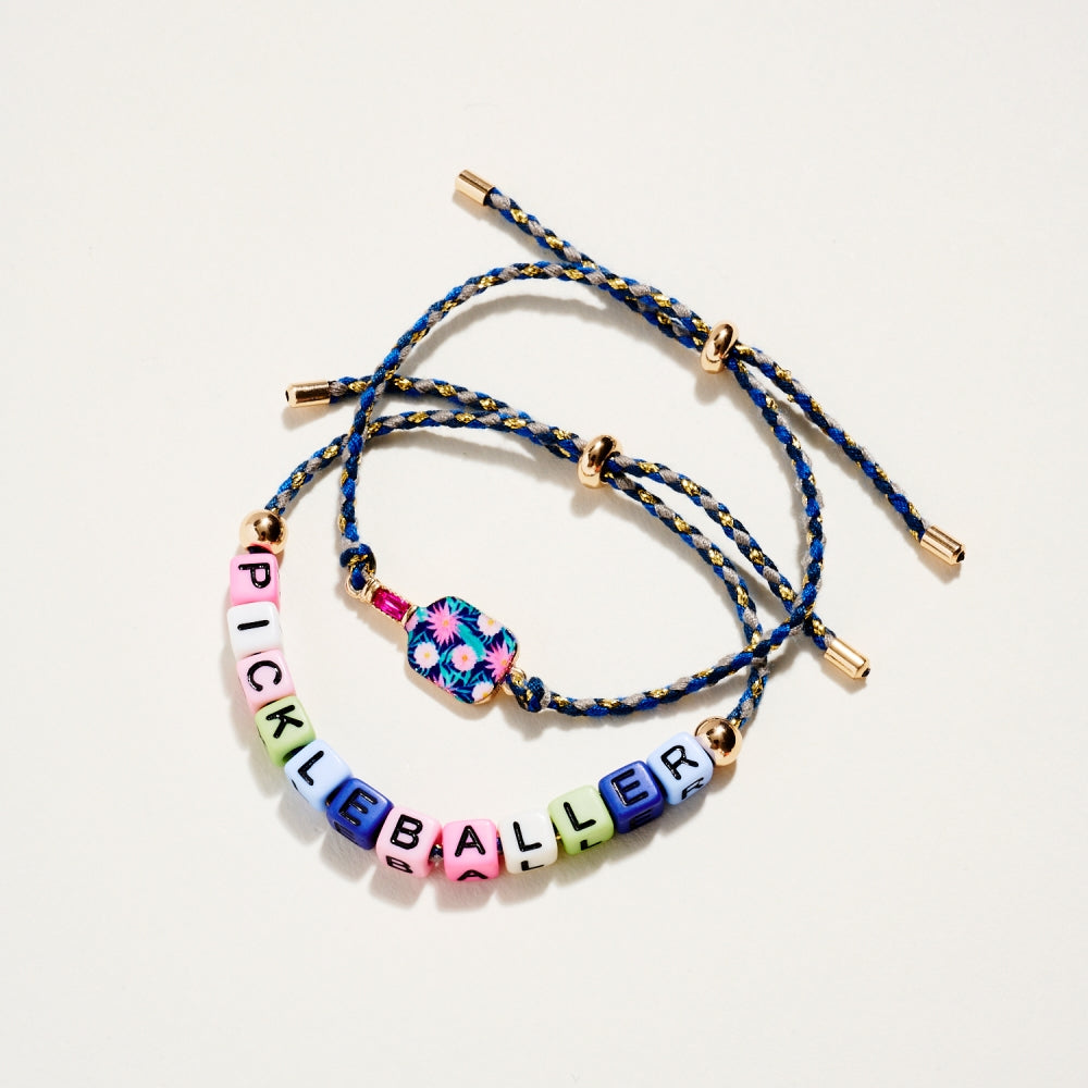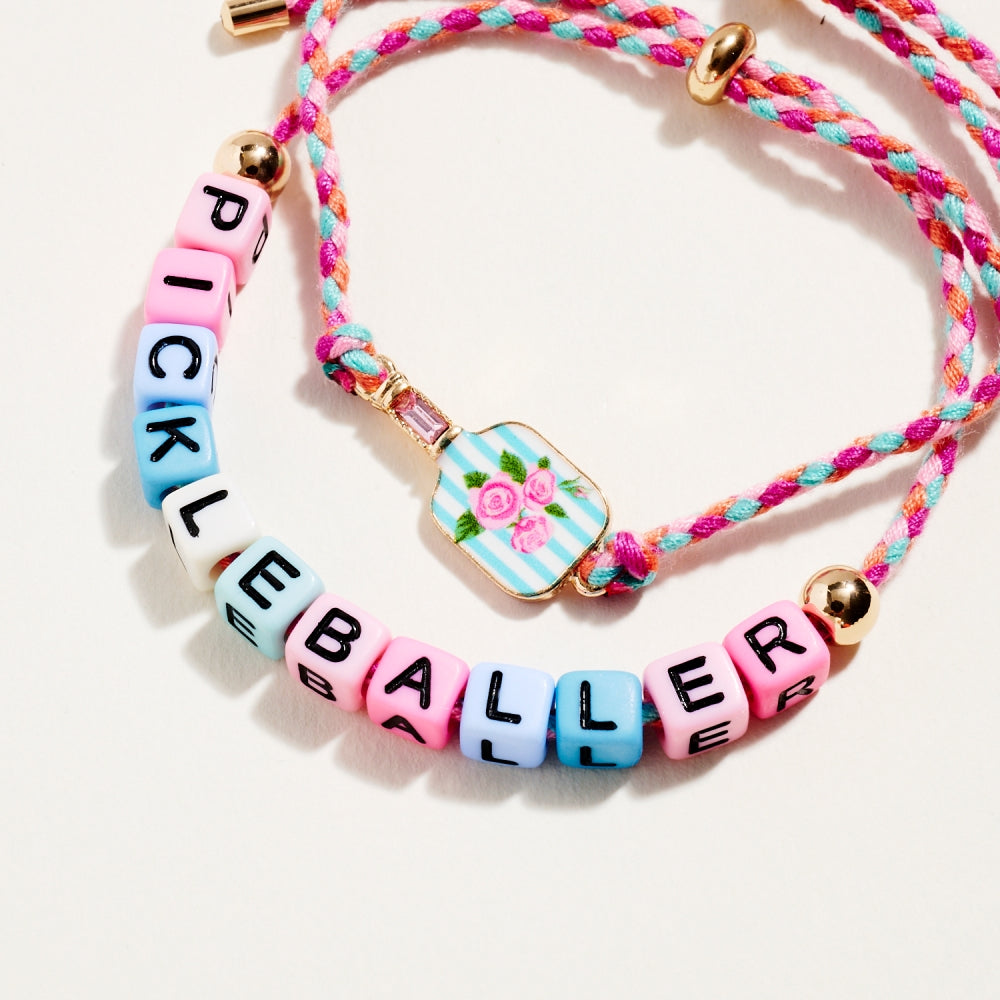 This bracelet duo includes a pull tie rope style with letter beads spelling Pickleballer and a second matching pull tie accented with an enamel paddle charm. The set adds a fun and sporty touch to everyday wear. A perfect gift for pickleball lovers.