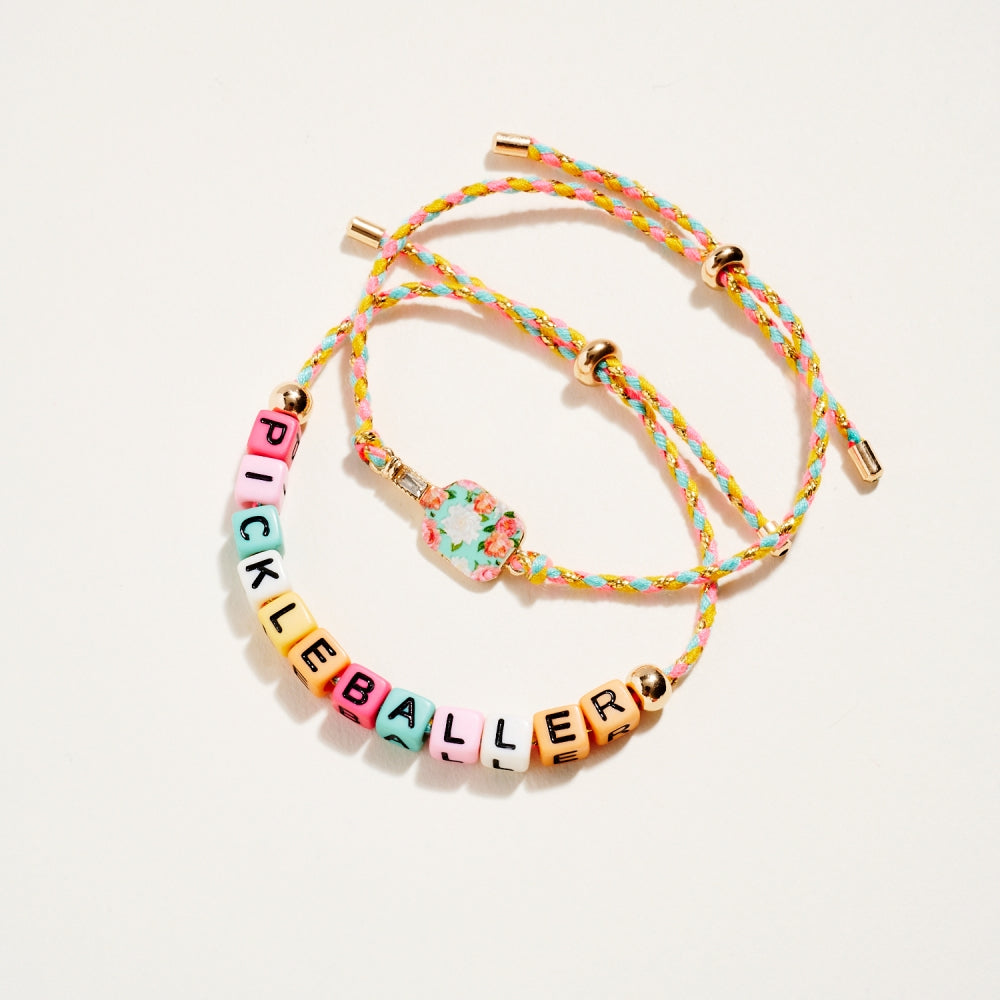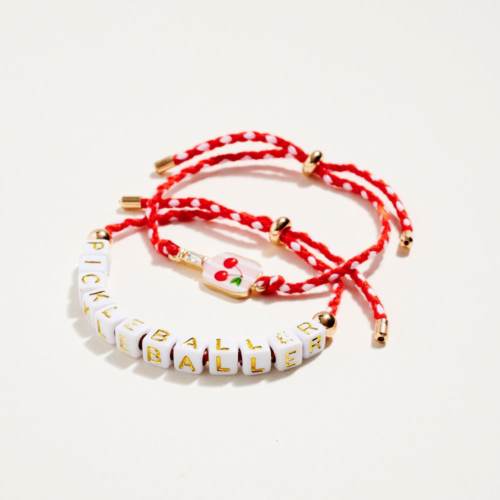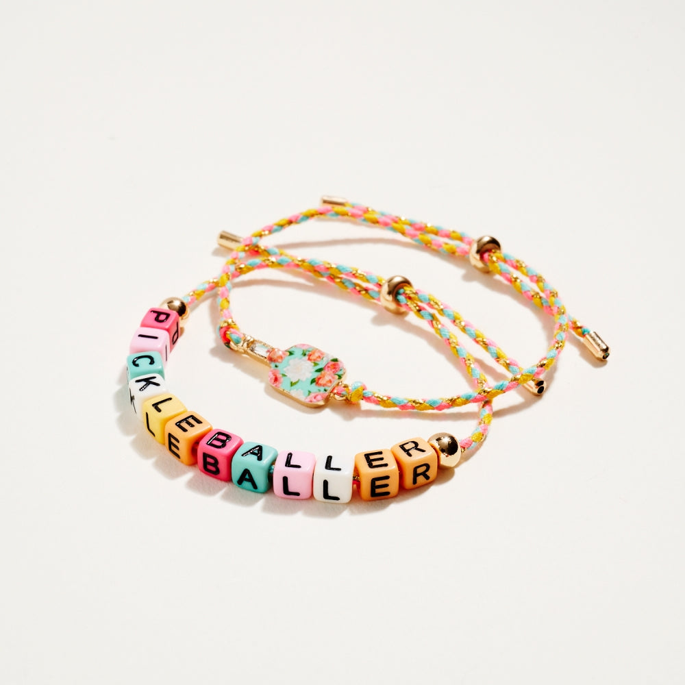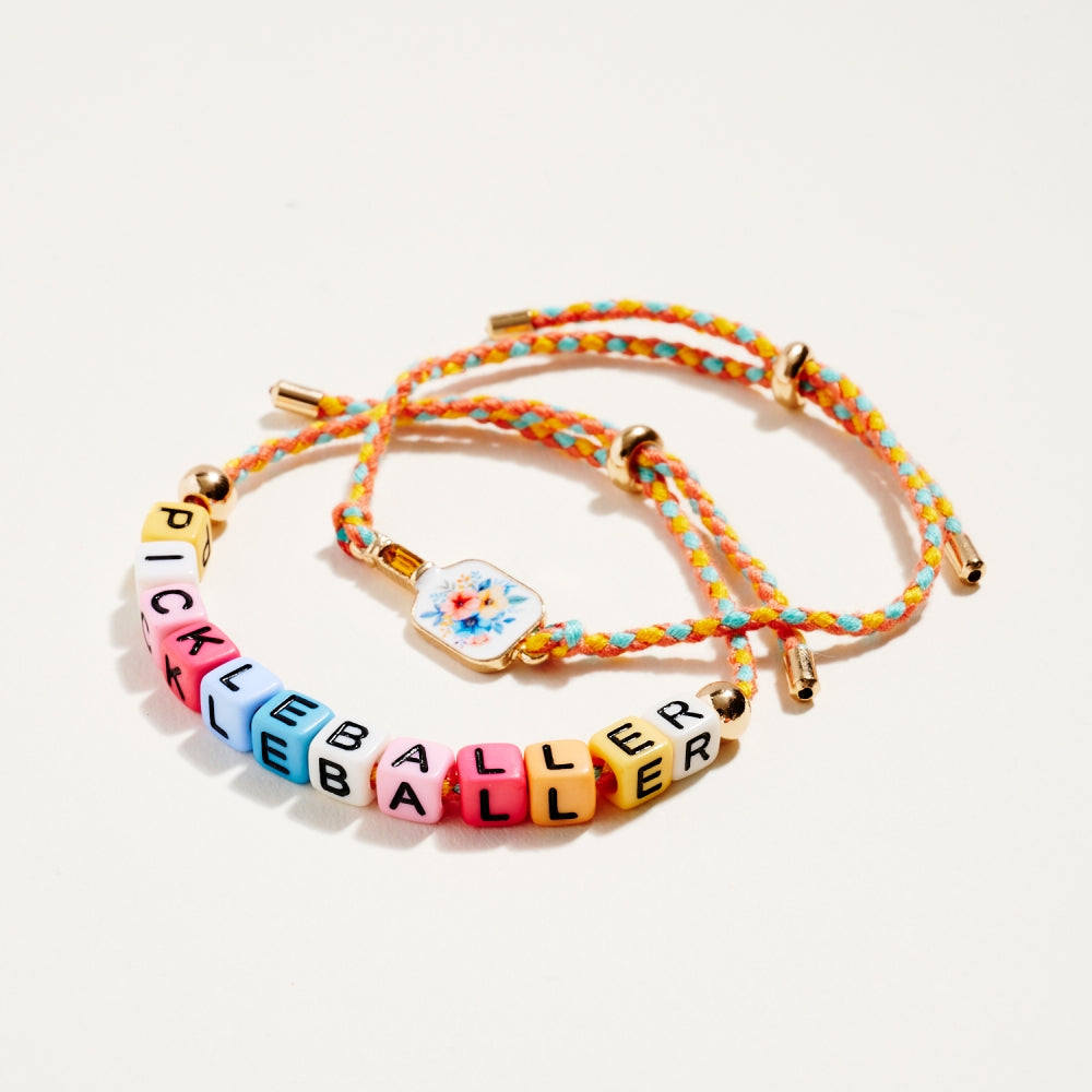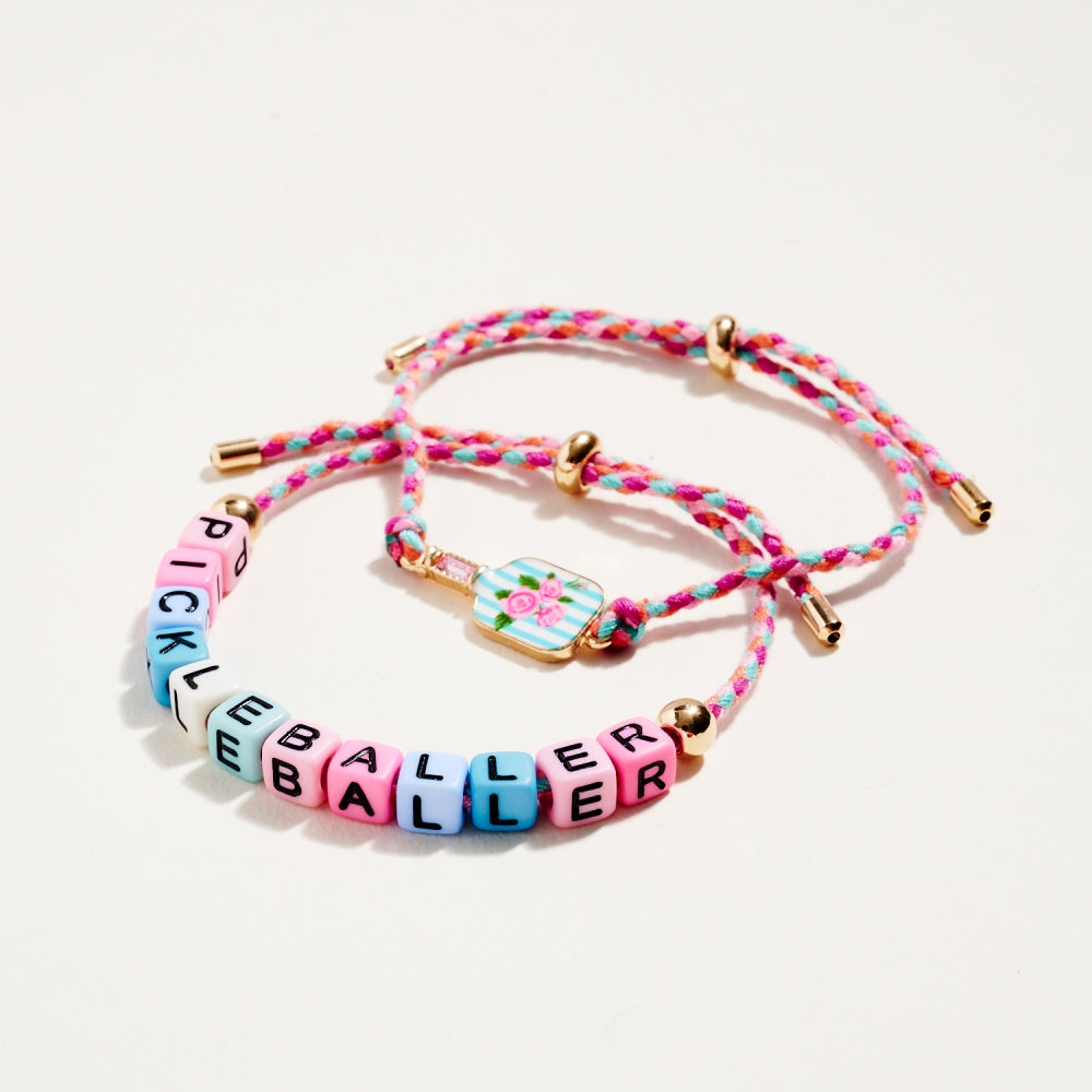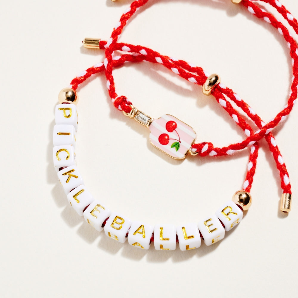 This bracelet duo includes a pull tie rope style with letter beads spelling Pickleballer and a second matching pull tie accented with an enamel paddle charm. The set adds a fun and sporty touch to everyday wear. A perfect gift for pickleball lovers.