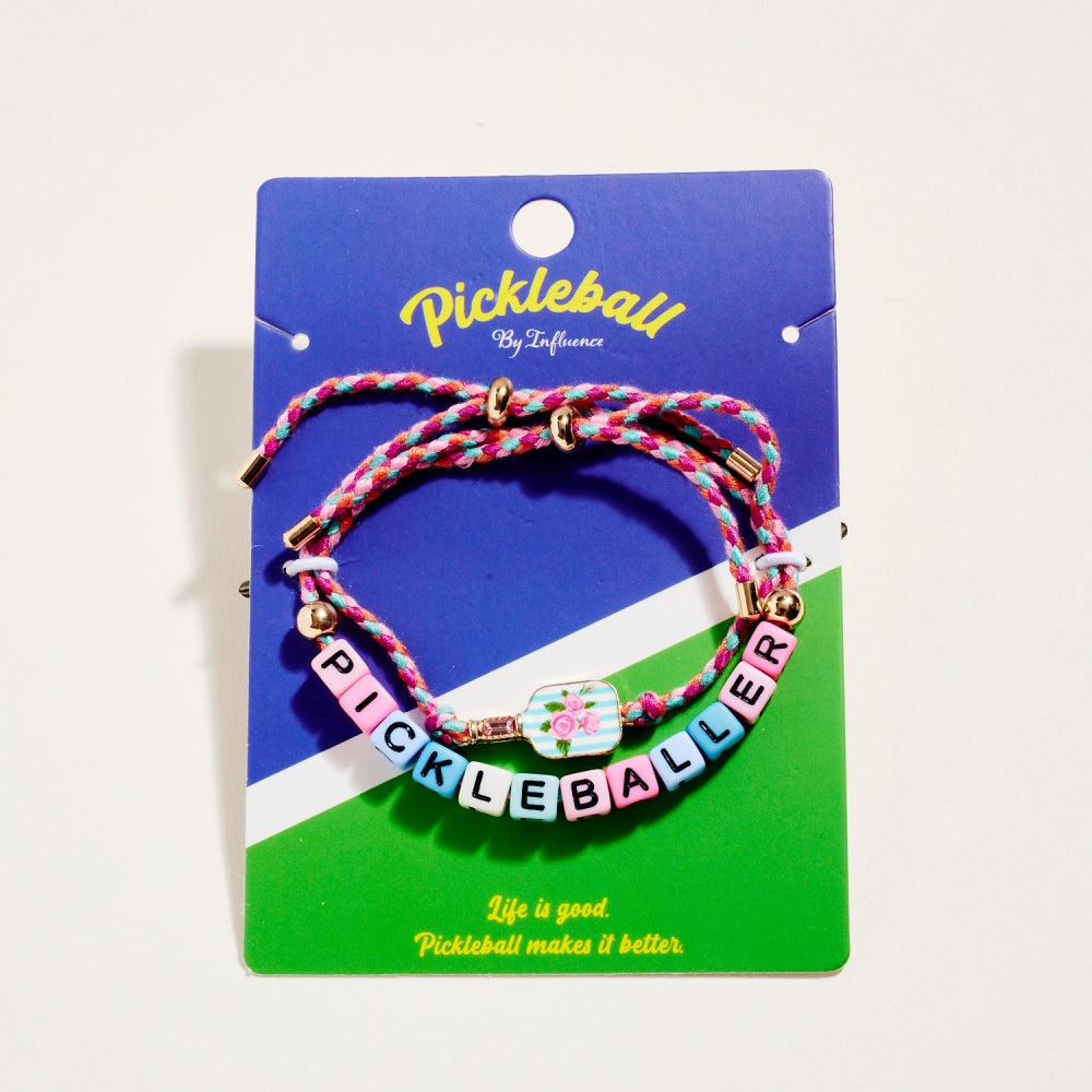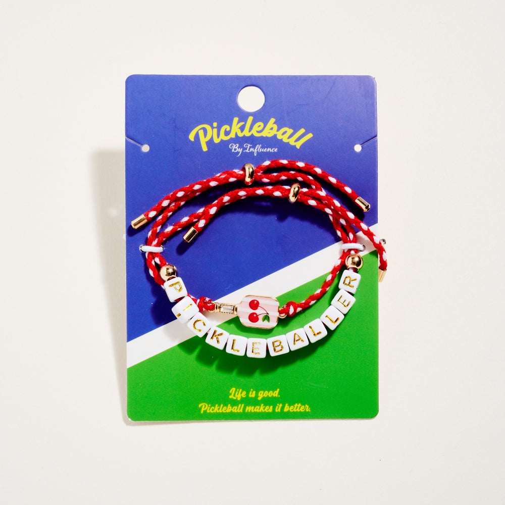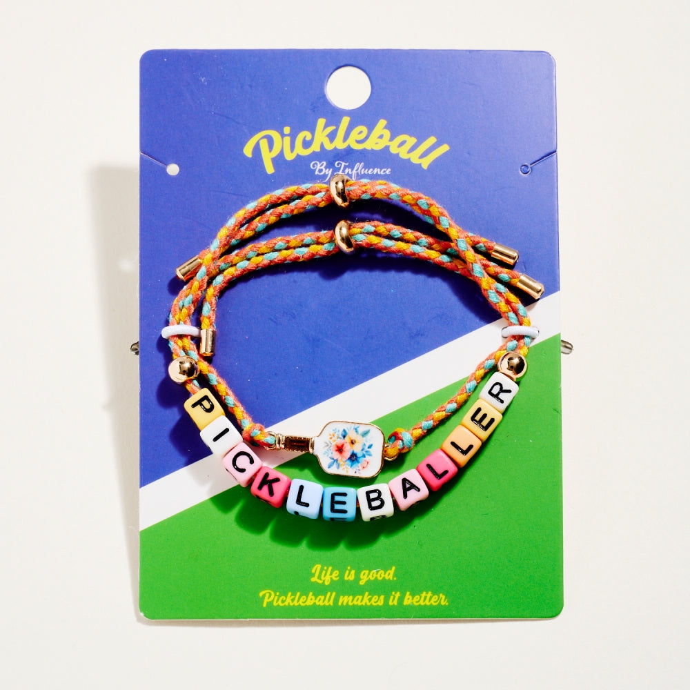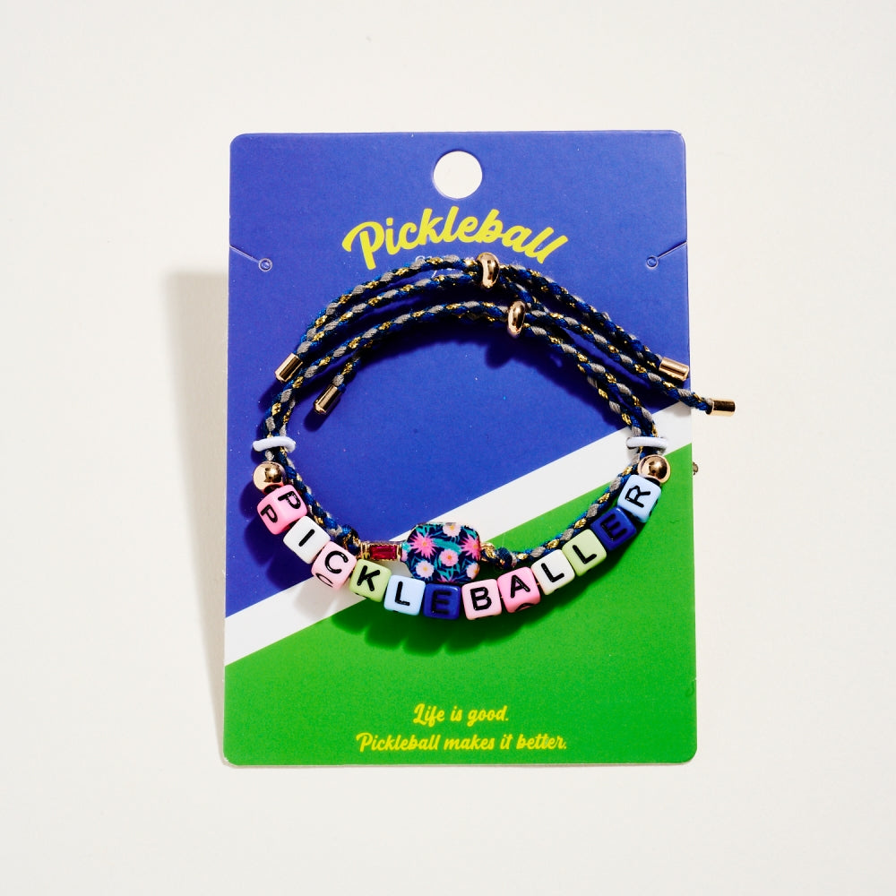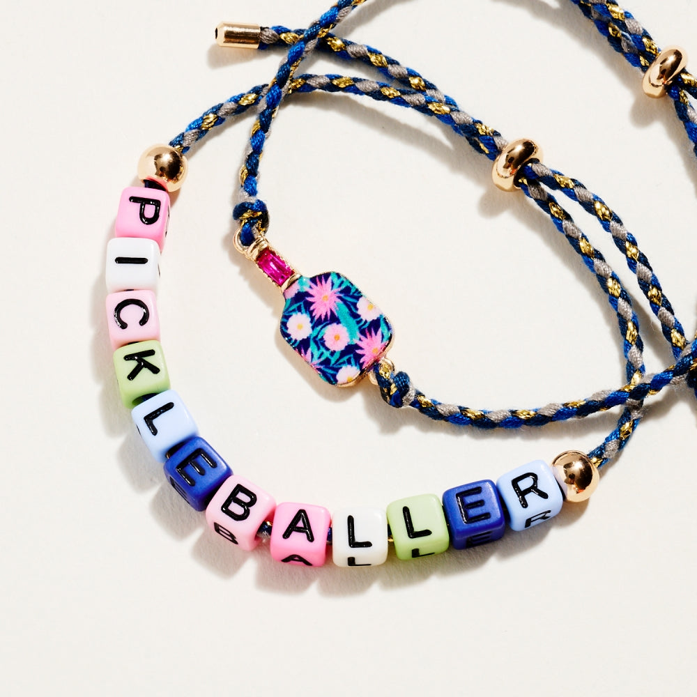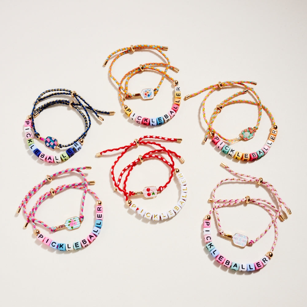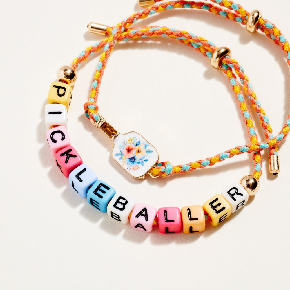 This bracelet duo includes a pull tie rope style with letter beads spelling Pickleballer and a second matching pull tie accented with an enamel paddle charm. The set adds a fun and sporty touch to everyday wear. A perfect gift for pickleball lovers.