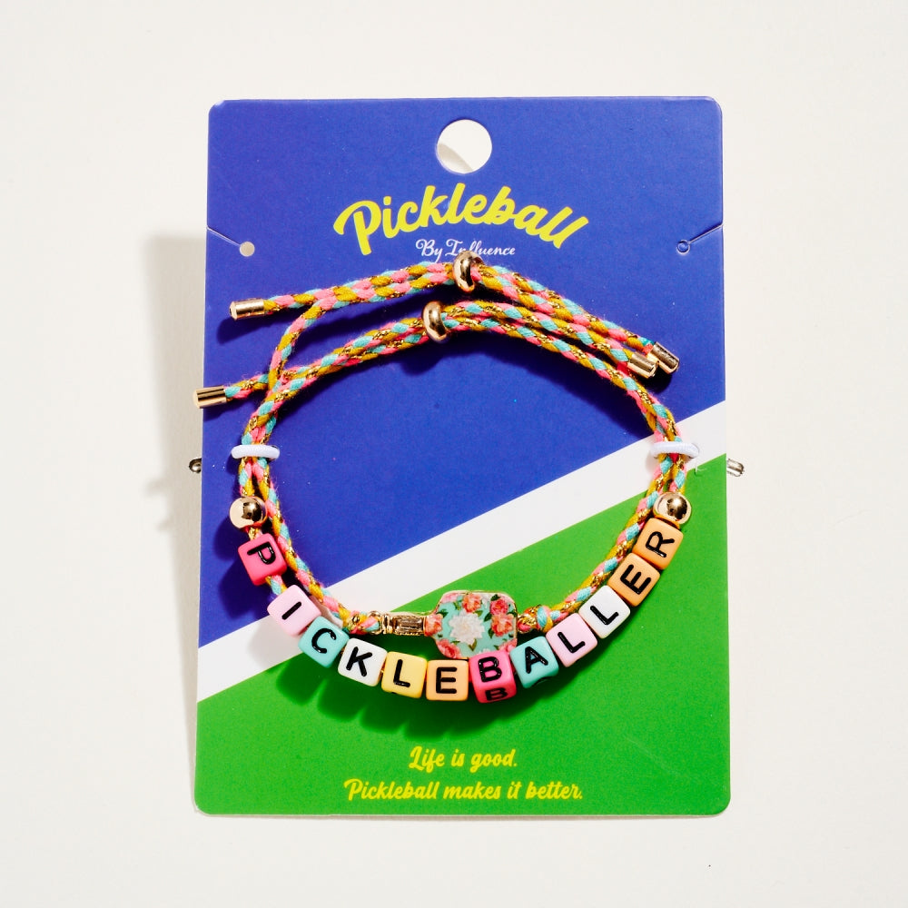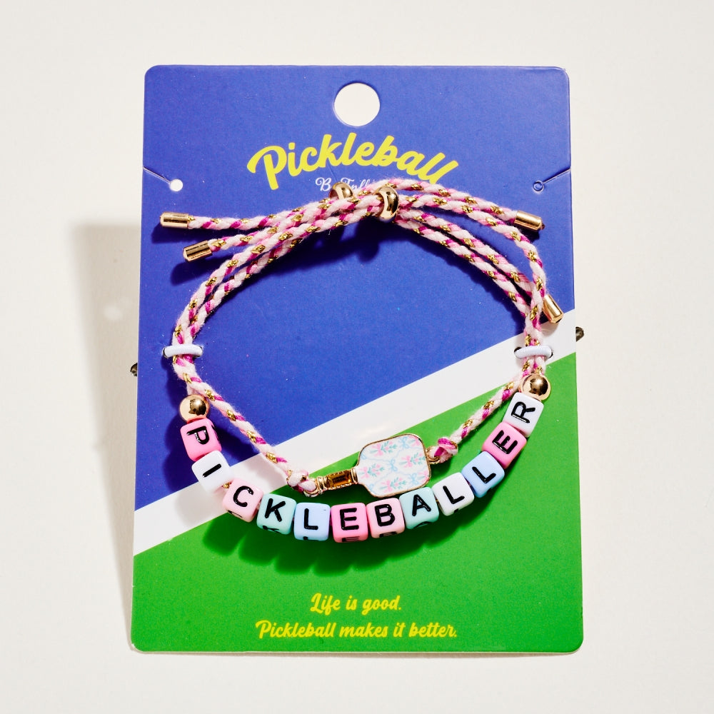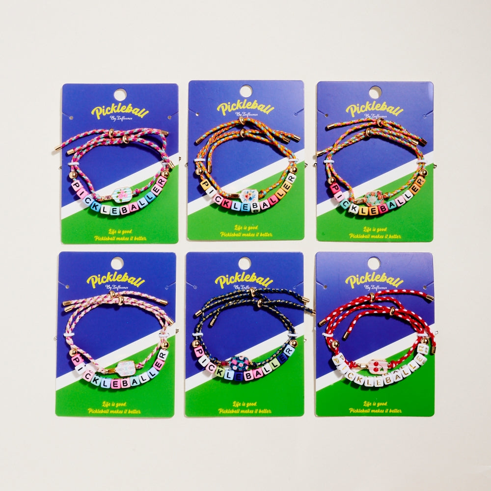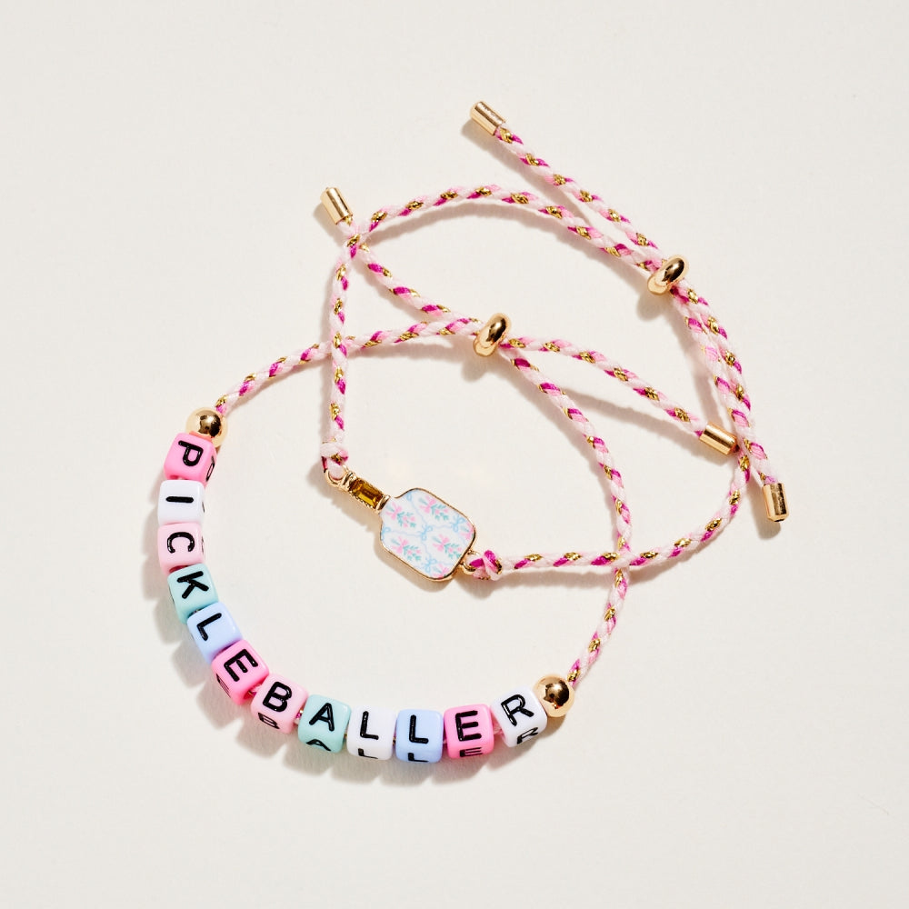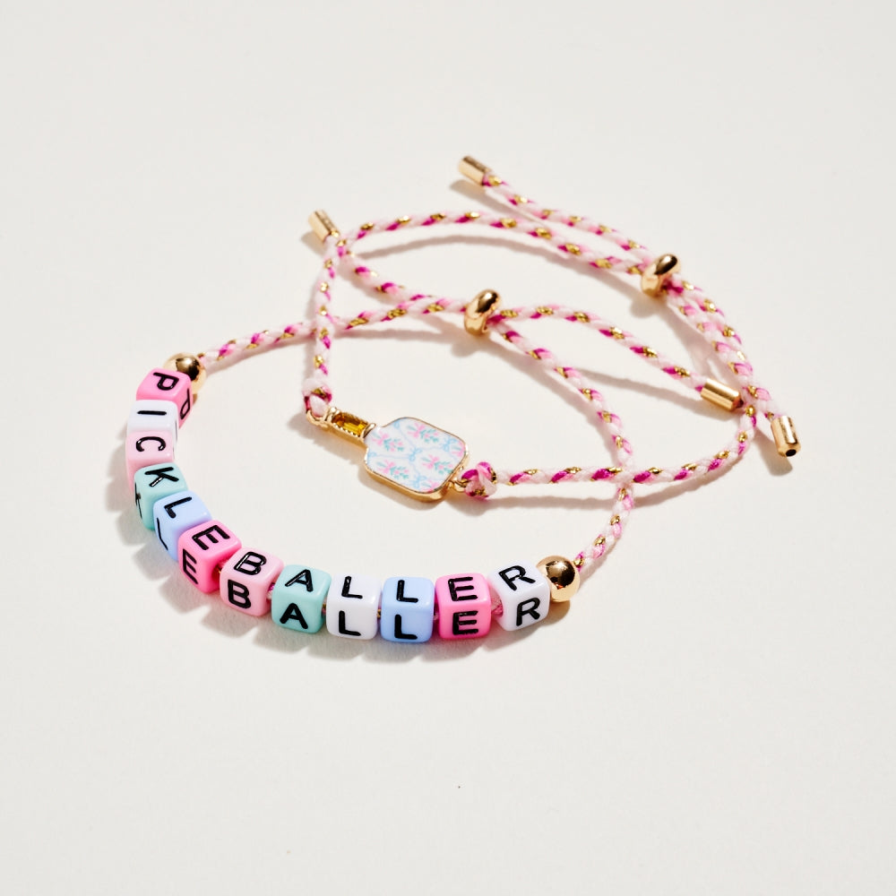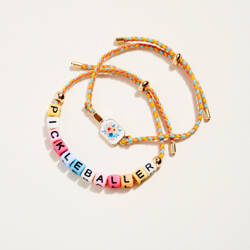 This bracelet duo includes a pull tie rope style with letter beads spelling Pickleballer and a second matching pull tie accented with an enamel paddle charm. The set adds a fun and sporty touch to everyday wear. A perfect gift for pickleball lovers.