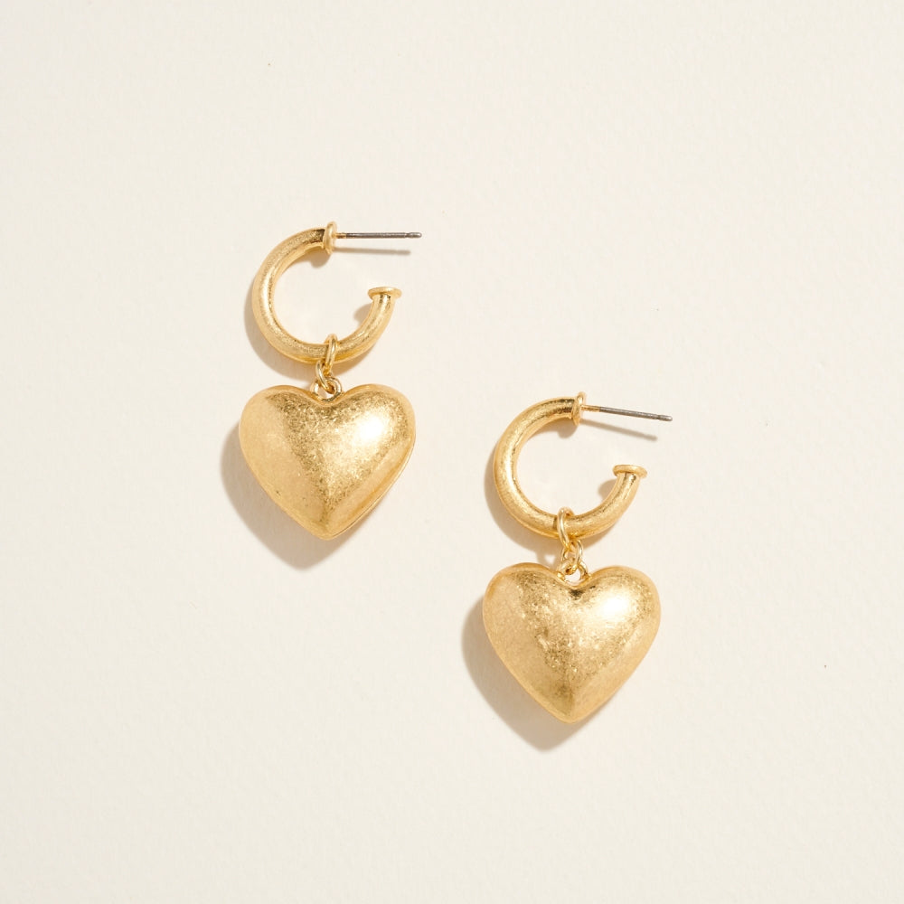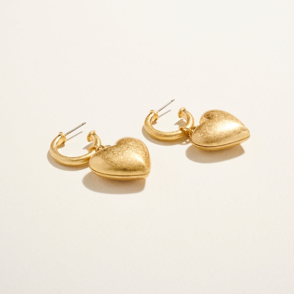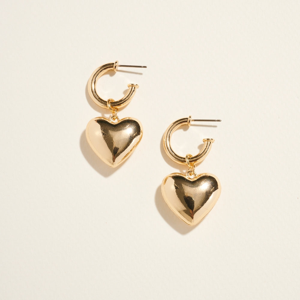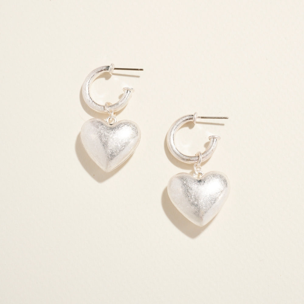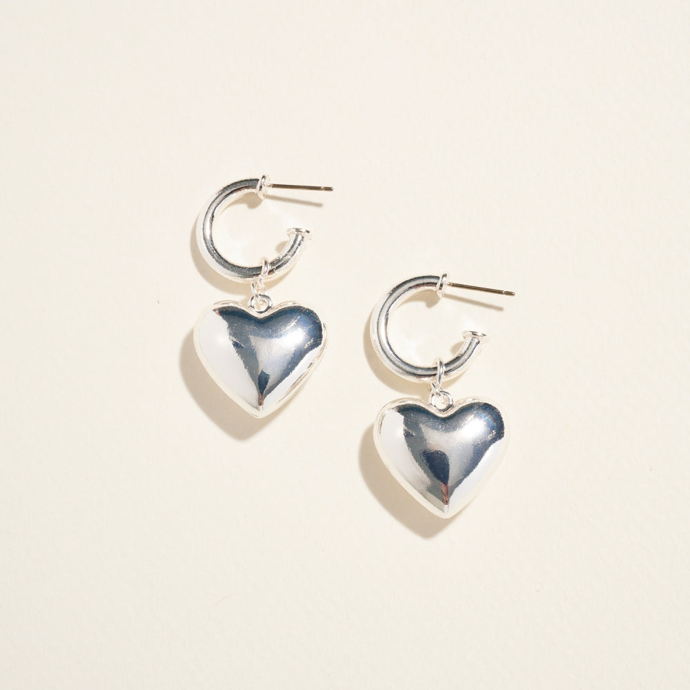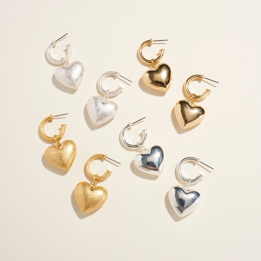 These earrings feature bold puffy heart charms linked into a sleek hoop design. At 1.75 inches, they make a playful yet polished statement for any look.