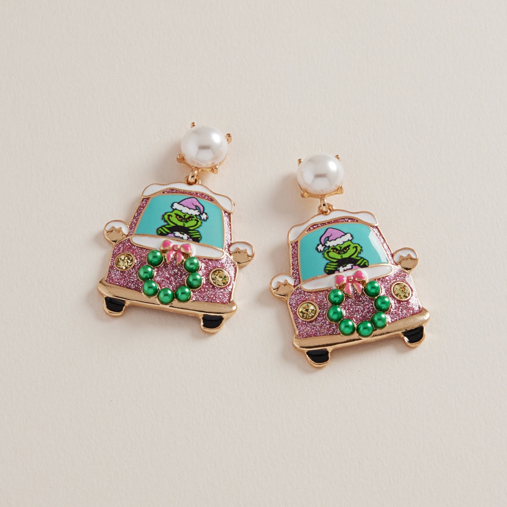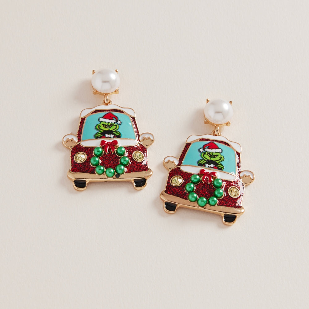 A mischievous monster takes the wheel in these whimsical Christmas car earrings, accented with pearl details for a fun finish.