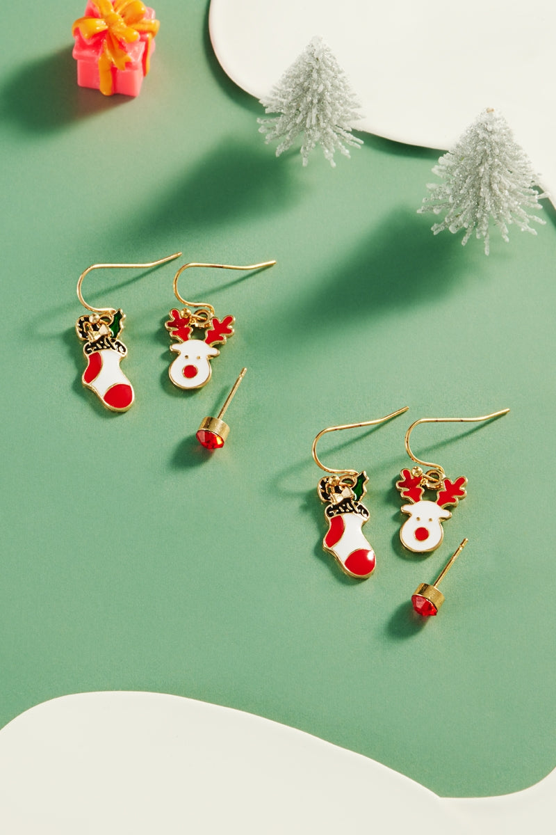 Christmas Reindeer Stocking 3PC Set Post Earrings