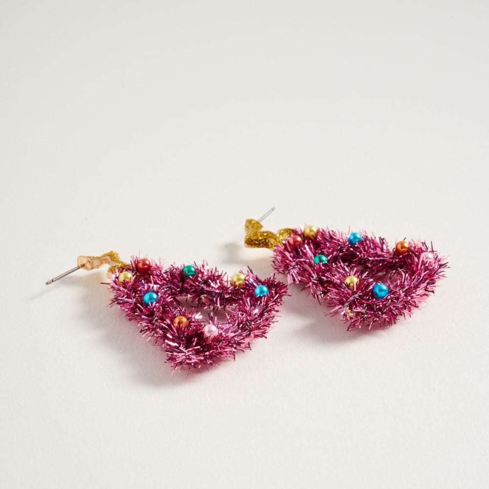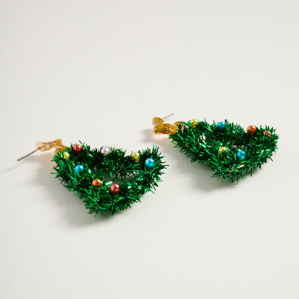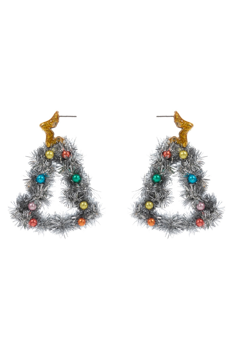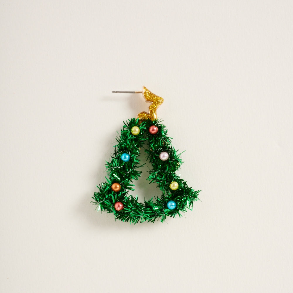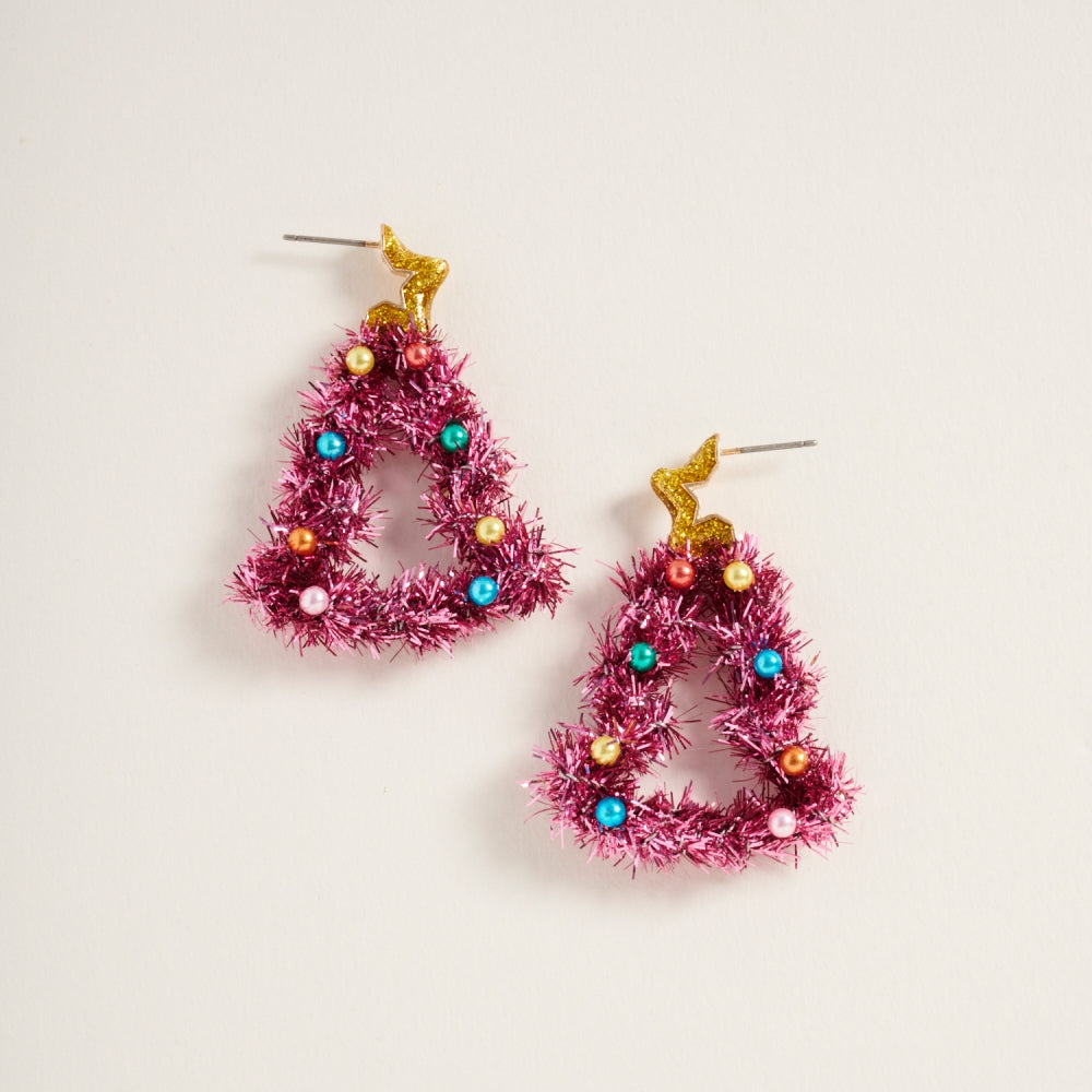 These cheerful post earrings feature a Christmas tree silhouette decorated with bright, multicolor pearls for a playful holiday touch.