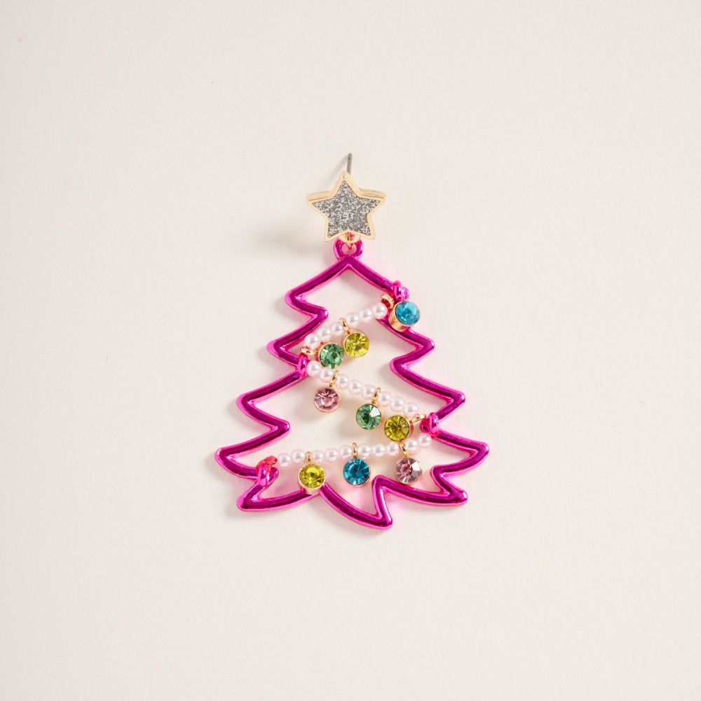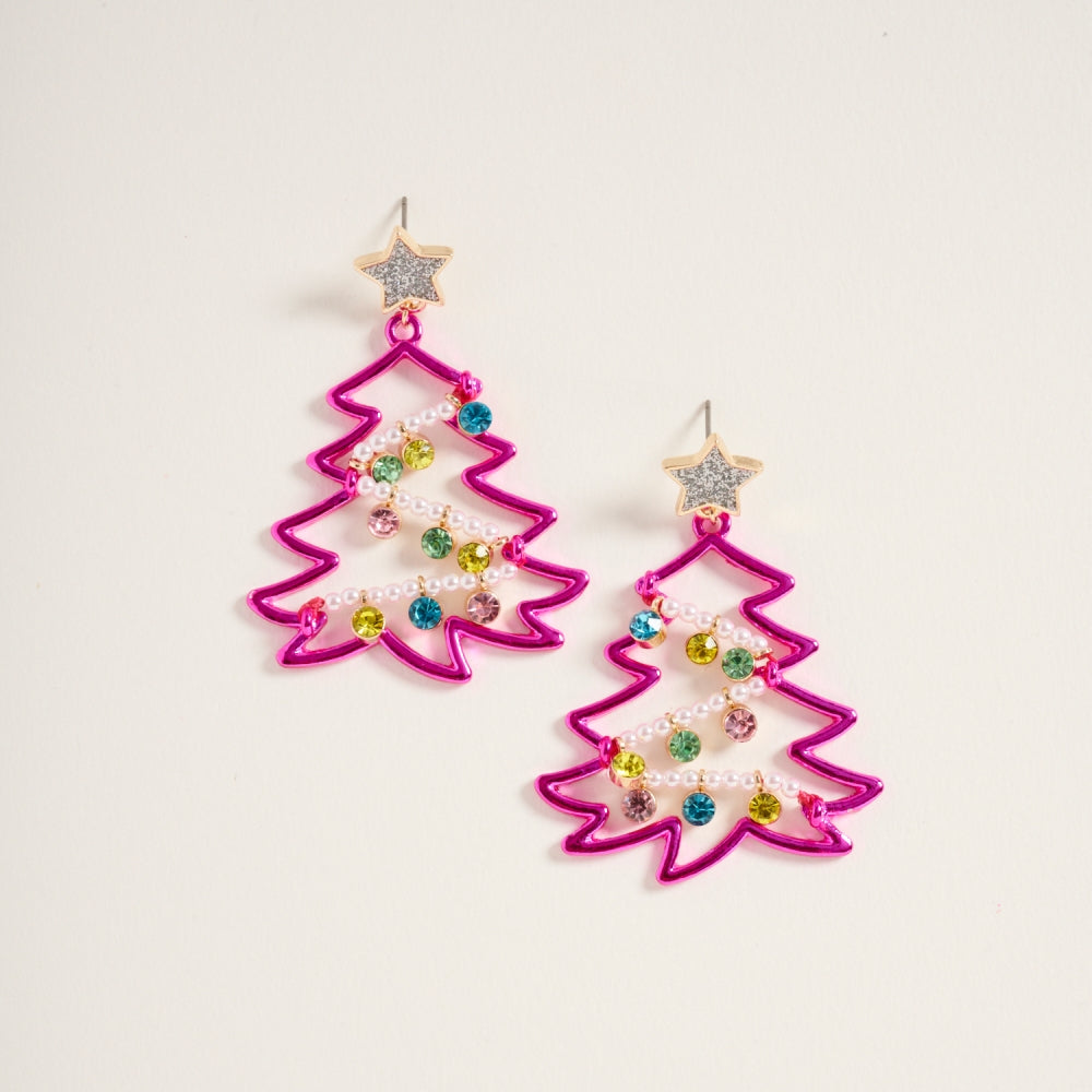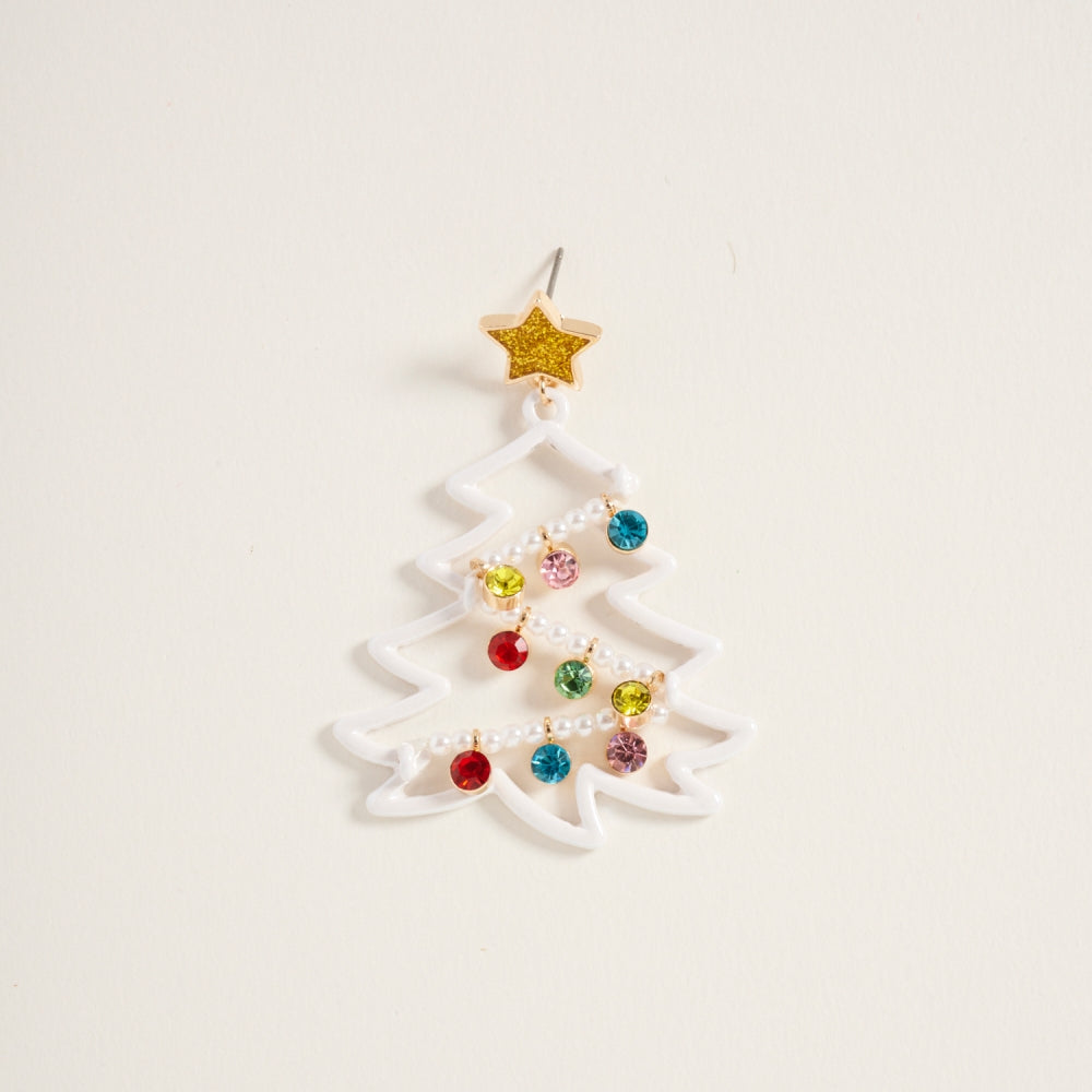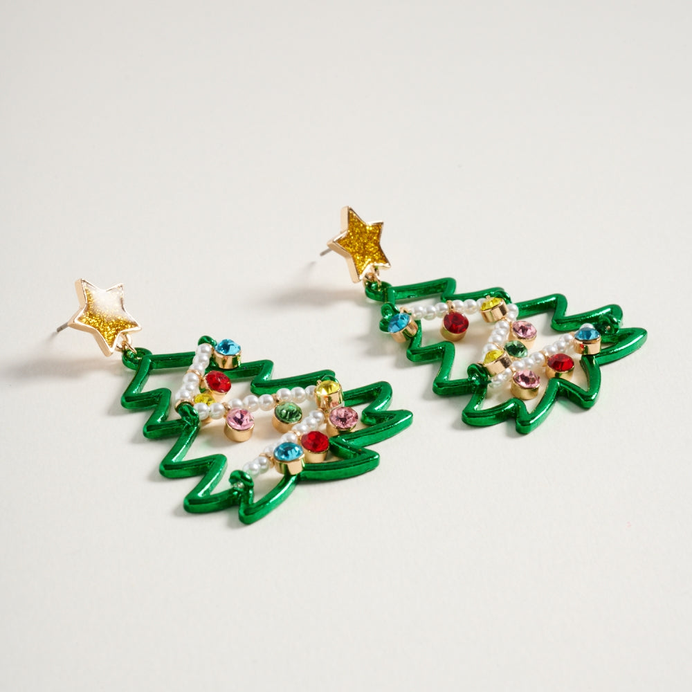 Celebrate the season in style with these shimmering Christmas tree earrings, adorned with glistening rhinestones and a touch of pearl elegance.