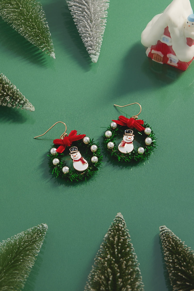 Christmas Snowman with Pearls Wreath Hook Earrings