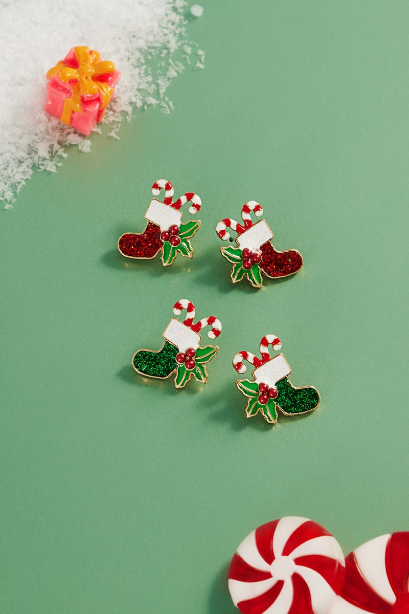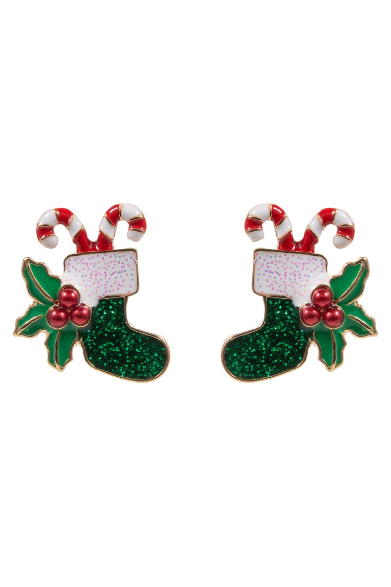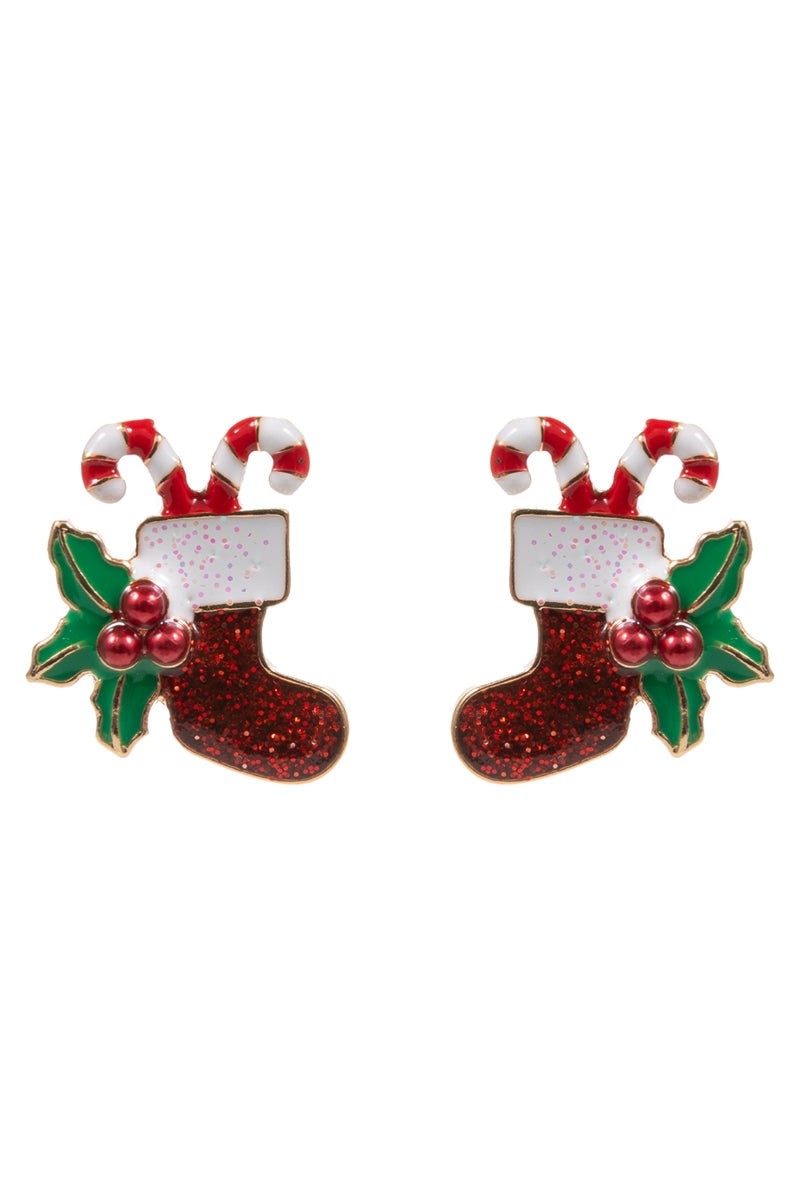 These festive post earrings feature a classic Christmas stocking paired with a candy cane. A cheerful detail for holiday outfits and displays.