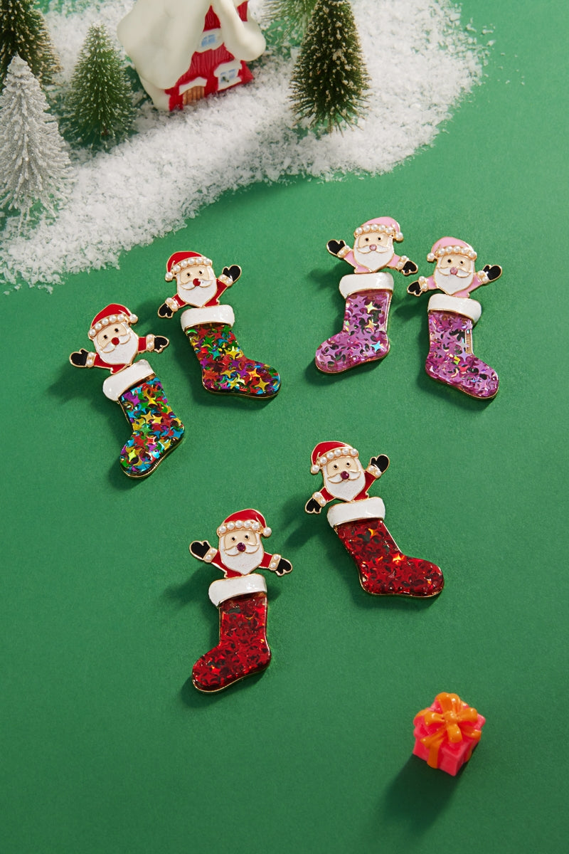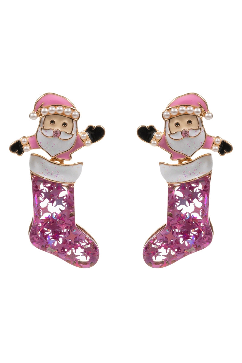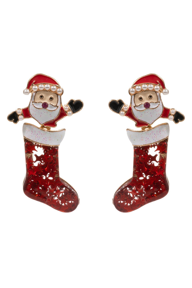 Celebrate the season with pearl post earrings shaped like stockings and topped with Santa charm. A sweet and playful style for winter looks.
