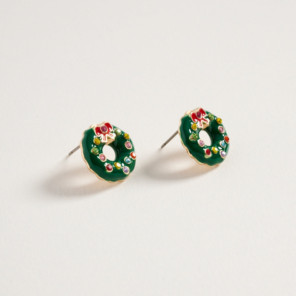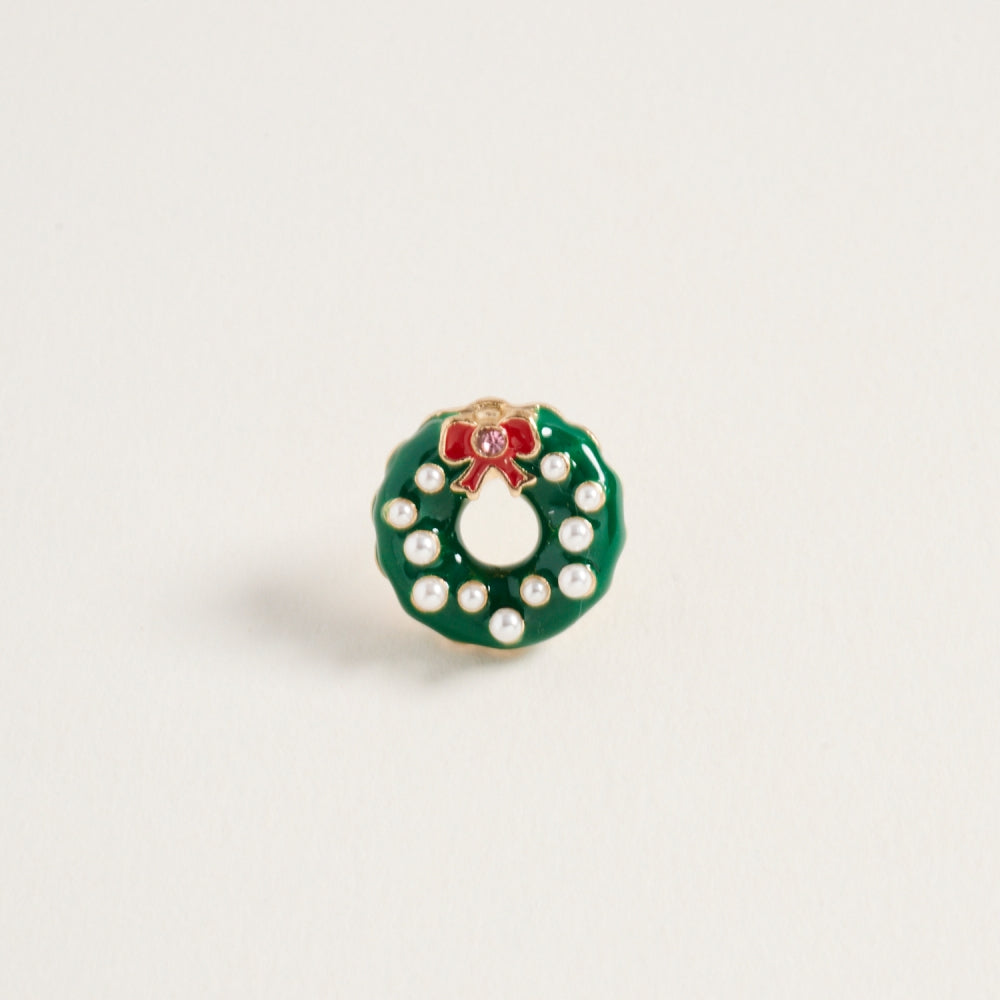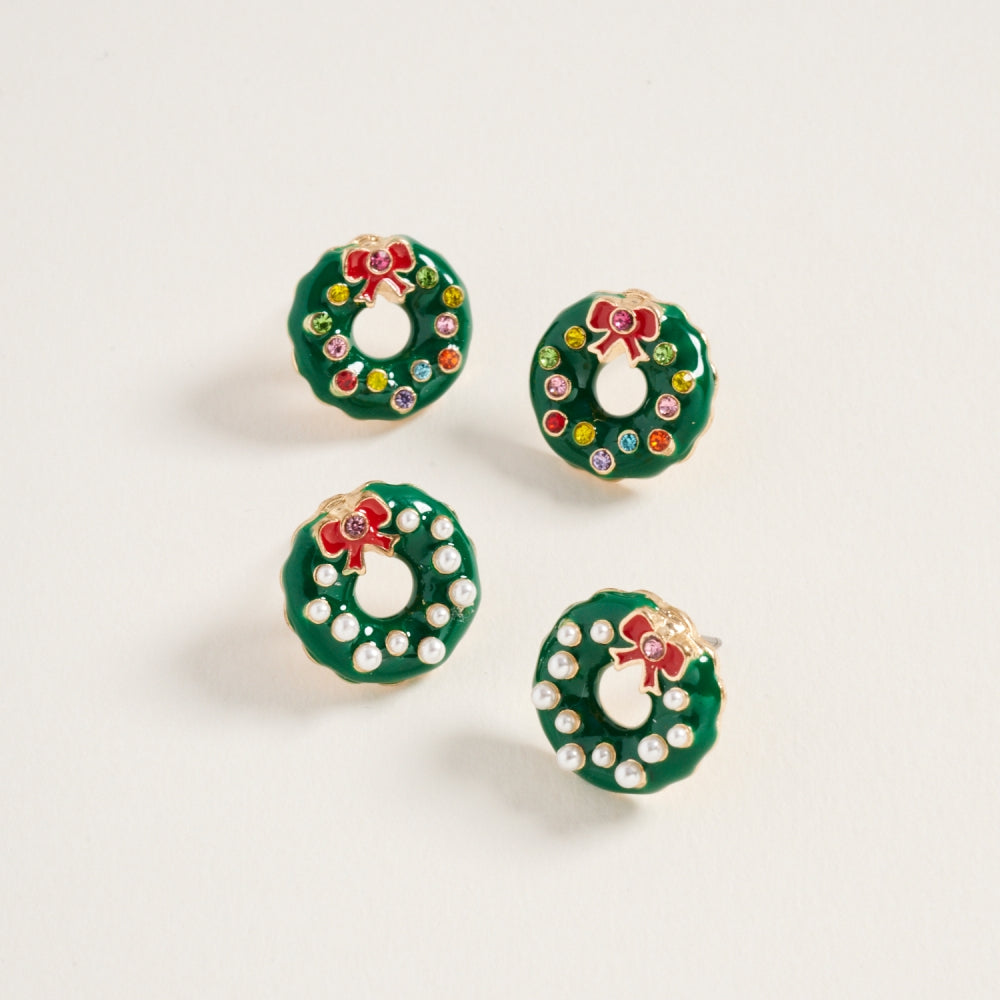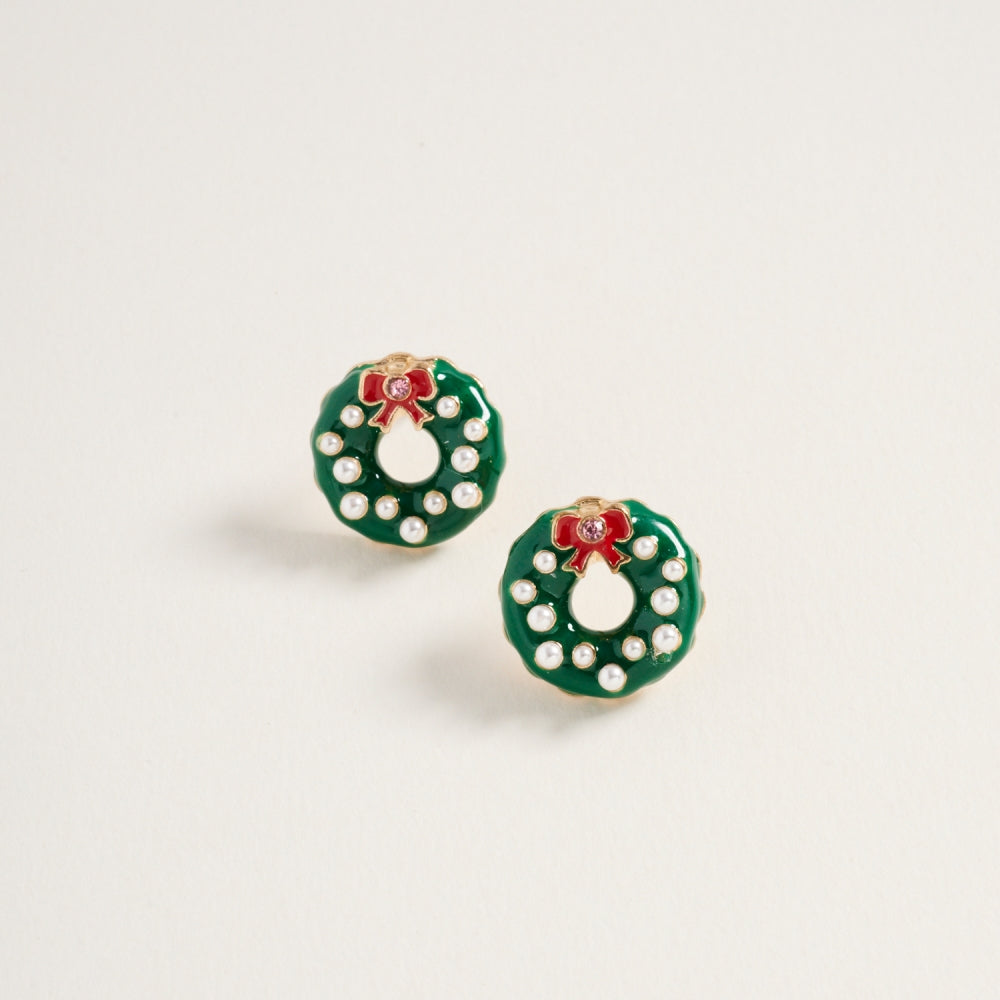 These post earrings bring classic holiday charm with glittering rhinestones and soft pearl details shaped like a festive Christmas wreath.