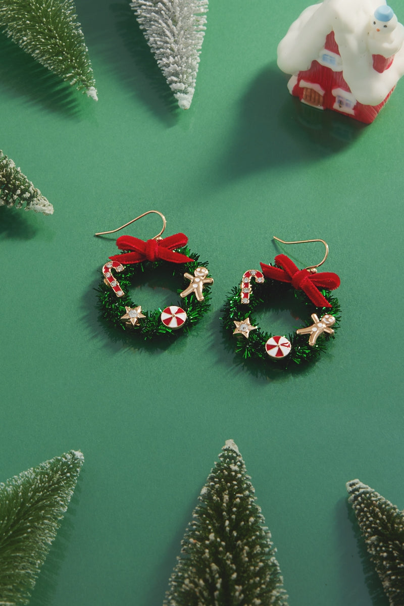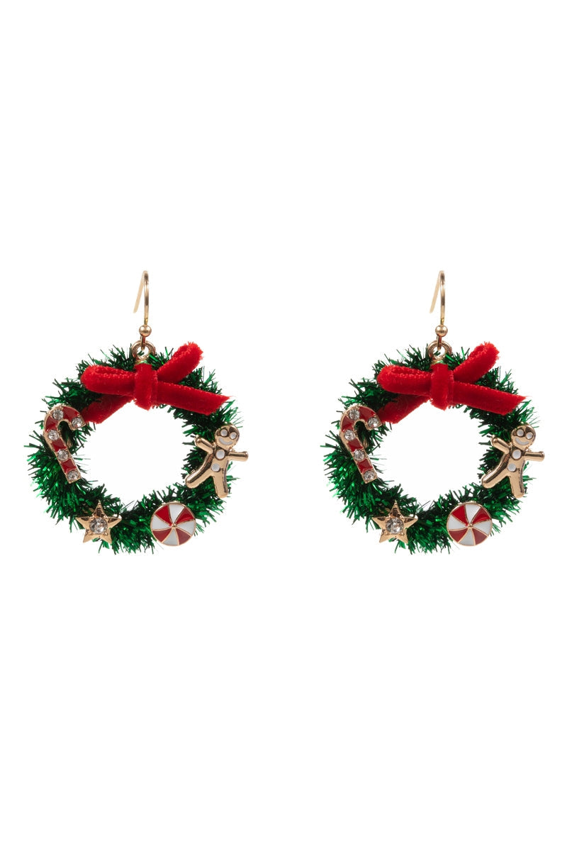 Brighten up your holiday display with Christmas wreath earrings featuring ornament details. A merry must have for winter shoppers.