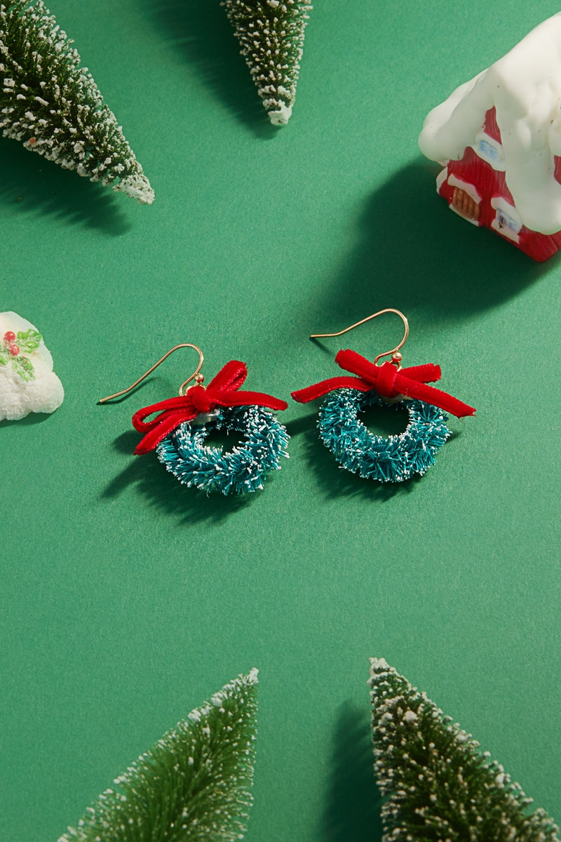 These festive hook earrings feature holiday wreaths topped with classic ribbon details. A cheerful and lightweight accent for seasonal wear.