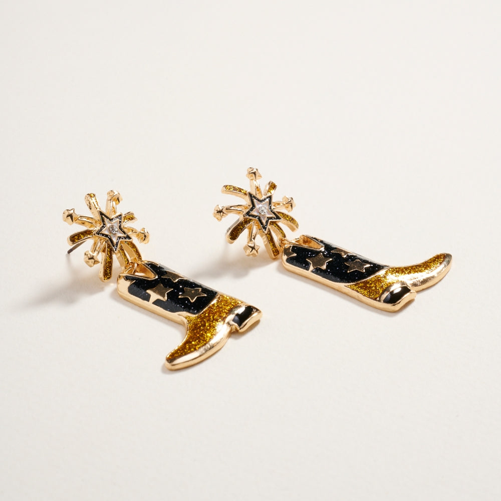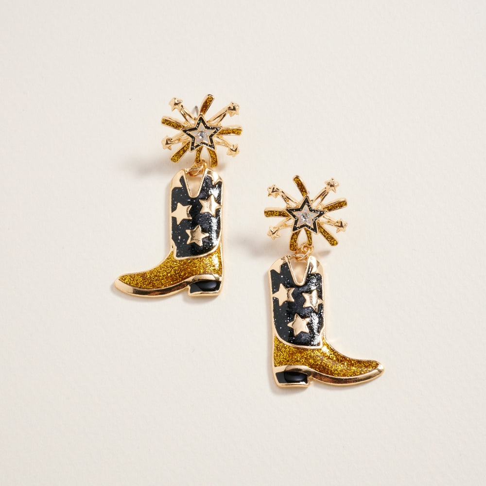 Celebrate with sparkle and western flair. These glitter cowboy boots and rhinestone fireworks earrings are perfect for making a fun statement at festivals or holiday events.