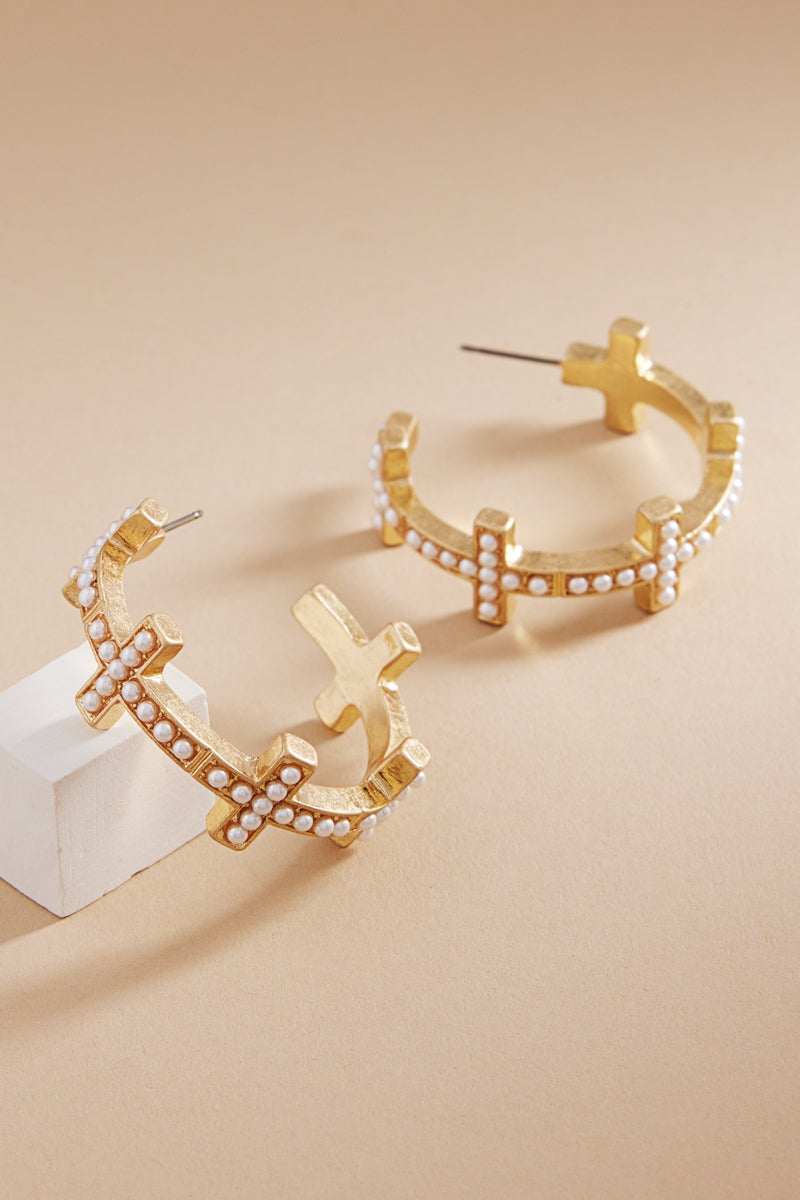 Expertly crafted with hypoallergenic titanium posts, these 1.5 inch cross-shaped pearl paved hoop earrings make a stylish and safe addition to any jewelry collection. With a unique and eye-catching design, these earrings are perfect for adding a touch of elegance to any outfit.