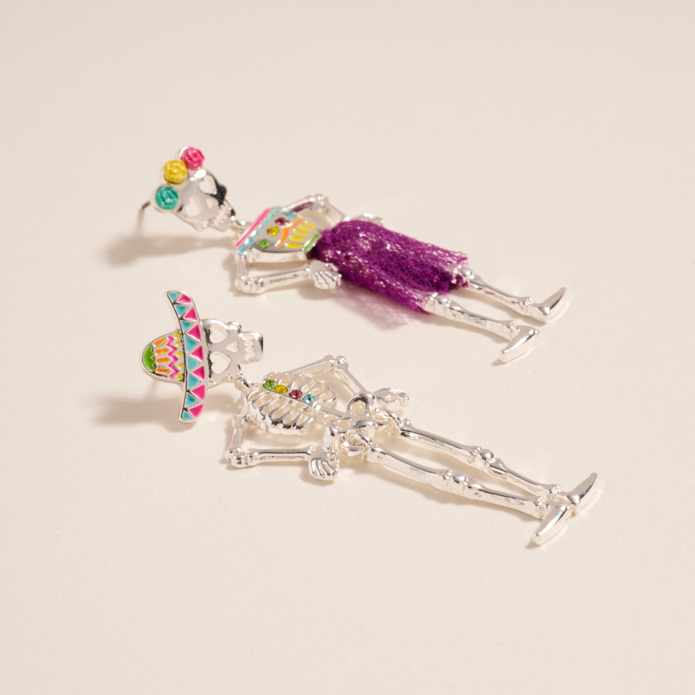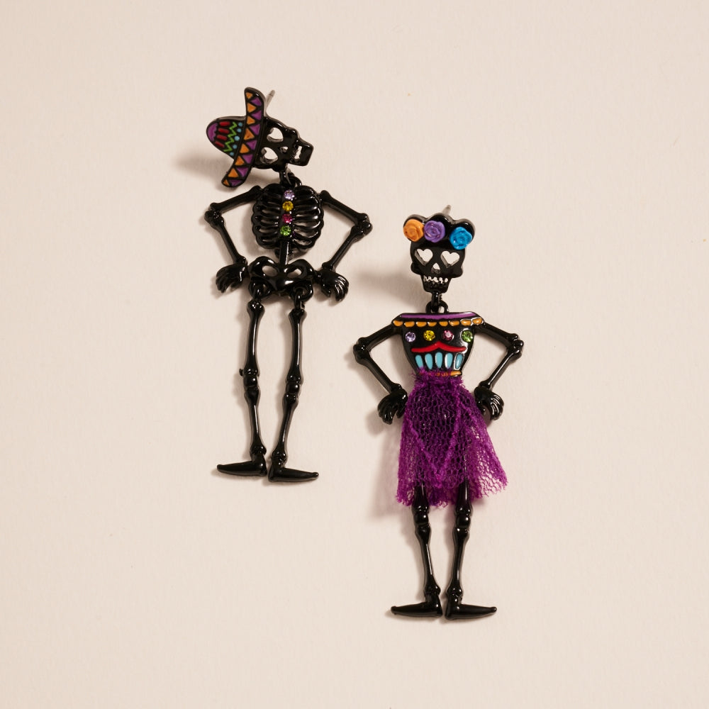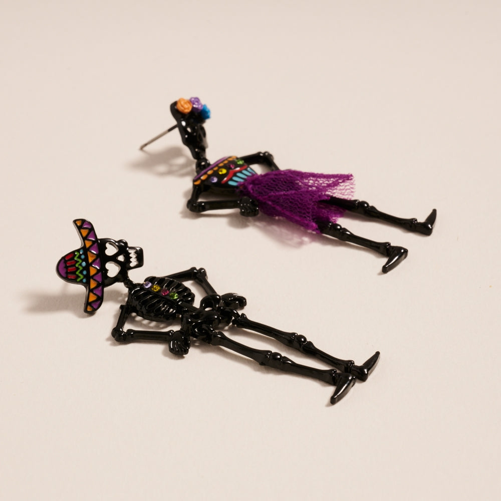 Celebrate the season with these charming Day of the Dead skeleton couple earrings. Bright enamel details and a festive design make them a standout Halloween accessory.