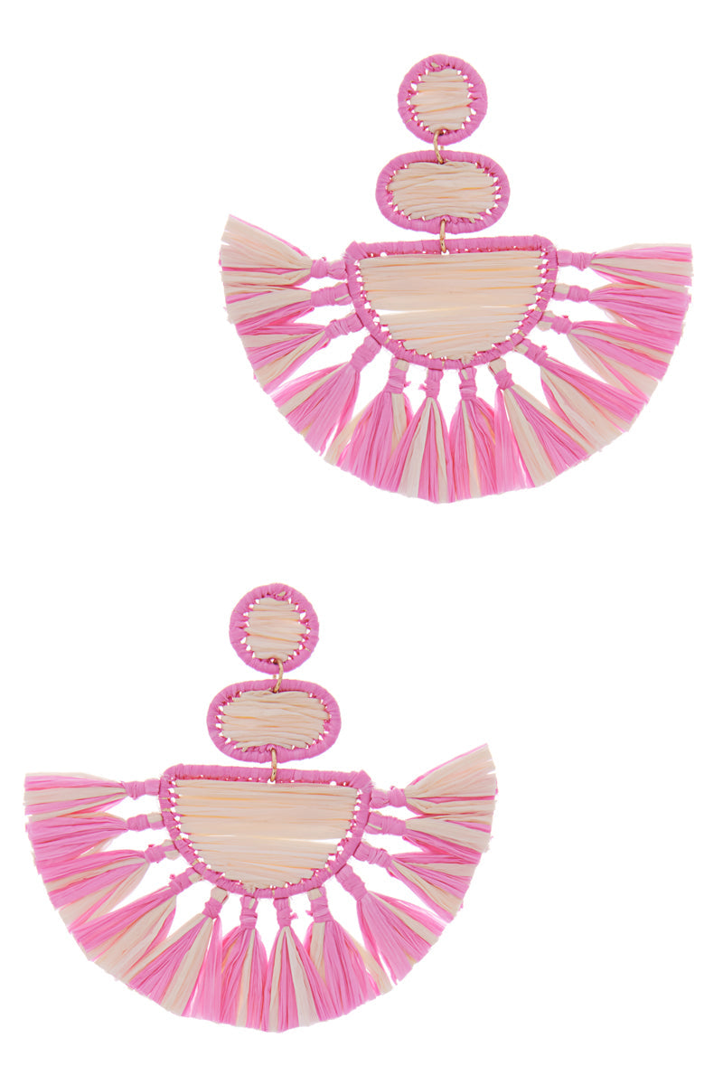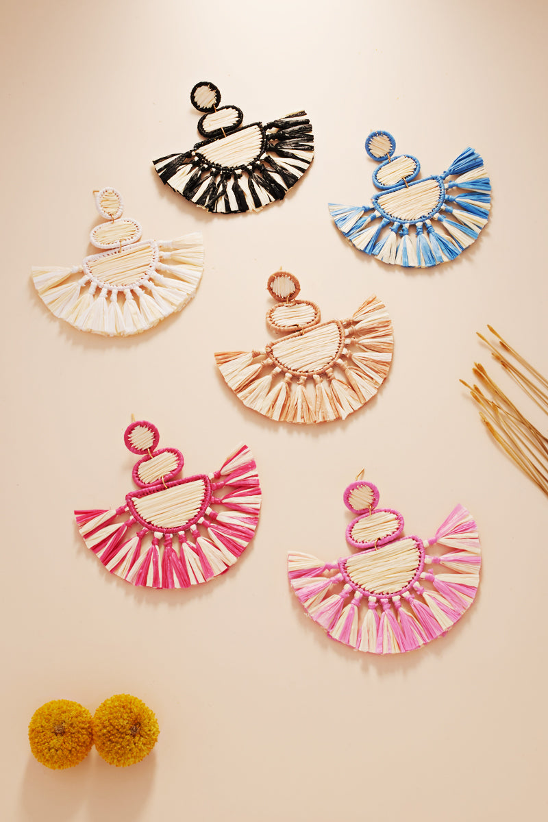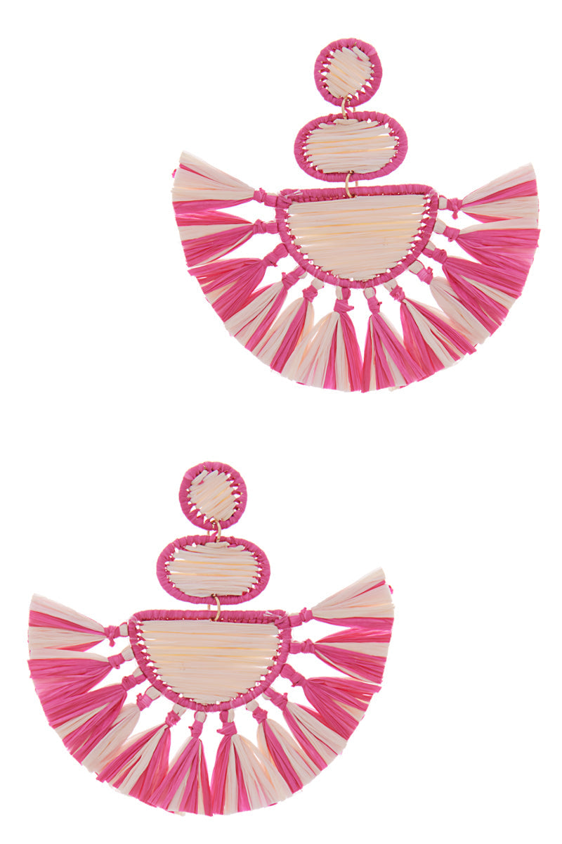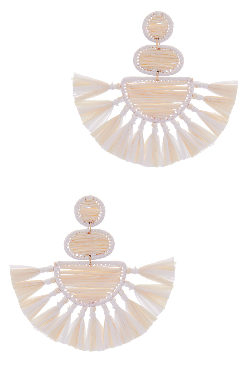 These elegant earrings feature a unique 3.14 inch fan shape made of raffia, giving them a natural and stylish look. The lightweight design is perfect for all-day wear, and the post style ensures a secure fit.