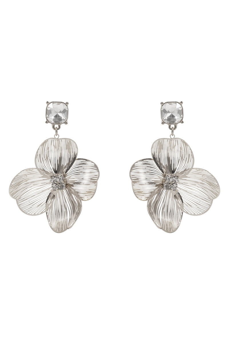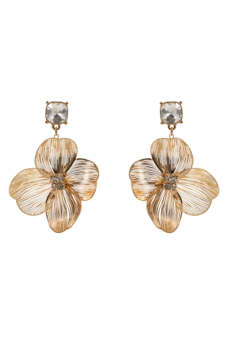 Flower Brass Metal Clear Rhinestone Post Earrings