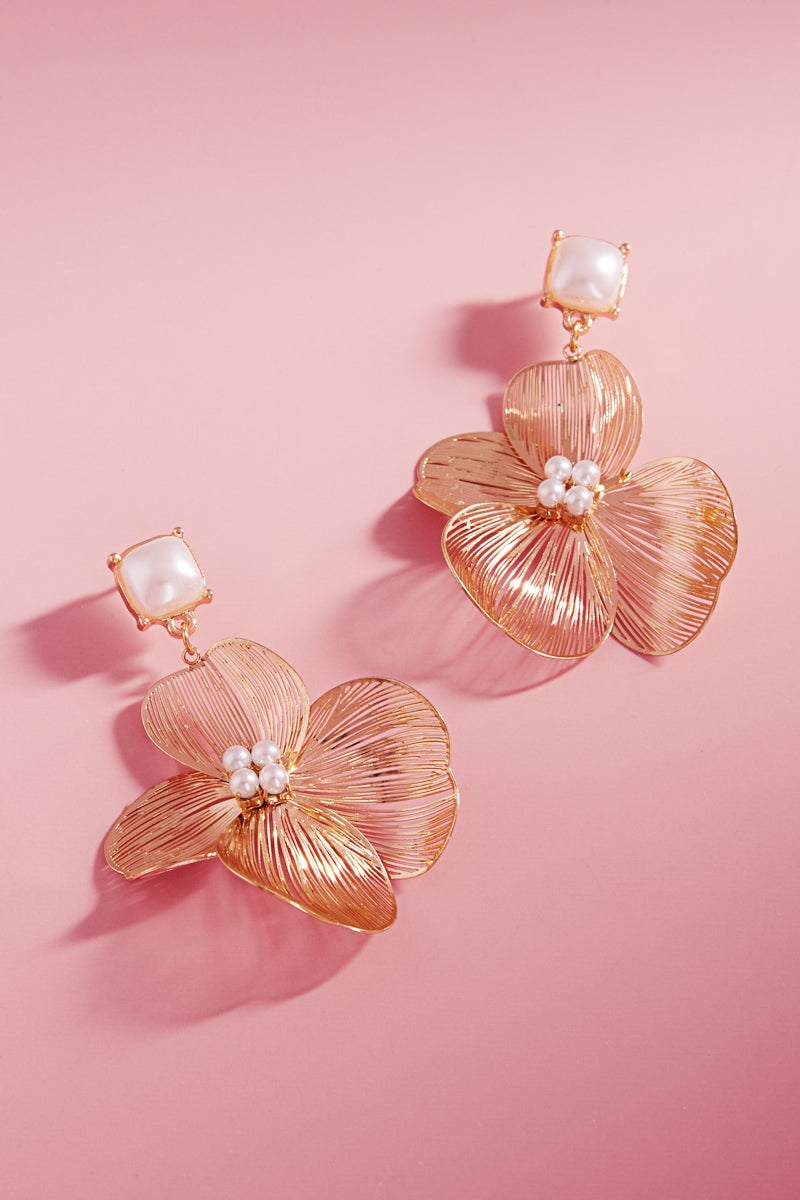 These elegant flower-shaped brass earrings are adorned with sparkling clear rhinestones, perfect for adding a touch of glamour to any outfit. The 2 inch size is just right for making a statement without being overwhelming, and the titanium posts ensure durability for long-lasting wear.