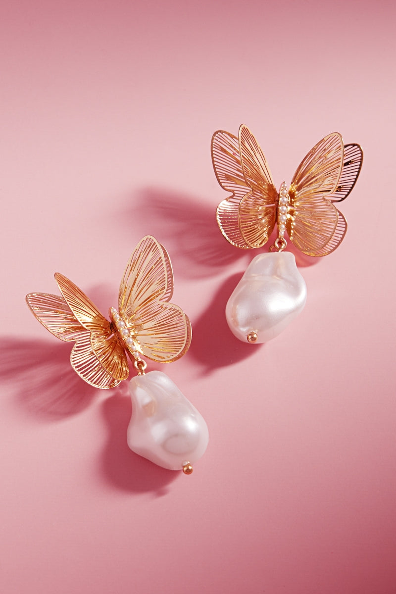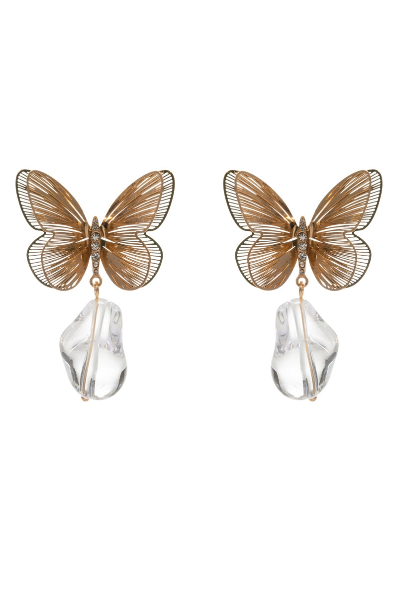 Expertly crafted, these butterfly-shaped earrings feature a 2 inch brass metal design with a clear teardrop titanium post. These earrings are both elegant and durable, providing a unique addition to any outfit. Embrace the beauty and versatility of these stunning earrings.
