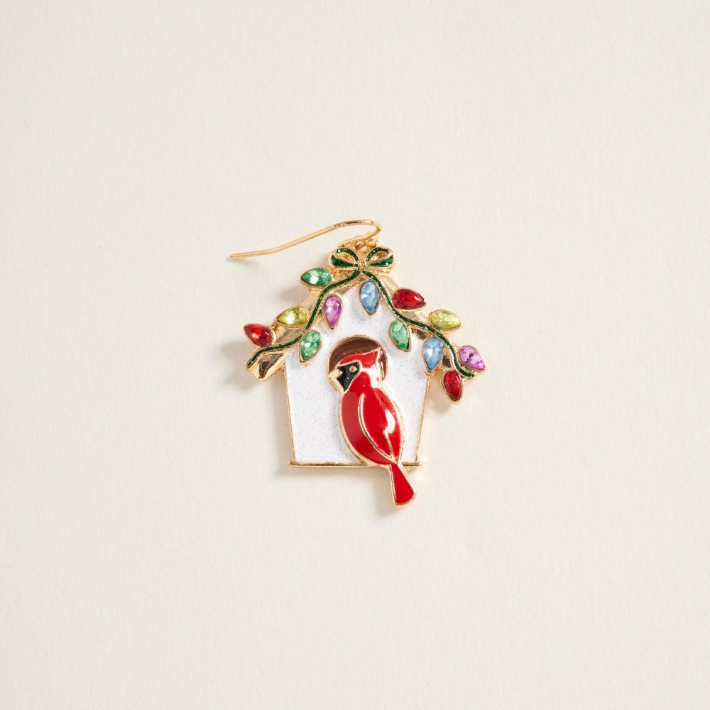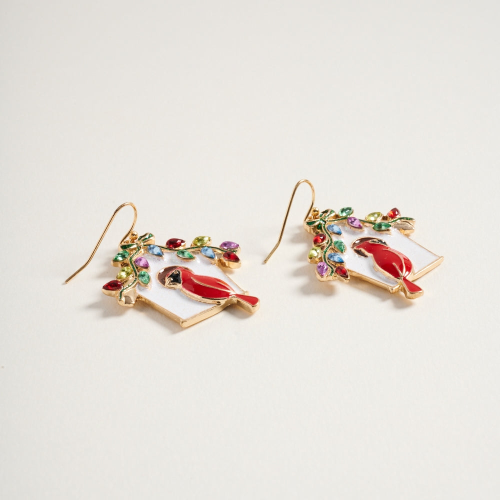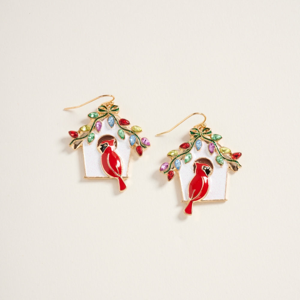 These charming earrings showcase a red cardinal perched on a glittery birdhouse, complete with rhinestone accents for festive flair.