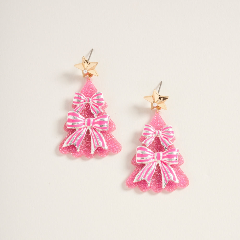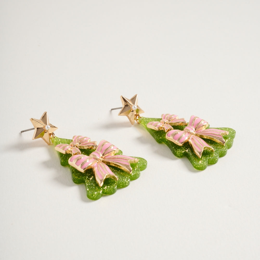 Capture the spirit of Christmas with these sparkling tree earrings, designed with eye-catching glitter and sweet little bows.