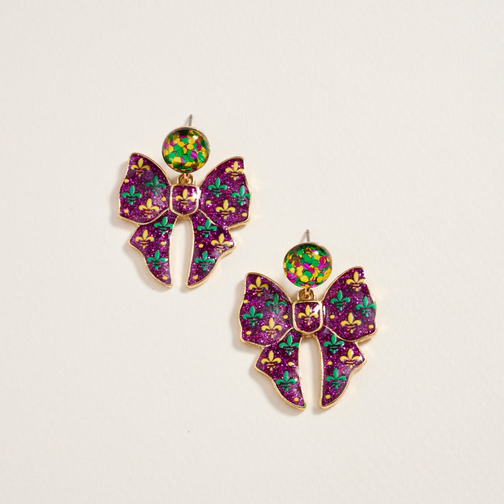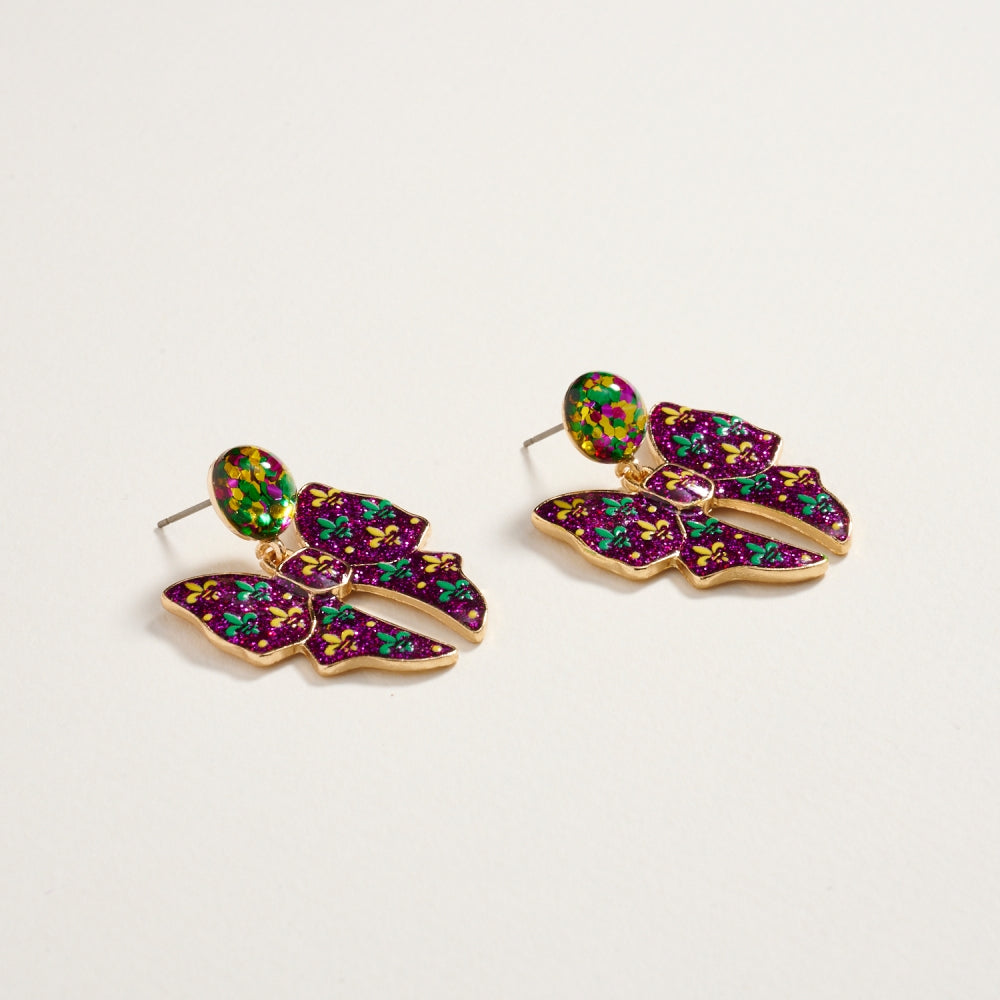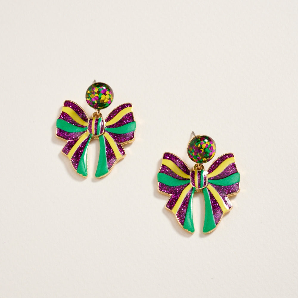 Perfect for Mardi Gras festivities, these ribbon bow post earrings shimmer with festive glitter in traditional purple, green, and gold. A must-have accessory for a vibrant, statement look.