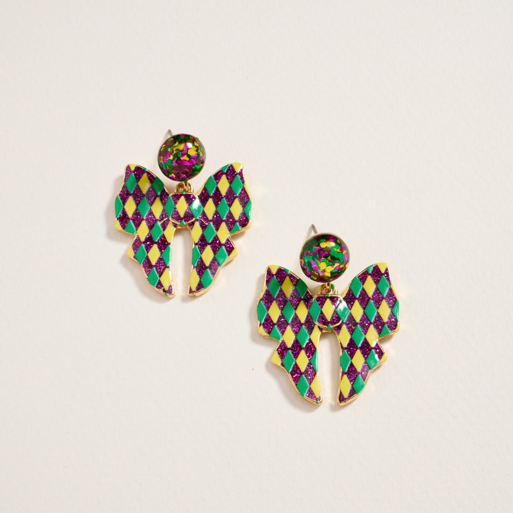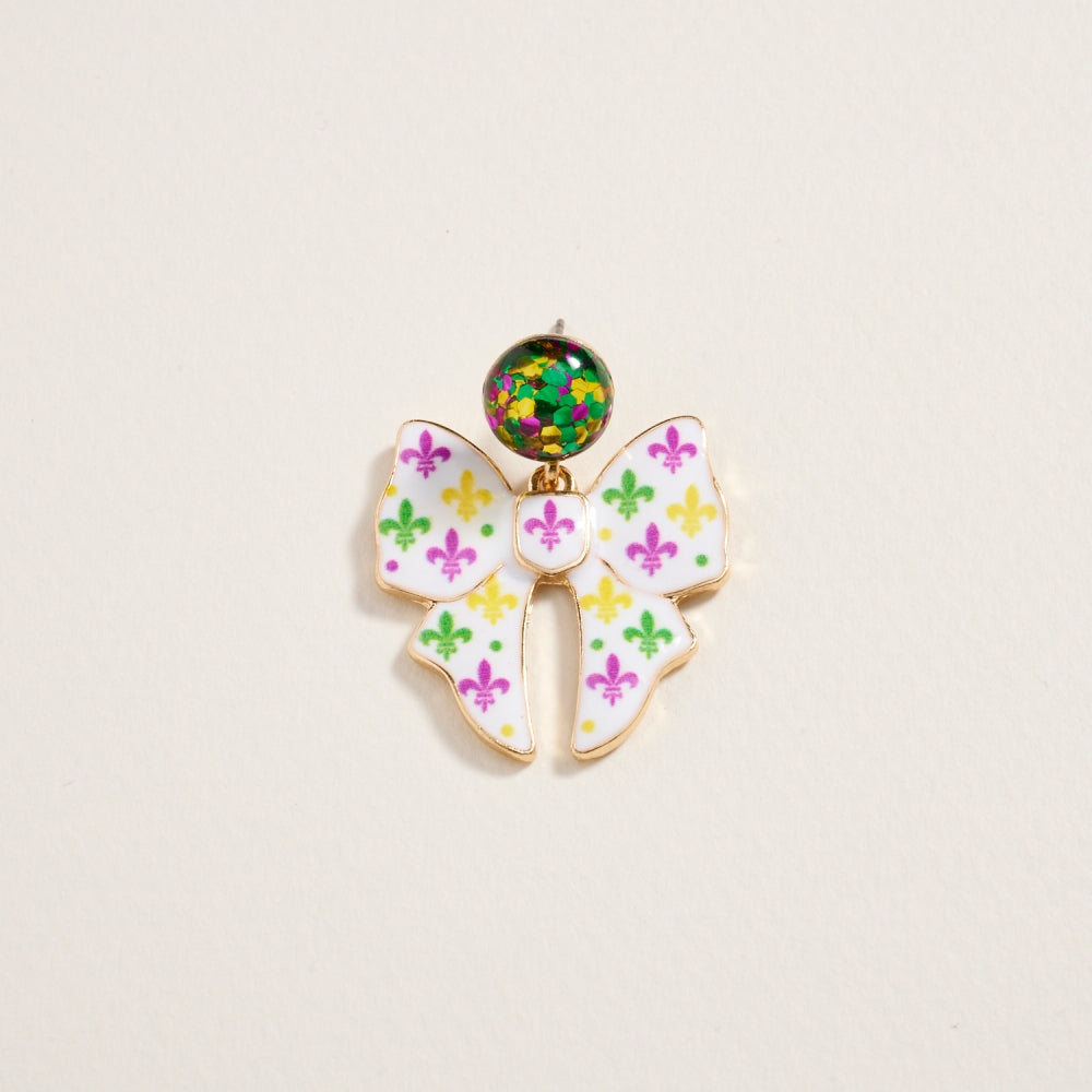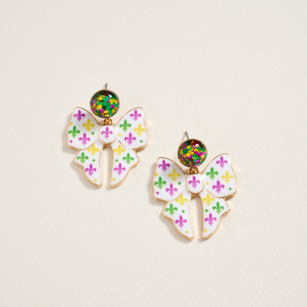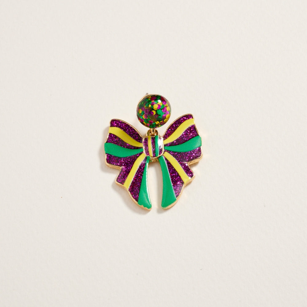Perfect for Mardi Gras festivities, these ribbon bow post earrings shimmer with festive glitter in traditional purple, green, and gold. A must-have accessory for a vibrant, statement look.