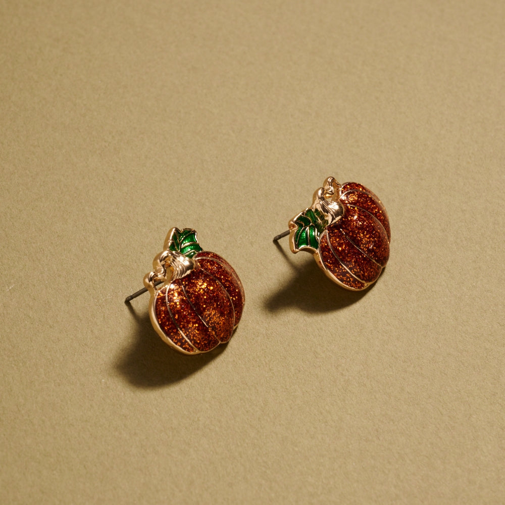 Add a touch of harvest sparkle with these glitter pumpkin earrings. A festive and cheerful choice for Thanksgiving and cozy fall days.